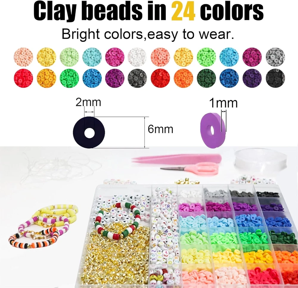 Minimum age: Over 3 years old,Children need to be accompanied by an adult.Clay Beads 6mm in dia. and 1mm thick.Alphabet beads measure 6mm. and 4mm thick.Gold accessories measure approximately 5-6mm.We come with a large variety of accessories, enough to make multiple bracelets as well as necklaces. [What you will get]:-1 box of clay beads in 24 colors, about Total 5600+pcs. It also includes about 240+ letter beads in 26 letters,about 20 Pcs Gold Split Ring,about 10-15 Pcs Lobster Clasp,about 20-30 Pcs Clamshell Beads,30 Pcs Gold Square Beads,30 Pcs Gold Round Beads,30 Pcs Star Beads,about 60 Pcs Heart Beads,about 60 Pcs colorful Smile Beads,1 pair of tweezers.10m transparent elastic string [Perfect Size]: - The polymer clay beads are the right size, about 6mm in diameter, with 2mm holes and 1mm thick.This Clay Beads for Bracelet Making, 24 Colors Flat Preppy Beads for Friendship Bracelet Kit, Polymer Clay Heishi Beads with Charms for Jewelry Making, Crafts Gifts for Teen Girls.You can make bracelets a charm vivid bracelet/ necklace/ earring easily for bracelet jewelry making. [High-quality Material]: - Our clay bead is made of polymer clay heishi beads, non-toxic and lead-free, resistant and waterproof.The beads are lightweight and comfortable to wear, so you can wear them on any occasion such as beach,parties,banquets. [Wide Applications]: - You can use the clay bead kit to make bracelets, necklaces, anklets, earrings, cell phone pendant with your Girls with the clay beads kit for a cheerful family time.And birthdays, Valentine's Day, Mother's Day, Christmas, Thanksgiving Day DIY Gift.In addition,you can also improve hands-on skills and creativity,color cognition,hands-on ability,concentration and patience,create a harmonious and fun family atmosphere,enhance parent-child relationship when doing DIY. [Perfect Gift]:- The clay bead bracelet kit are colorful and with the right size, you can make all kinds of crafts by simply threading the elastic string through the holes of the clay beads and accessories. Different color combinations can present different designs,different letter beads combinations bring different meanings. [Teen Girls Gifts]: - Trendy Stuff: It's time to bring home these trendy gifts to surprise gifts for your teen girls. Our friendship bracelets kit not only enhances their crafts skills but also provides a way to enjoy the fun of sharing and self-expression. It's an excellent crafts gift for their crafts projects party. Product Description The video showcases the product in use. The video guides you through product setup. The video compares multiple products. The video shows the product being unpacked.