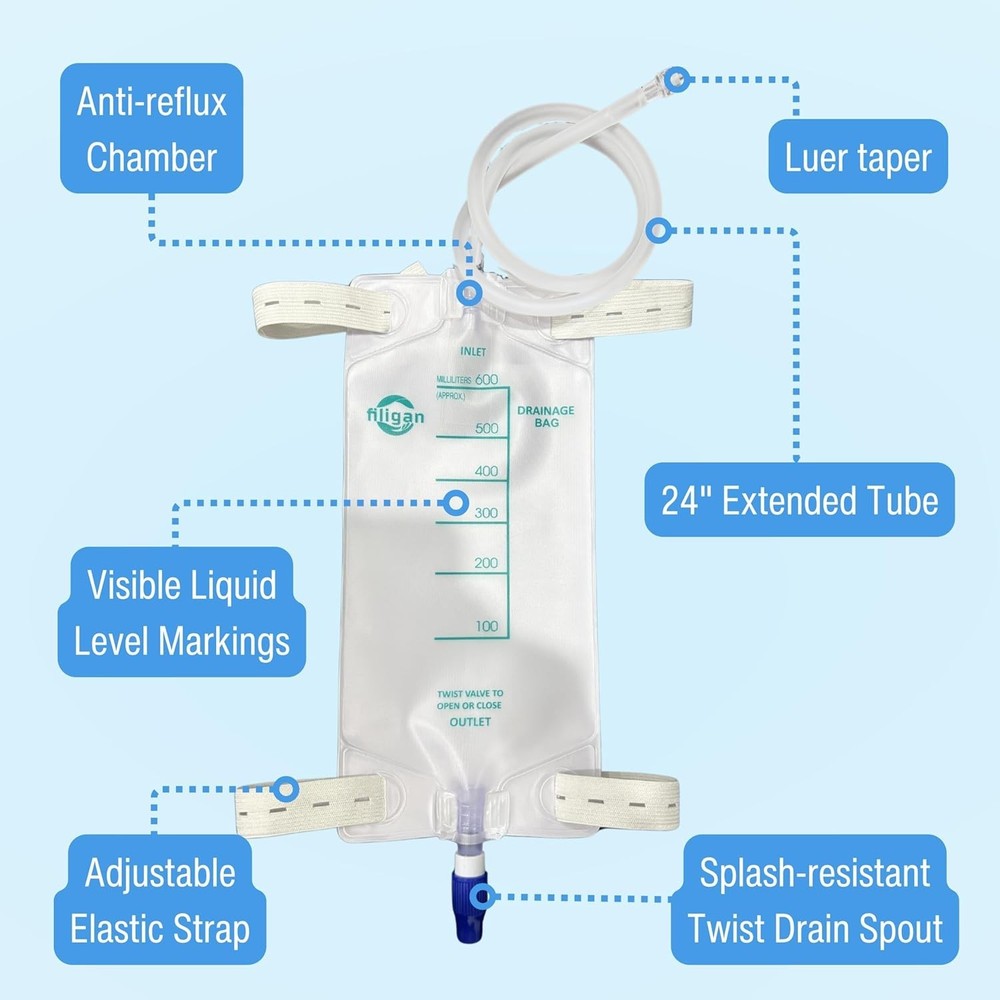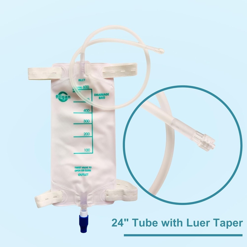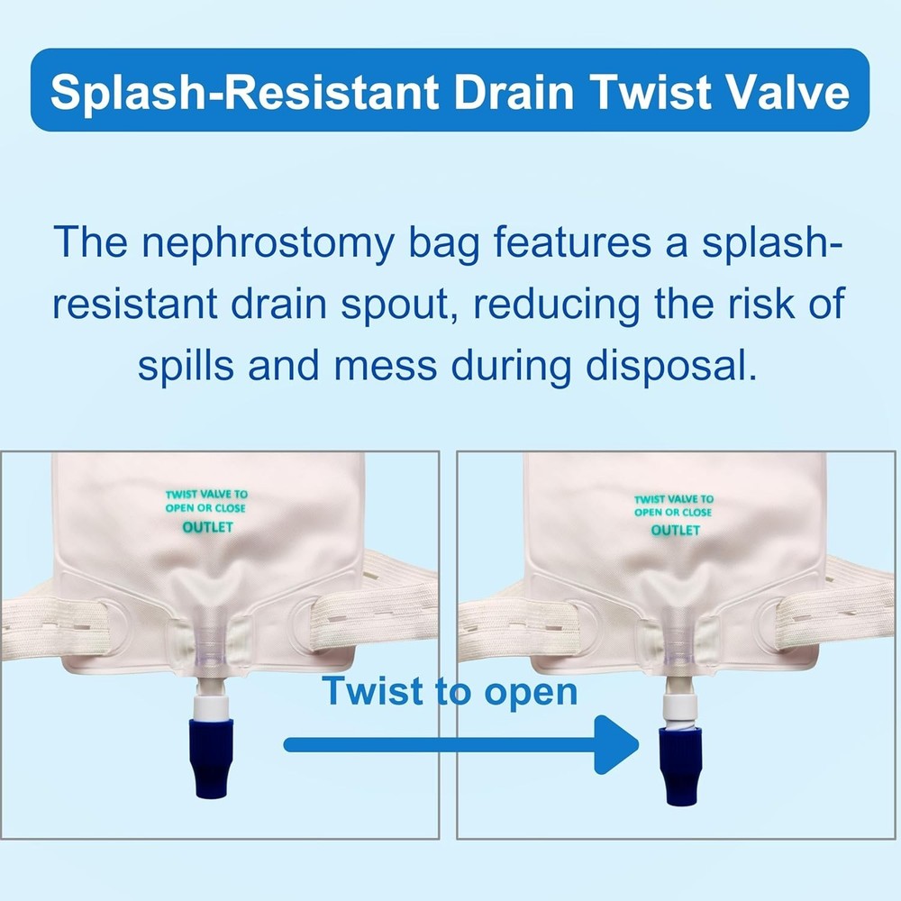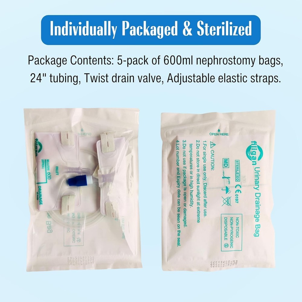 600ml Nephrostomy Bags, Clear Urine Drainage Bag with 24" Silicone Tube, Twist Drain Valve (Pack of 5) About this item 600ml Capacity: Clear, graduated bag for easy fluid volume monitoring and measurement. Twist Drain Valve: Hygienic, controlled drainage with simple one-handed operation. 24-Inch Silicone Tubing (~61cm): Flexible, kink-resistant tubing for patient mobility and comfort. Nephrostomy/Urostomy Use: Designed for post-surgical care, kidney drainage, or chronic urinary conditions. Individually Packaged: Each drainage bag is sterilized for single-use. Product description