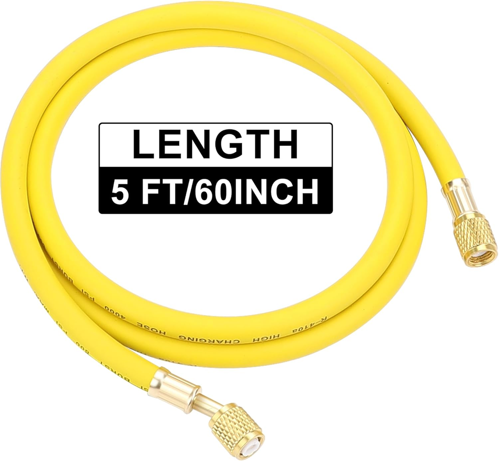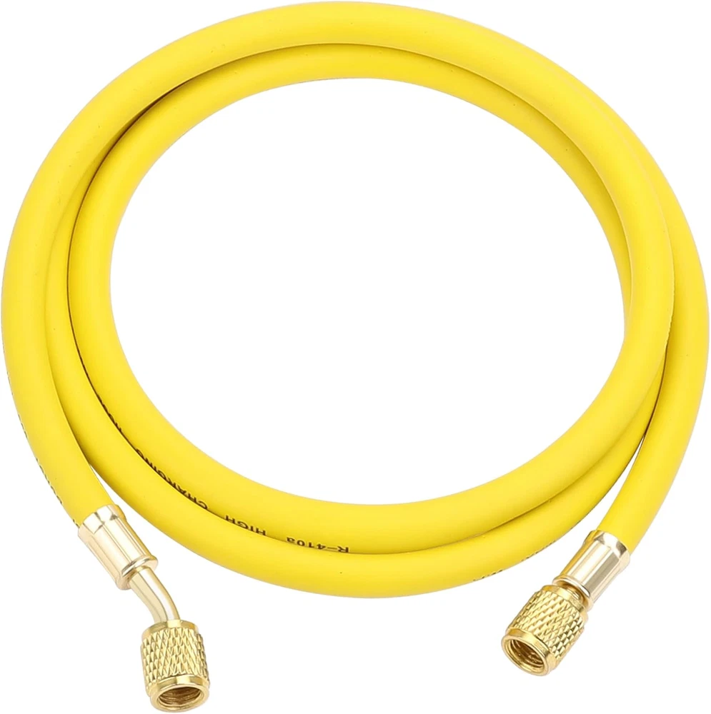 The refrigerant charging hose is a necessary tools for adding refrigerant into air conditioning system during installation and maintenance. Also, it is suitable for many kinds of refrigerant. Whether it is a automotive air conditioner or a room air conditioner, the refrigerant charging hose can work with a good performance. High quality charging hose for all common refrigerants with 1/4" SAE fittings. All hoses are equipped with neoprene seals. The special rubber compound is extremely durable due to its high pressure resistance and low embrittlement. The lifetime of PTFE-gasket compared to ordinary rubber is at least 10 times longer. The brass connector is corrosion-resistant, durable to use and the other brass connector has a 45 degree angle, which make it easier to connect to the air conditioning system. The knurl on the surface of connector can provide a fast and easy connection. Strong six-sided crimp provides a secure, reliable connection between the hose and barb - even at maximum pressure. Product Description High Quality & Service Hromee has professional engineering team that design and collocate with various of automotive tools including tire repair kit, plugs, air hose etc. We also own a factory over 10 years. All products are produced and sent from factory to warehouse directly. AC Refrigerant Hose The refrigerant charging hose is a necessary tools for adding refrigerant into air conditioning system during installation and maintenance. Also, it is suitable for many kinds of refrigerant. Whether it is a automotive air conditioner or a room air conditioner, the refrigerant charging hose can work with a good performance. Color: Yellow Length: 1.5m / 60 Inch Material: Brass, Rubber Burst Pressure: 4000 PSI Working Pressure: 800 PSI Connector Thread Size: 1/4 SAE Rubber Material The special rubber compound is extremely durable due to its high pressure resistance and low embrittlement. The lifetime of PTFE-gasket compared to ordinary rubber is at least 10 times longer.