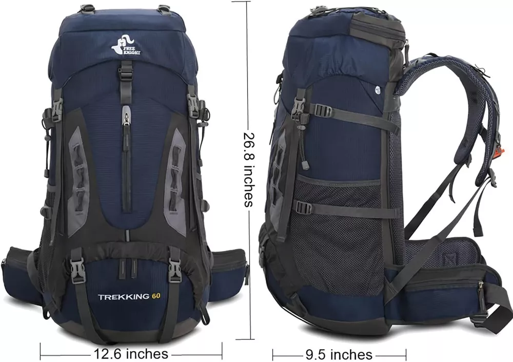Color: Navy Blue Comfortable Daypack: This climbing backpack is specially designed for travelling enthusiasts, ergonomic padded shoulder straps and back support, gives you more comfortable feeling. Breathable mesh shoulder straps with plenty of sponge padding help relieve the stress from your shoulder. Widened and thickened S-type shoulder straps and high elastic, breathable back panel for best ventilation and load distribution. And this pack has no internal or external frame. Large Capacity & Multiple Compartment: Large capacity with a spacious main compartment and multiple pockets provide enough room for 3 or 4 day trips. Special main compartment drawstring closure design to prevent items from falling out of the backpack. With an inner pouch for a water bladder, two side pockets to carry extra water bottles. Separate shoe storage pouch to prevent items inside the backpack from getting dirty, convenient and practical. Meets most airline size requirements. With 8 Adjustable Straps: for tying up your backpack or hanging your sleeping bag, mat, hammock, tripod and other gear, practical for hiking, climbing, camping enthusiasts. Reflective stripes make it easier to identify at night, making it safer to travel. Water-resistant: Made of high-quality and safe material, it is durable for long-time use. The nylon fabric material made of High-quality ripstop polyester material, is water-resistant and tear-resistant. There is also an extra rain cover included in the bottom pouch to prevent the water and dust from getting into the backpack, protecting your valuables from heavy rain and keeping everything dry. Lightweight backpack for outdoor, Ultralight, only 2.4 lbs for a large 60L capacity, reducing the weight of the backpack so you can carry more other items. The maximum load bearing capacity is 33 lbs. Unfolded size: 68 x 32 x 24 cm / 26.7 x 12.6 x 9.5 inches. Product Dimensions 9.5 x 12.6 x 26.7 inches Item Weight 2.43 pounds Department unisex-adult Country of Origin China Item model number 0397 Age Range Description Adult Item Weight 1100 Grams Number Of Items 1 Units 1 Count Capacity Total 60 Liters