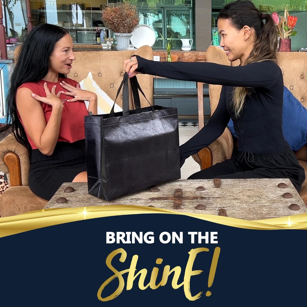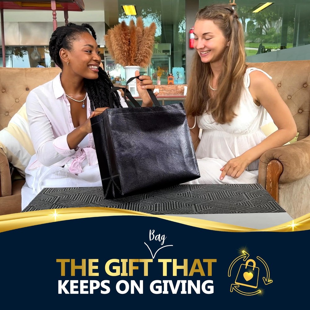 What makes bags different? TAILORED FOR SMALL BUSINESSES: our eco-friendly 60-pack option delivers the same high-quality reusable BLACK gift bags in a larger, more economical pack size, catering to the demand for sustainable gift bags in bulk. BRING ON THE SHINE – Featuring a stunning laser surface our black gift bags with handles create beautiful reflections under different light conditions and are perfect as birthday bags, gift bags for women, welcome bags, wedding gift bags, party bags, etc. REINFORCED BOTTOM – Each of the 13(W)x 5(D)x11"(H) large black gift bags comes with a cardboard insert to prevent the bottom of the bag from curving and maintain the tote bag shape even when the bag is empty. GO PAPERLESS – Our shiny reusable black gift bags are made from Polypropylene ( the same material reusable bags in the supermarkets and stores are made from) , these are not your generic old paper gift bags but a new breed of party gift bags designed for those who seek to combine glam and sustainability. PLANET FIRST GIFTING - In our commitment to lessen our environmental footprint, we've partnered with renowned non-profit Climate Partner. By dedicating 10% of profits, we offset all carbon emissions associated with the full life cycle of our products.