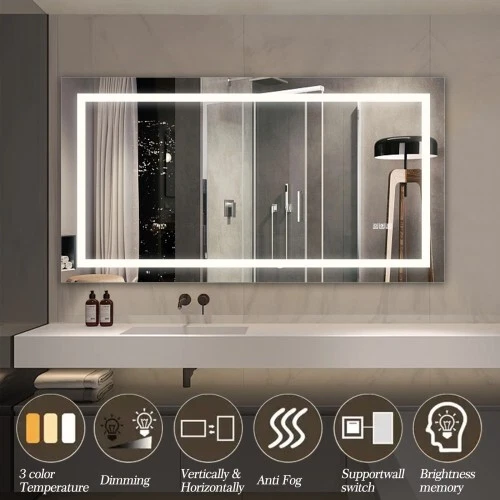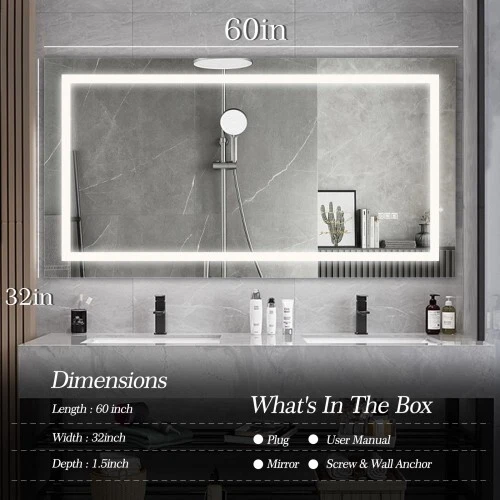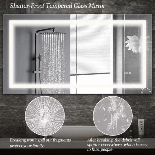Description Lights & Super Bright:- With built-in LED strip lights, LED lighted bathroom mirror gives out the lighting. The lighting mirrors are bright enough for makeup or shave or beauty care. Shatterproof & Corrosion Proof:- Our mirror is made from stronger glass, that is armored glass. It will not get broken easily. Even it is broken, it will not shatter to piece, no harm, more safe to use. With epoxy coat, this mirror is corrosion proof. It will not get corroded after 30days acid test. Colors Changeable and Brightness Dimmable:- This LED illuminated mirror is multifunctional. You can press the button to change the color temperatures: Warm(3000K), natural (4200K) and white(6400K). You can also dim the bright to your comfortable level. All these will be easily controlled by the touch button. The smart memory function will record the lighting setting and keep the previous lighting status after turning off and on. Easy to Install and Powered by Hard Wire Features Lights & Super Bright Colors Changeable and Brightness Dimmable Easy to Install and Powered by Hard Wire