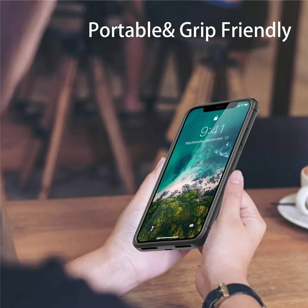 1.This battery case is specially designed for iPhone, compatible for Apple Lightning Headphones, excellent for enjoying music or making phone call while your phone is charging. The powerful 5000mAh built-in li-thium polymer battery can provide extra battery life for your phone. Built-in short circuit and overcharge protection. 2.Magnetic top design, much easier to install/remove your phone from case. No excessive bulk at the bottom of your phone making it easier to hold and reach the upper part of the screen, it is convenient enough to fit easily in your hand or in your pocket. 3.Charge and sync your mobile phone to computer without removing it from the charging case, compatible for original lightning charging cable. Built-in intelligent control chip, which can charge your phone fullly first, then it will charge the battery case automatically. (Please turn on the case during charging) 4.Integrated Power Switch allows you to switch the battery case on & off, use the battery only when you need it. 4 LED battery level indicator that lets you know exactly how much power left. (0--25%--50%--75%--100%) About this Battery Case: Slim, lightweight and compact design for portability. High capaticy rechargeable battery provides battery life when needed. Indicate with 4 level indicate light to let you know how much power left . Precise cutout allow easy access to all ports, switches and buttons. Can be used for data transfer, charger and data sync at the same time Safety with highest industry regulatory certificates: CE, RoHS, and FCC. Package included: 1 x iPhone Battery Case 1 x user manual