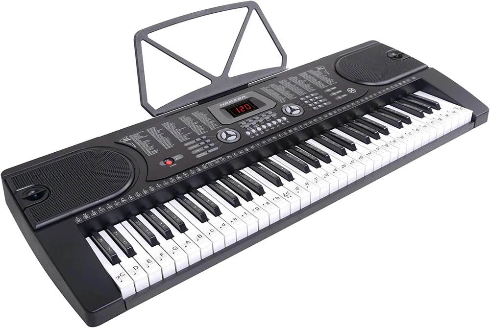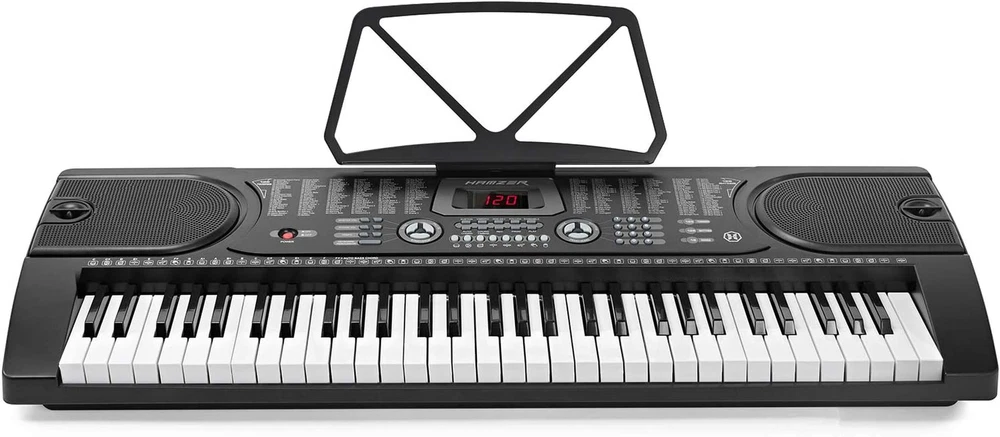 61-Key Digital Music Piano Keyboard - Portable Electronic Musical Instrument Built-in speakers offer tremendous sound, complete with 255 Timbres, 255 rhythms, 61 keyboard percussions, and 24 demonstration songs. Designed for beginner to intermediate-level use, this multi-function keyboard piano features 61 keys, providing a traditional piano or organ feel for versatile learning and an exciting acoustic experience. Keyboard comes with a complete set of transparent stickers to label the piano keys in order to simplify and accelerate piano mastery. Ideally suited to master finger control, this portable piano keyboard allows for play with the capacity to select chord timbre, program/edit rhythm, as well as utilize effects such as vibrato, sustain, & ensemble. Additional features include rhythm sync and fill-in, tempo adjustment, accompanying volume, and a master volume control.Belt out in song or discreetly practice on headphones, along with the option to record and playback for improved performance. Includes microphone with a 4' cord, audio input, output, and headphone jack. Ready-to-use right out of the box, just power with 6 AA batteries (not included) and take this compact, lightweight musical keyboard on the road or to lessons, or plug the US-standard DC 9V/AC adapter into the wall for extended play sessions. Combining premium, professional-grade features with a user-friendly design, this digital piano electronic music keyboard offers endless versatility to develop and sharpen skills, or just enjoy hours of pure entertainment with friends and family. Learn to play songs quickly with the built-in recorder with playback assists with improving playing skills, vocals, and technique. Compact enough for travel but with keys that boast impactful sound, this multi-function keyboard piano provides an enjoyable musical experience that will engage both beginners and intermediate players. Includes: 61-Key Electronic Keyboard Piano, Sheet Music Stand, Microphone, DC 9V/AC Power Adaptor, and Owner's Manual (Tablet NOT included) Keyboard Specifications: Overall Dimensions: 33.5" Long x 13" Wide x 4" High Weight: 7 pounds Key Size: 1.9mm 13.0 inches x 33.5 inches x 4.0 inches. Weight: 7.0 lb Proficiency Level Beginner, Intermediate Power Source Corded Electric, Battery Powered Number of Keyboard Keys 61 Special Feature Portable Product Dimensions 33.5 x 13 x 4 inches Item Weight 7 pounds Color Black Batteries 6 AA batteries required. Skill Level Beginner, Intermediate Color Name Black Battery type Alkaline Is Discontinued By Manufacturer No