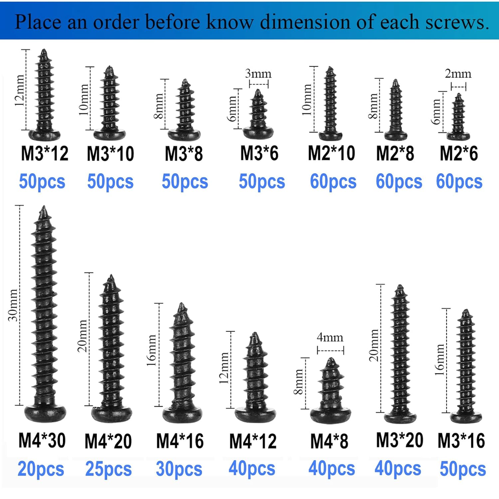 Store New Arrivals Add to Favorite View Feedback Contact 625Pcs M2 M3 M4 Phillips Pan Head Self-Tapping Wood Screws,14 Sizes Cross Recessed round Head Self Tapper Screws Assortment Kit for Wood,Plastic and Soft Metal,Black Carbon Steel,Sharp Point Description Fastener Type Round Color Black:625Pcs Pan Head M2-M3-M4 Material Carbon Steel Country of Origin China Size M2 M3 M4 Package Dimensions 6.73 x 3.9 x 0.83 inches; 0.04 ounces 🔩 【625 Pcs & 14 Types Screws】 :Pan Head Wood Screws Kits includes 14 sizes, them contains M2 x 6mm/8mm/10mm;M3 x 6mm/8mm/10mm/12mm/16mm/20mm; M4 x 8mm/12mm/16mm/20mm/30mm screws, meet all your demands, a must for your home life. 🔩 【Material & Workmanship】 :Self Tapping Wood Screws are made from high quality Carbon steel known for its dependable and rigid strength as well as its corrosion resistant quality. The screw thread is very sharp and sturdy. 🔩 【Advantage】 :Pan head self-tapping screw with deep thread design and Sharp Tip is durable and sturdy,Good holding power achieve the effect of connecting and fastening.If the material of the panel is very hard, please pre-drill appropriate holes before using 🔩 【Widely used】 :Carbon Steel Wood Screws Assortment are used in using in electronic repairs such as wood furniture,laptops, computers, cell phones,clocks,small appliances etc. These screws commonly have a sharp point that helps penetrate the material.When you are mad for the missing screws, it is a perfect friend for you. 🔩 【Storage Box & Mark Label】 :Comes with a clear box for easy storage. And the label stuck to the lid will indicate the model of the screws, thus ensuring a convenient searching for different kinds of screws while repairing. Product Description At HanTof. our vision is to ensure that customers can use our products to maintain and create their dreams. Our customers can build and maintain high-quality products to ensure longevity and strength. HanTof 625pcs 14 Sizes M2 M3 M4 Cross Recessed Pan Head Self-Tapping Screws Assortment Kit,Black Carbon Steel Size and Quantity Features; Standard cross recessed pan head screw, smooth and complete, stressed uniformly, can be rapidly screwed in with suitable tools. These screws commonly have a sharp point that helps penetrate the material.Mainly used for non-metallic or soft metal, it doesn't need to install hole, directly use Pan head self-tapping screw to rotate into the product without use nut to cooperate. HanTof Self Tapping Screws are known for their effecient application performance and endurance widely used in a variety of industries such as construction, manufacturing, engineering, assembling and so on. Package Include; M2 * 6mm------------60 PCS; M2 * 8mm------------60 PCS; M2 * 10mm------------60 PCS M3 * 6mm------------50 PCS; M3 * 8mm------------50 PCS; M3 * 10mm------------50 PCS M3 * 12mm------------50 PCS; M3 * 16mm------------50 PCS; M3 * 20mm------------40 PCS M4 * 8mm------------40 PCS; M4 * 12mm------------40 PCS; M4 * 16mm------------30 PCS; M4 * 20mm------------25PCS; M4 * 30mm------------20 PCS Attention: Products contain small parts, keep away from children to prevent mistaken swallow ! Pay attention to stay away from humid environment to avoid rust! There are uncertain risks when using screws. Please take protective measures to avoid accidents during operation! Screw detail display Standard Phillips Pan Head Standard Phillips Pan head screw,manufactured with precision technology.smooth and complete, stressed uniformly, can be rapidly screwed in with suitable tools. Deep and Clear Thread Using high-precision cutting technology, the thread is very precise, clean and sharp, which helps to penetrate the material, and can easily penetrate wood and plastic, ensuring a firm grip, not easy to deform and slide. High Quality and Sharp Tip Point These screws commonly have a sharp point that helps penetrate the material.Mainly used for non-metallic or soft metal, it doesn't need to install hole, directly use Pan head self-tapping screw to rotate into the product without use nut to cooperate. M2 M3 M4 Sizes/14 Types Pan Head Wood Screws Kits includes 14 sizes, them contains M2 x 6mm/8mm/10mm;M3 x 6mm/8mm/10mm/12mm/16mm/20mm; M4 x 8mm/12mm/16mm/20mm/30mm screws, meet all your demands, a must for your home life. Wide Application: Self-tapping wood screws can be used to secure sheet metal, PVC panels, plastic or wood, such as gypsum board, wood board, ceiling, partition, MDF and chipboard materials,etc. It is widely used in electrical products, communication equipment, ship assembly, machinery, furniture, other maintenance work, DIY art and crafts. Storage Box & Mark Label All of M2 M3 M4 Screws are packed in a durable and sturdy Box to efficiently bear the weight of the whole package.Not only give you the best product, but also the best storage system for them. Comes with a clear box for easy storage. And the label stuck to the lid will indicate the model of the screws, thus ensuring a convenient searching for different kinds of screws while repairing. ABOUT US We offer the best prices around on high quality products. Our E-store includes media such as books, movies, music and games while offering electronics, toys, sporting apparel, clothing, tools, general home, garden items and more. SHIPPING We are always working hard to ensure your package arrives as soon as possible. Please understand that some factors like weather, high postal traffic, and the performance of shipping companies are outside of our control. We offer free shipping to the lower 48 states and ship within 2 business days of payment, usually sooner. We do not accept P.O. Boxes. Please provide a physical address. For shipping outside of the continental USA, we only use eBay's Global Shipping Program.The item is shipped to KY and then sent to the rest of the world. International customers are responsible for all duties and taxes. Continue to check out in order to calculate costs for shipping the ite