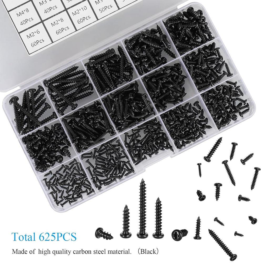This screw assortment kit is a game-changer for DIY projects! With 625 pieces in 14 handy sizes, it covers everything from small crafts to bigger woodworking jobs. The sharp points make driving into wood, plastic, or soft metal effortless, and the black carbon steel feels durable. I love how organized they come—no more digging through mismatched screws. Perfect for home repairs, furniture building, or hobby work. The compact storage case keeps everything tidy, and the Phillips heads work smoothly with standard drivers. Great value for the quantity and variety!