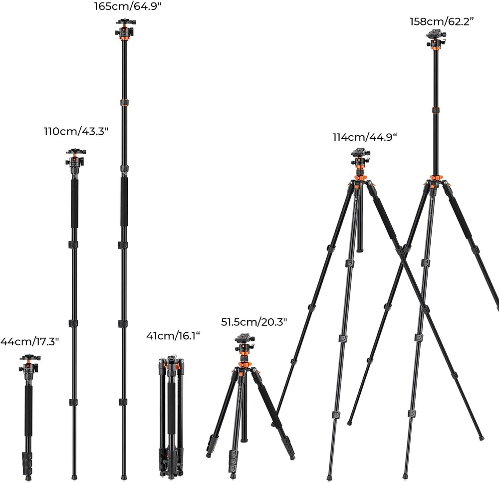 Product Description 62 inch DSLR Camera Tripod,Lightweight and Compact Aluminum Detachable Monopod Tripod with 360 Panorama Ball Head Quick Release Plate for Travel and Work K254A1+BH-28L (SA254M1) 【Compact & Portable】Quality military magnesium aluminum alloy,corrosion resistance; tripod with ball head weighs only 3.35 lbs, it can be 180°reflexed and folded to 16.1'', easy to put it in a backpack or suitcase when travel. 【360° PANORAMA】The 28mm large KF-28 metal ball head provide 10kg load capacity, it can be rotated 360 degrees, helping to expand dslr camera activity range when panoramic shooting. 【Detachable Monopod】 It can be turned into a lightweight monopod or walking stick alone to make your photography more diverse. 【EASY SET UP】 4 sections tube leg and the max diameter is 25mm; With powerful and quick flip leg lock allows you to adjust the working height in seconds; The height without column reaches 44.9'' and the height with 2 sections center column is 62'',making standing shooting easier. 【Multi-Angle Shooting】Spring self-locking foot tube angle adjustment button, just press and release to quickly adjust the opening and closing angle of the three legs; can help you achieve lowest angle shooting, macro shooting, and other special photography through inverted central axis. About Us We are a reputable seller with many years of experience selling on eBay. Our goal is to provide high-quality products and excellent customer service. Shipping Items will be shipped within 1-3 business days when we received payment. (Orders are not processed on weekends & holidays) Tracking information will be sent once item is shipped. Delivery time depends on destination and other factors Item is shipped to ebay address. Leaving correct address can minimize delay. For international shipping and shipping to Guam, Hawaii and Alaska, Please contact us before placing the order. International buyers please note: Import duties, taxes and charges are not included in the item price or shipping charges. These charges are buyer’s responsibility. We will try our best to reduce the risk of the custom duties. Local pick-up is unavailable at the moment. Contact Us We reply any email messages within 1 business / working days(off-duty at weekend). If you do not get a response from us, then please check your junk or spam mailbox. Our Business hours: Mon-Fri 9:00-18:00, UTC/GMT +8 hours. Please contact us either by clicking "contact seller" in the "purchase history" section or simply click "ask a question" at the bottom of this page. If you are unsatisfied with our item or service, please contact us before leaving any feedback. We are committed to resolve all issues in a friendly and satisfactory manner.