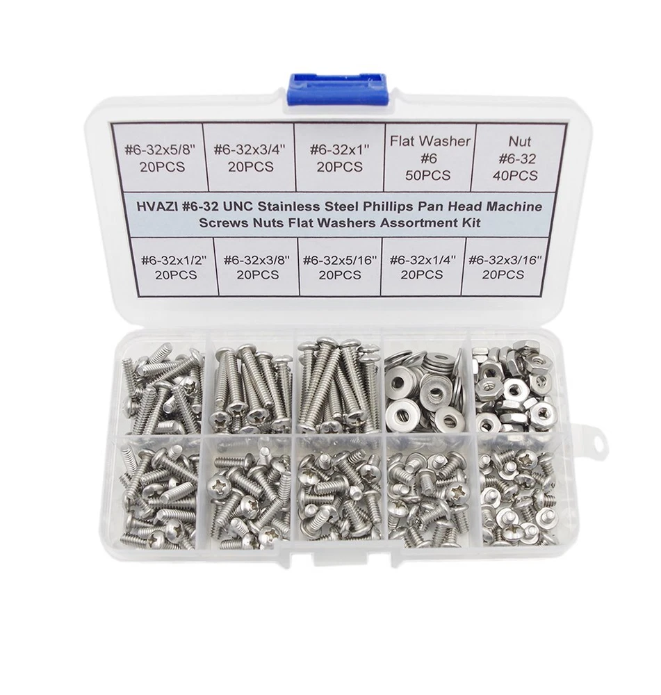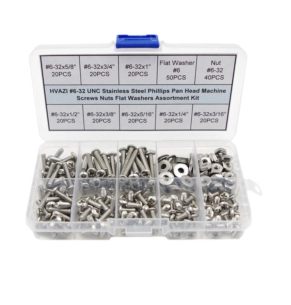 Product description: Made from 304 Stainless steel, these pan head screws have good chemical resistance and may be mildly magnetic. Length is measured from under the head Package include: 250PCS #6-32 UNC 304 Stainless Steel Pan Head Phillips Screws and Nuts Flat Washers Assortment Kit #6-32 UNC Pan Head Phillips Screws and Nuts Flat Washers Kit total 250 pieces. Come with the plastic box: List(Type,Thread/Length,Quantity): Pan Head Phillips Screws #6-32x3/16" 20PCS Pan Head Phillips Screws #6-32x1/4" 20PCS Pan Head Phillips Screws #6-32x5/16" 20PCS Pan Head Phillips Screws #6-32x3/8" 20PCS Pan Head Phillips Screws #6-32x1/2" 20PCS Pan Head Phillips Screws #6-32x5/8" 20PCS Pan Head Phillips Screws #6-32x3/4" 20PCS Pan Head Phillips Screws #6-32x1" 20PCS Flat Washers #6 50PCS Nuts #6-32 40PCS Packing contents: 250 #6-32 UNC 304 Stainless Steel Phillips Pan Head Machine Screws Nuts Flat Washers Assortment Kit in a plastic box 250PCS #6-32 UNC 304 Stainless Steel Phillips Pan Head Machine Screws and Nuts Flat Washers Assortment Kit Thread Diameter: #6; Thread Pitch: 32 Per Inch(Coarse) The assortment contains:#6-32x3/16",#6-32x1/4",#6-32x5/16",#6-32x3/8",#6-32x1/2",#6-32x5/8",#6-32x3/4",#6-32x1"(Length is measured from under the head),Each 20 piece,and Nut 40 piece,washers 50 piece They are Made of 304 stainless steel;304 stainless steel have good chemical resistance and may be mildly magnetic All contained in a compact and see through compartmented plastic Box.Easy to install