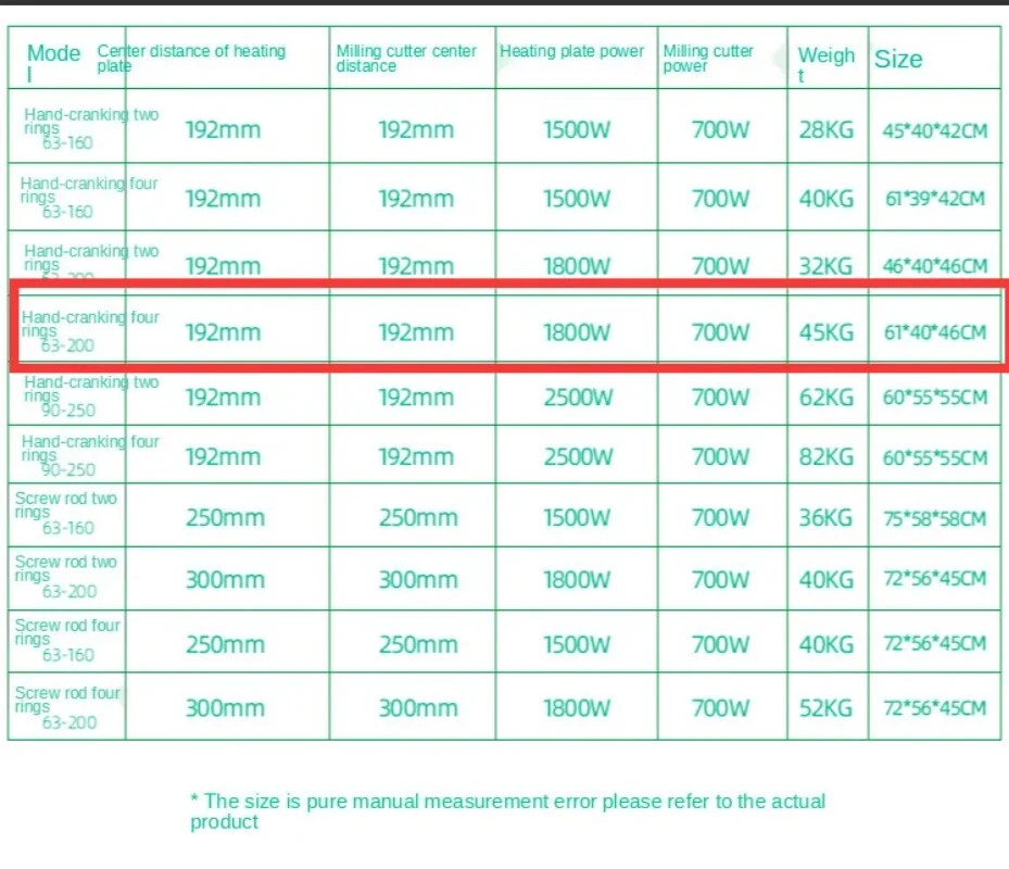Model: 63-200 Center distance of heating plate: 192mm Center distance of milling cutter: 192mm Heating plate power: 1800W Milling cutter power: 700W Weight: 45kg Size: 61*40*46CM