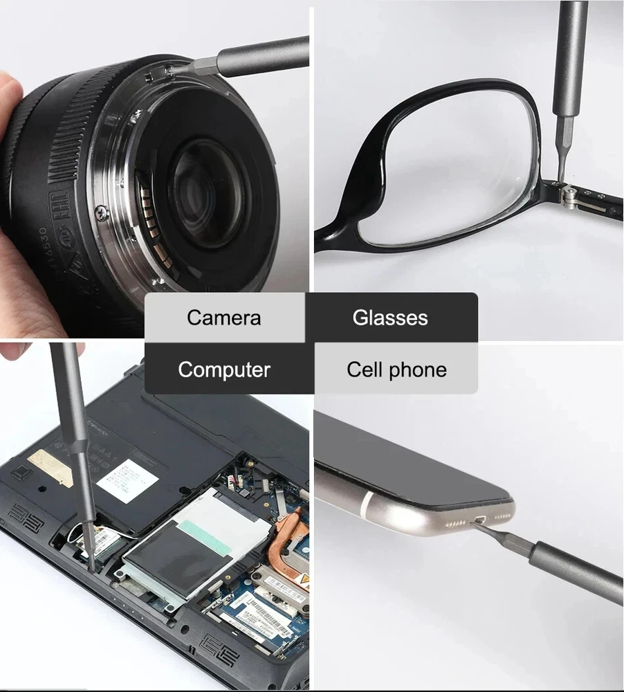 Today we introduce a brand new and powerful 【63-in-1 precision screwdriver Set】Believe in your choice, you won't regret buying it. 【Super High-Quality CR-V Metal】Mini screwdriver set is made of CR-V Alloy, which is impact-resistant, wear-resistant, sturdy and durable. All bits are well made with strict quality control with high precision to make sure all your repairing work precisely and reliable. 【High Precision Screwdriver Set】Multi-magnetic driver Specially used for electronic equipment products.This screwdriver set includ of 62pcs screw bits(phillips, pentalobe, torx,hex, slotted, triangle, square and other sizes).It has a wide range of applications. 【Rotatable Light Handle&Strong Magnetic Head】: The precision screwdriver aluminum handle is light and portable in a ergonomically design. The handle will not hurt your hands during a long-lasting work. On the contrary, it is suitable for long-term professional use. There is a strong Magnetic design on the top of the screwdriver , which can be firmly hold and make your work more efficient. 【Easy to Carry】 Precision screwdriver set have storage space is designed reasonably, the screwdriver bits placement position and the size of the accessories are consistent, and the parts are not easy to fall out, which is convenient for your work. 【Simple Design】 The screwdriver set box has, a perfect compact design, a magnetic bit position, and a portable size. Just gently squeeze, you can easily pop out. 63 bits in the following sizes: Flathead sizes: 1.0, 1.3, 1.5, 2.0, 2.5, 3, 4 JIS sizes: PZ000, PZ00, PZ0, PZ1 Hex sizes: 0.7, 0.9, 1.3, 1.5, 2.0, 2.5, 3.0, 3.5, 4.0 Phillips sizes: PH00000, PH0000, PH000, PH00, PH0, PH1, PH2 Torx sizes: T1, T2, T3, T4, T5, T6H, T7H, T8H,T9H, T10H, T15H, T20H Y0.6, Y1.5, Y2.5, Y3.0 Mainboard size: 1.5 Triangle size: 2, 2.3, 3.0 U2.3, U2.6 Star sizes 0.8, 1.2, 1.5, 2.0 Square sizes SQ0, SQ1, SQ2 Nut Driver sizes 2.0, 2.5, 3.0, 3.8, 4.0, G4 specifications product name:63 in 1 Precision Screwdriver Set SIze:20*10*3.3 cm material quality:CRV Handle material:Aluminum alloy handle Shell material: ABS Note: Please allow 1-2cm measuring deviation due to manual measurement Due to various monitors and lighting conditions, colors may be slightly different from listed photos