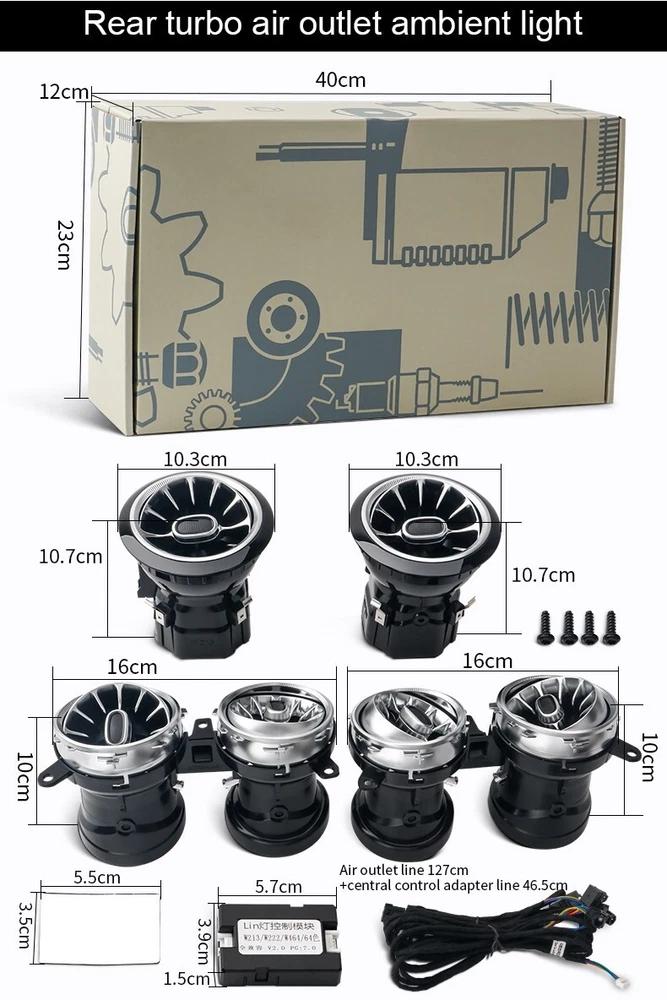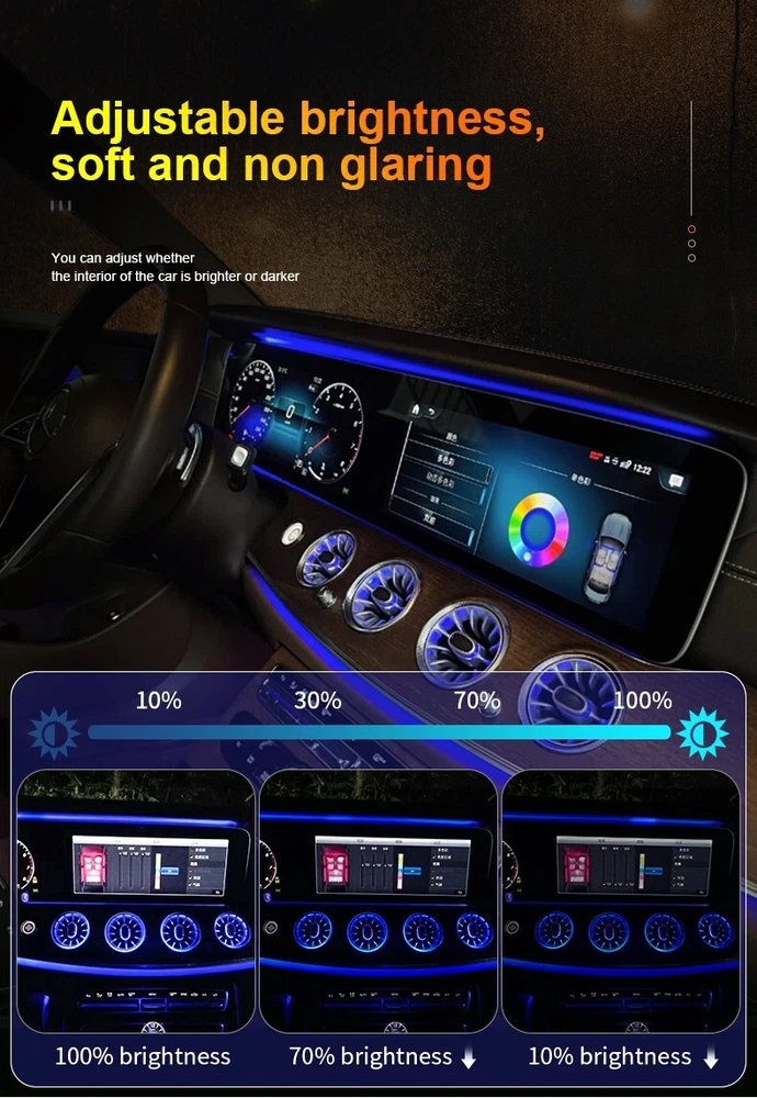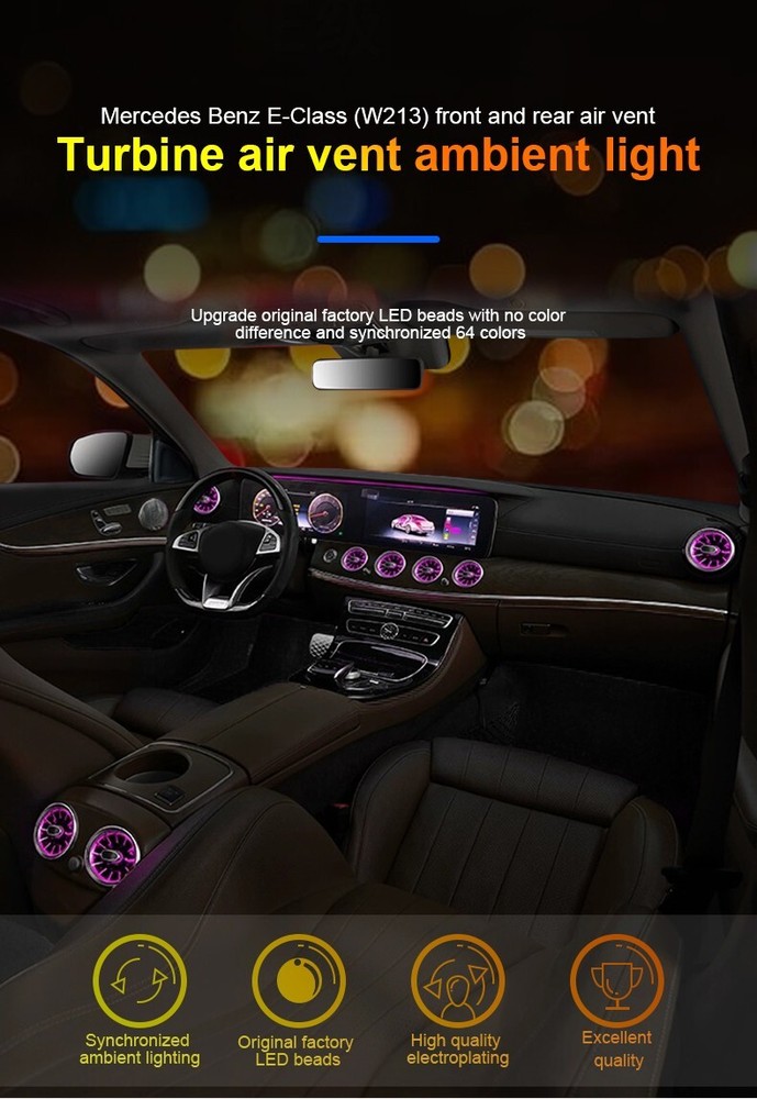 Features: 100% Brand New in Box W213 8PCS/Set 64 Colors NEW Version High Quality Plug and Play Interior Front and Rear Dashboard Air Vent with Ambient Light 1:1 Replacement; NO Modification Required Fitment: For Mercedes Benz E-Class W213 2017 2018 2019 2020 2021( 64 Colors ) - OEM design, fit original air vent position perfectly - Light color is synchronized with original ambient light - Light color and brightness can be controlled by original Command knob Package included: 8 PCS/Set Front and Rear Air Vents with Ambient Light NOTE: NOT Including Installation Guide or Manual. Professional installation is highly recommended .