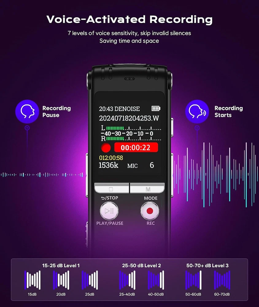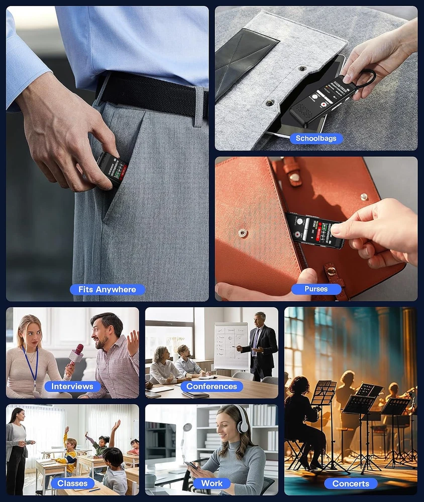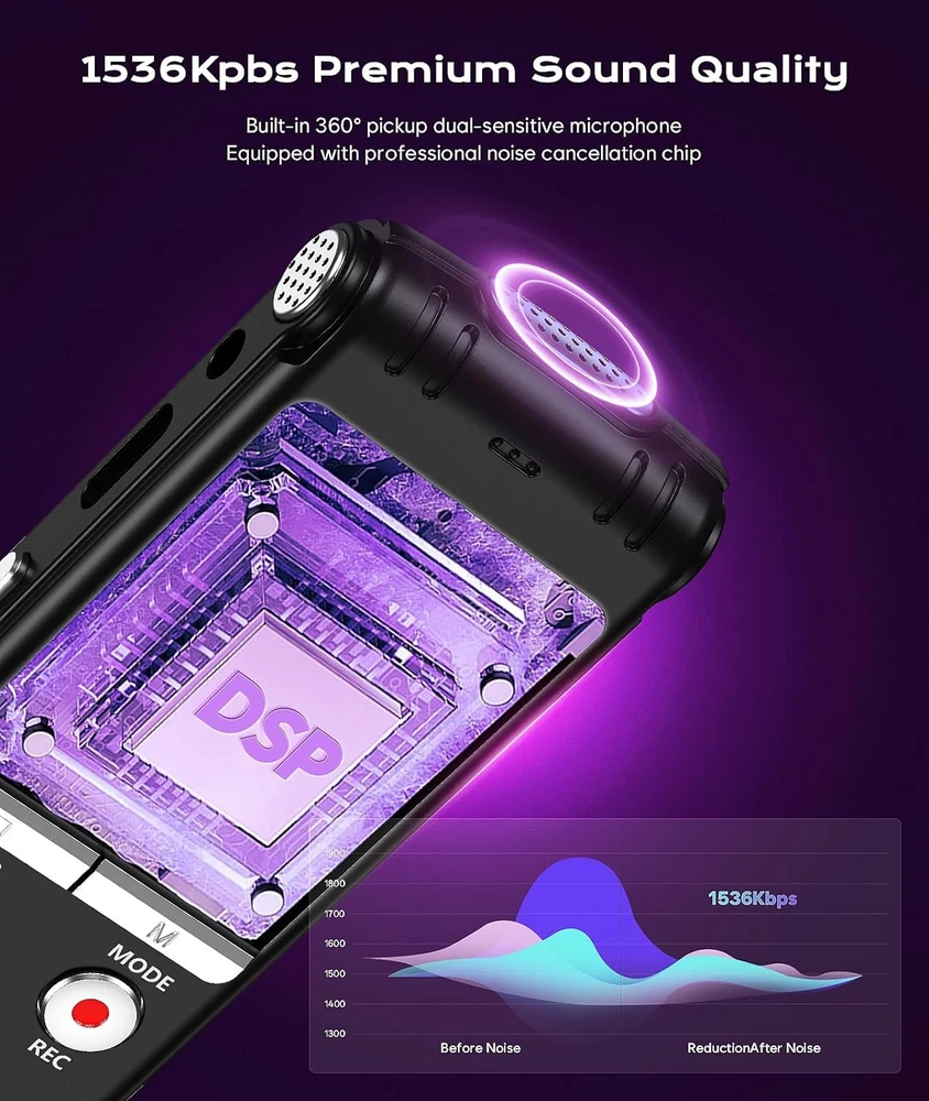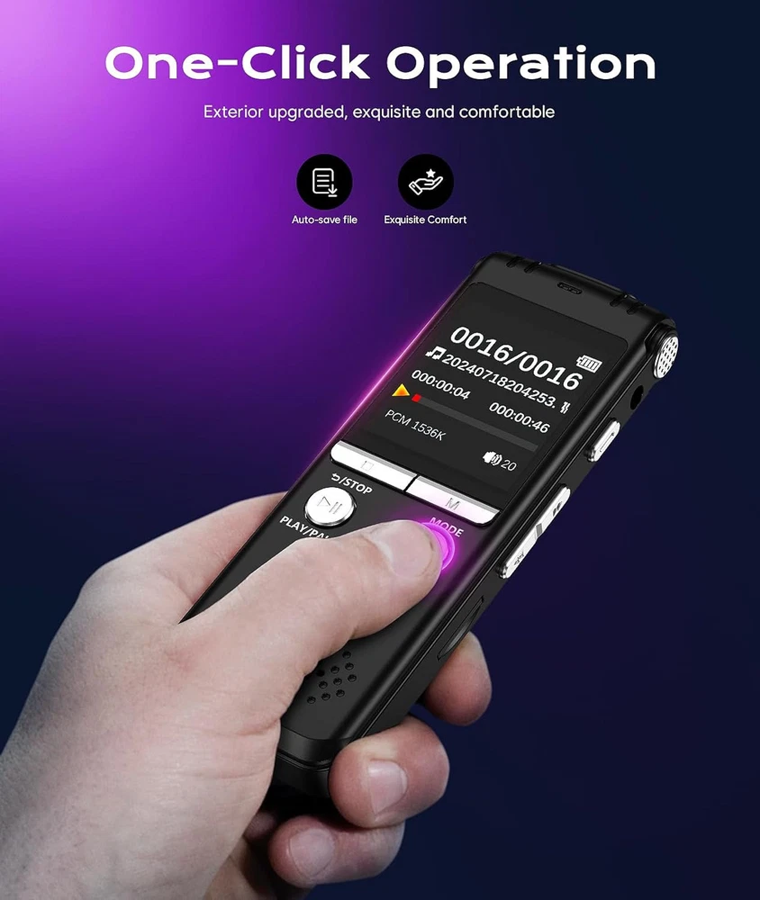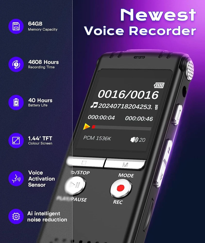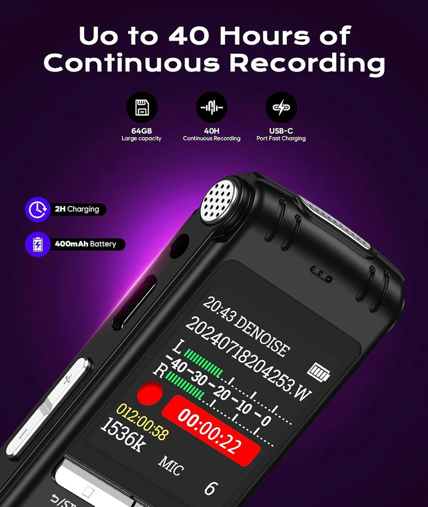 64GB Digital Voice Recorder: ZIPCIDE 4800 Hours Voice Activated Recording Device Audio Recorder with Playback, Noise Reduction Sound Dictaphone Tape Recorder for Lectures Meetings/Classes/Interviews Product Details Product Dimensions: 3.7 x 0.5 x 1.3 inches Item Weight: 4.6 ounces Item model number: 64GB Manufacturer: ZIPCIDE-US Country of Origin: China Compatible Devices: Laptop, Personal Computer, Tablet Brand: ZIPCIDE Hardware Interface: USB Type C Microphone Form Factor: Built-In Format: MP3 Audio Headphones Jack: 3.5 millimeters Product Dimensions: 3.7"D x 0.5"W x 1.3"H Memory Storage Capacity: 64 GB Screen Size: 1.44 Inches Digital Recording Time: 40 hours DSP Chip & HD Microphone: ZIPCIDE Recorder is equipped with 3 MIC on the top, which record a 360-degree surround sound and combined with the DSP chip to provide intelligent noise cancellation, crystal clear recordings and MP3 player 64GB Huge Memory and Large Battery: ZIPCIDE newest recorder supports a removable 64GB TF card, store up to 4608 hours of recording (64GB TF card included). With built-in 400 mAh battery, voice recorder can record 40 hours without interruption, supports automatic low battery save files to protect your recordings, no more risk of data loss AVR Mode: ZIPCIDE recorder supports voice activated function so that the recorder automatically starts recording when a voice is recognized. If no voice is detected, the recorder pauses recording to reduce recording capacity and power consumption Upgrade Type-C Charging Port & 1.44-inch TFT Color Screen: With newly designed Type-C charging port, voice recording device can be charged fully in 2 hours and supports 40 hours of continuous recording and 23 hours of continuous playback of recordings. ZIPCIDE voice recorder is equipped with a 1.44-inch TFT color screen, and the large, user-friendly design of the screen makes it easy to see what's on the screen One Touch Quick Record: This voice recorder is equipped with a quick record button, recorder allows you to record with one click and save with one click, and you can record quickly without losing details Multi-Functional & Multi-Scenario Application: Multi-function such as A-B repeat, password protection, timer recording, voice activated , files protection. With Exquisite design, voice recorder with playback is a perfect gift for students, lawyers, businessmen, teachers etc