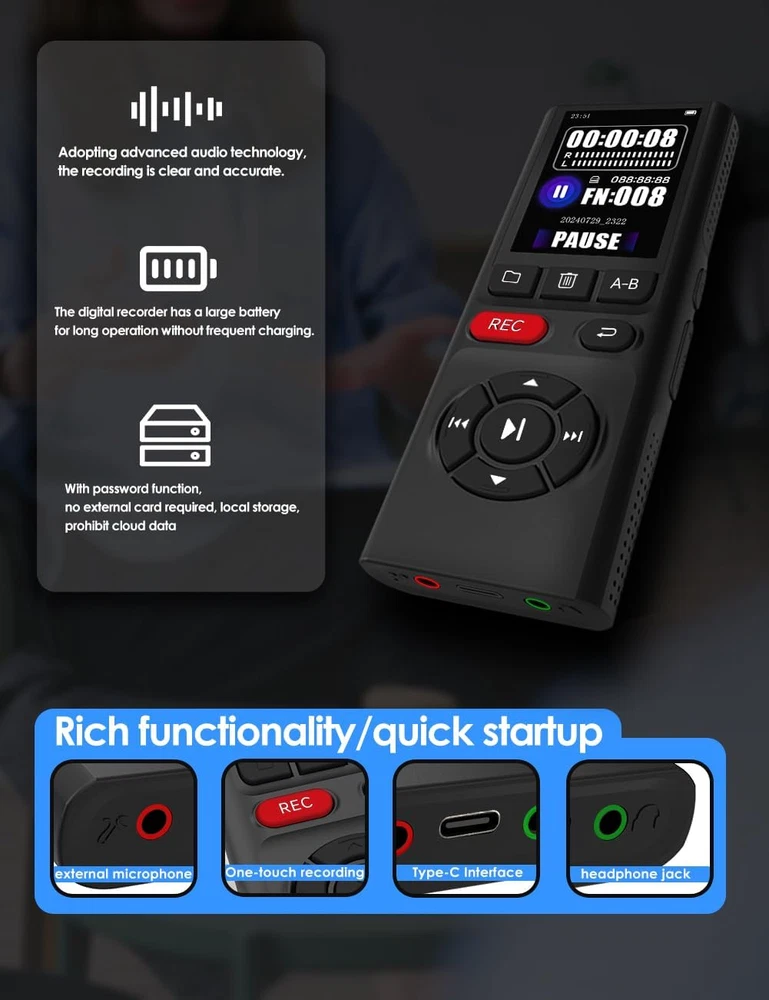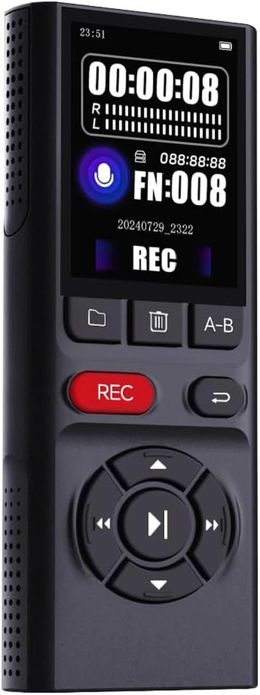 64GB Professional Digital Voice Recorder with Playback High-Capacity Voice Life High-quality recordings: Unlike analog tape recorders, digital voice recorders can capture high-quality audio with minimal background noise and interference. Bigger screen: The recording and playback features of digital recorders are easy to navigate and operate. Features an OLED display that shows recording status, remaining battery power and other useful information. Storage capacity: 64GB of storage space, compressed in a variety of formats, which means you can record for a long time without worrying about running out of space. Versatility: Digital voice recorders can be used for a variety of purposes, such as recording lectures, meetings, interviews, podcasts, and personal memos. Longer battery life: We optimized power consumption, increased battery capacity, and tested up to a week of continuous audio recording using the (MP3) format. Security: This is a very important aspect and the machine is equipped with 6-bit digital encryption for increased file security. Product Description Fikyra Professional Digital Recorder You will receive Data Charging Cable Manuals High-strength storage bag A professional recorder like a cell phone Outstanding feel, long battery life and comfortable In addition to HD recording, without sacrificing portability, we've added larger screen size, larger buttons, and larger battery capacity. The fully upgraded Fikyra digital video recorder High-quality sound recording: The digital recorder features advanced audio processing technology to capture clear and accurate recordings. Long battery life: With a large battery capacity, the digital recorder can operate for extended periods without the need for frequent charging. compact design: The digital recorder features a compact and portable design, making it easy to carry and use on the go. Easy-to-use interface: The recorder's user interface is intuitive and simple, making it easy for users of all skill levels to navigate and use. Long battery life: With a large battery capacity, the digital recorder can operate for extended periods without the need for frequent charging. High quality screen We offer a larger screen compared to traditional recorders, the higher viewing angles, which is a very user-friendly change High-quality sound recording With advanced noise reduction technology, our recorder captures clear and crisp audio, making it perfect for recording interviews, lectures, meetings, and more. True dual microphones with equally good playback sound quality! No need to link devices, headphones, you can also hear the live feeling. We did it. Item model number SL-A1 Format MP3 Audio Memory Storage Capacity 64 GB Product Dimensions 0.7"D x 1.9"W x 4.9"H Country of Origin China Compatible Devices Personal Computer Item Weight 111 Grams Batteries 1 Lithium Polymer batteries required. (included) Headphones Jack 3.5 millimeters Microphone Form Factor Built-In Number of Batteries 1 Lithium Polymer batteries required. (included) Hardware Interface USB Type C Complimentary Shipping and Easy Returns Need to return something? Enjoy our 30-day hassle-free return policy! Take advantage of free shipping across all 48 contiguous states! Your order will be dispatched within 1-2 business days once payment is confirmed. Your Opinion Matters! Your happiness is our main goal! We welcome your feedback! If you encounter any problems, reach out to us right away, and we’ll be here to help. Explore the Extraordinary! Our collection showcases fascinating products that are sure to capture your attention. What surprises await you? Delve in and discover unique items that enrich your daily life. Don't miss the amazing things we have in store for you!