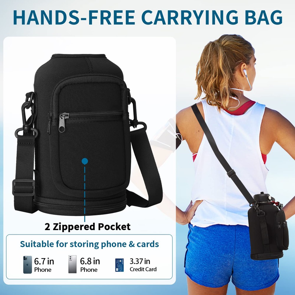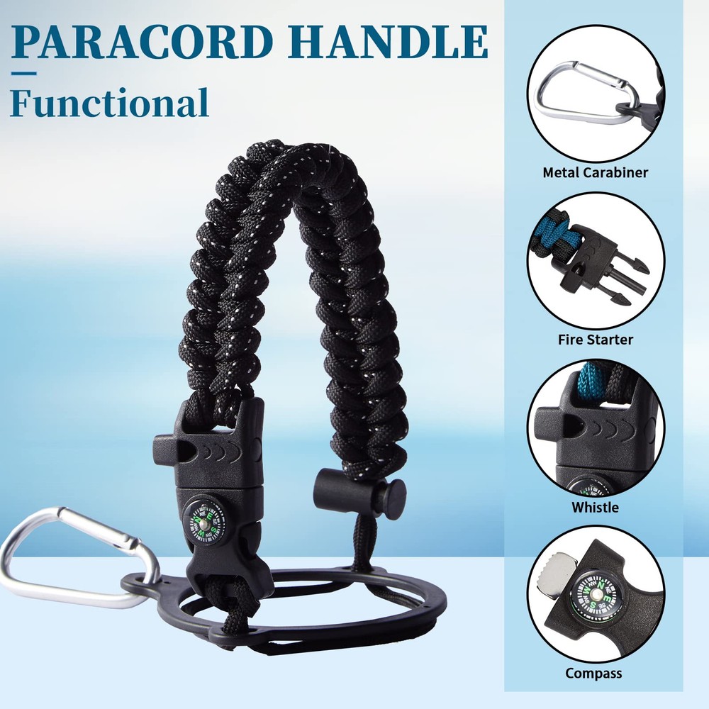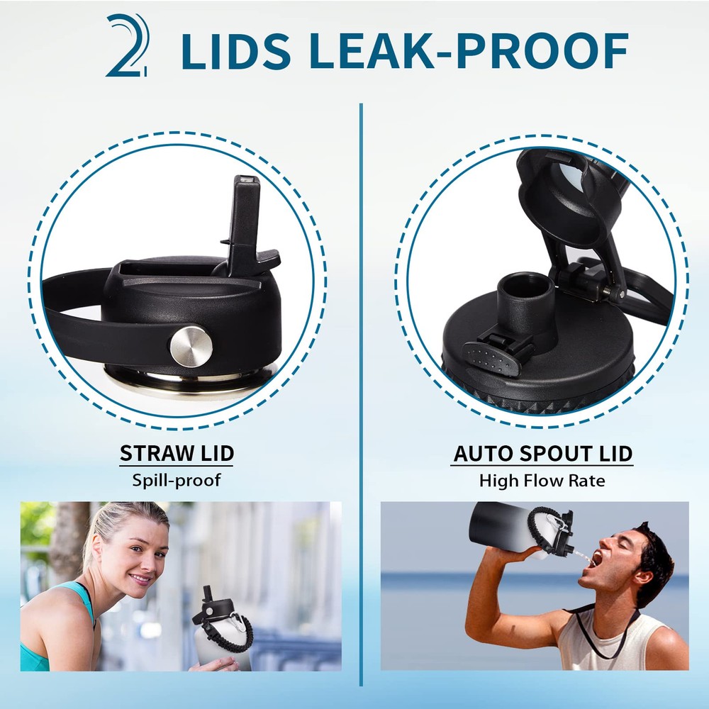 SUPER DEAL COMBO - Buy one 64 oz insulated water bottle, get 9 accessories (2 x lids(BPA Free), 1 x paracord handle, 2 x straws(BPA Free), 1 x carrier bag, 1 x shoulder strap, 1 x protective silicone boot, 1 x straw brush) LEAK-PROOF 2 LIDS - AUTO SPOUT LID & STRAW LID meet you different drinking need, and both lids are leak proof and with handle for carrying on the go. The pop-up spout lid features a button for one hand open quickly, and a large water outlet for fast drinking. The straw lid with straw lets you enjoy perfect spill-proof sipping to all your outdoor adventures, also can prevent the inhalation of ice cubes DOUBLE-INSULATION HALF GALLON WATER BOTTLE - metal water bottle material is food-grade 18/8 stainless steel. Vacuum insulated double wall design keeps your beverage at the perfect temperature all day long(Cold-48H & Hot-24H)! The wide mouth waterbottle easy filling water and ice, water jug complete sweat-proof and has anti-slip powder coating, no more messy using PERSONALIZATION BOTTLE PARACORD HANDLE - Thermo water bottle with a pretty cool functional paracord handle which does more than meets the eye. The survival strap cord made of military grade nylon, with compass, safety loop, metal carabiner, flint, igniter and whistle. Can help you out if you were in a survival situation while hiking, camping or everyday life HANDS-FREE BOTTLE CARRIER BAG & PROTECTIVE BOOT - Stainless steel water bottles with shoulder strap carrier have 2 zipper storage pockets hold your , cards, keys. The carrying pouch also provide extra insulation, with the silicone cup mat full-protect the reusable water bottle from additional damage and extend the life of thermo hydro mug