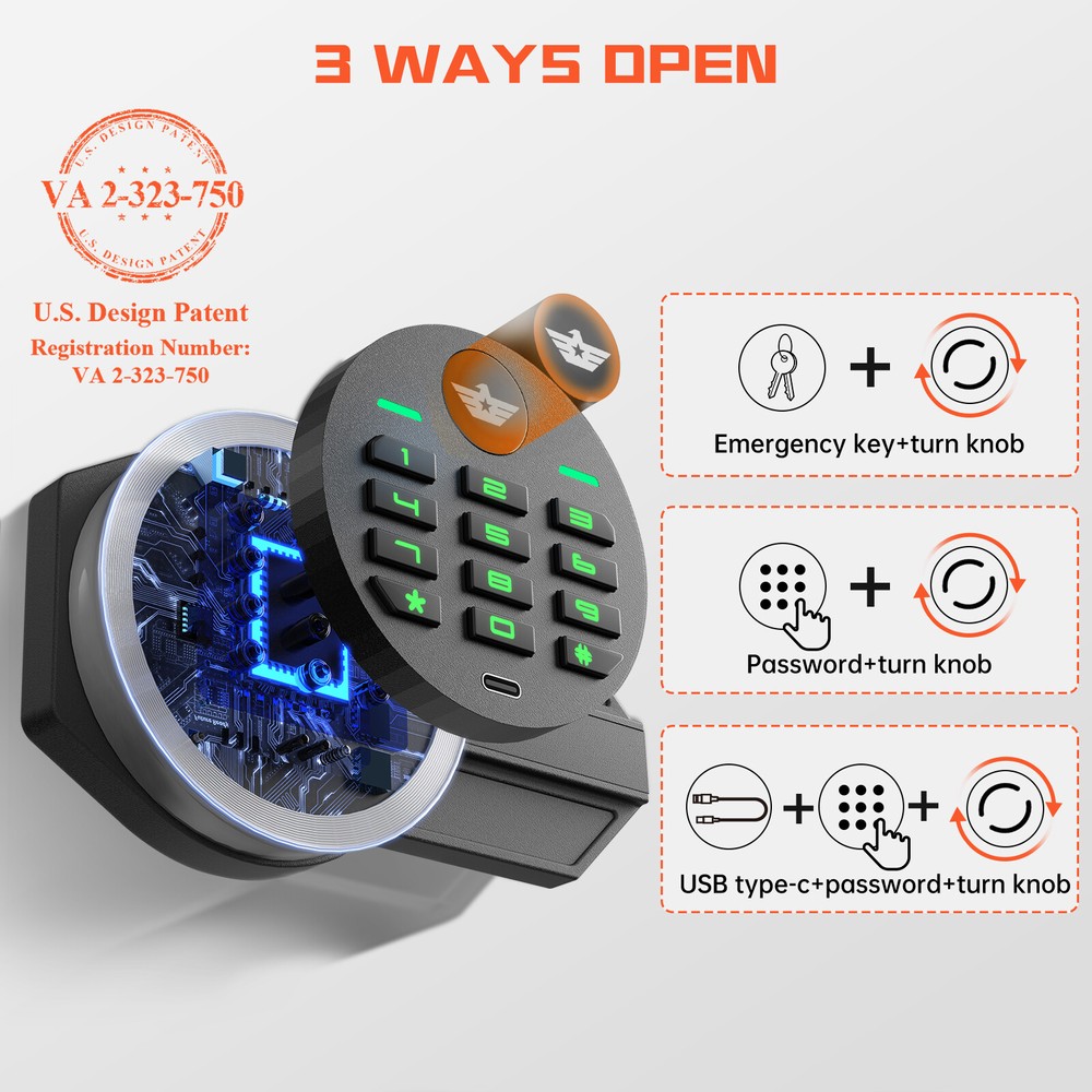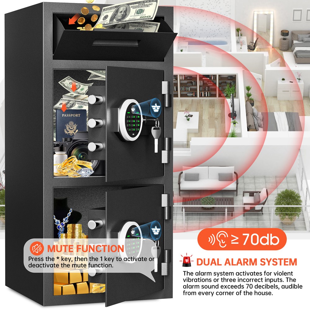 【Extra Large 6.5 Cub Security Safe Box】 The external size is 13.78"D x 13.78"W x 29.53"H. 2024 new upgraded double door design, which can open and operate separately. Kavey large safe box can meet the storage needs of your whole family, which can hold almost any valuables, like trophy, laptop, pistols, documents, cash, jewelry and more. Besides, we also add soft lining in the inner space, which can better protect your valuables from scratching. 【Anti-theft Heavy Duty Safe】 Made of reinforced low carbon alloy steel, pry-resistant thicken door, plus 6 solid living bolts, all make our safes for home tamper-proof and prevents forced entry, thus can better protect your valuables. Kavey safe box fireproof waterproof puts your security concerns to rest once and for all. 【Anti-fishing Design Drop Slot】 Our drop safe box with drop slot, which makes easy and quick to drop your daily things like coins, money or other small items without opening the door, which can be widely used many places like home, hotel, motels, bank counter, cab, café, restaurants, office, retail businesses, etc. In addition, Anti-fishing design provides protection against theft and burglaries for cash, receipts, deposit slips, keys, and other valuables. 【Dual Alarm System】 Kavey home safe has a dual alarm system which activates after 3 consecutive incorrect passwords or violent vibrations, with a 70 decibel alarm sound lasting 60 seconds, audible throughout your home, enough to deter even the most audacious intruders. The alarm can be stopped by entering the correct password. 【Backlit Keypad, Built-in LED Light & Mute Function】 Backlit keypad can let you easily see and operate the password clearly even in the dark; When you open the safe with password, the led light will on automatically, you can quickly find what you want. Mute function is also necessary for you when you want to open the security safe without making a sound, will not disturb your family or remind intruders. 【What You Get】 1*new 6.5 Cub Kavey drop safe, 4*emergency keys, 6*expansion screws, 1*usb type-c cable, 4*non-slip pads, 1*user manual. Besides, we have a lifetime customer service for each cabinet safe we sold. If you have any questions, you will always enjoy 7*24h friendly customer service from Kavey. 【Floor & Wall Mounted】 Pre-drilled mounting holes with six expansion bolts(four at the back, two at the bottom) are included, you can bolt this fireproof safe to the floor, on the wall, or inside a cabinet, increase the safety factor and prevent theft.