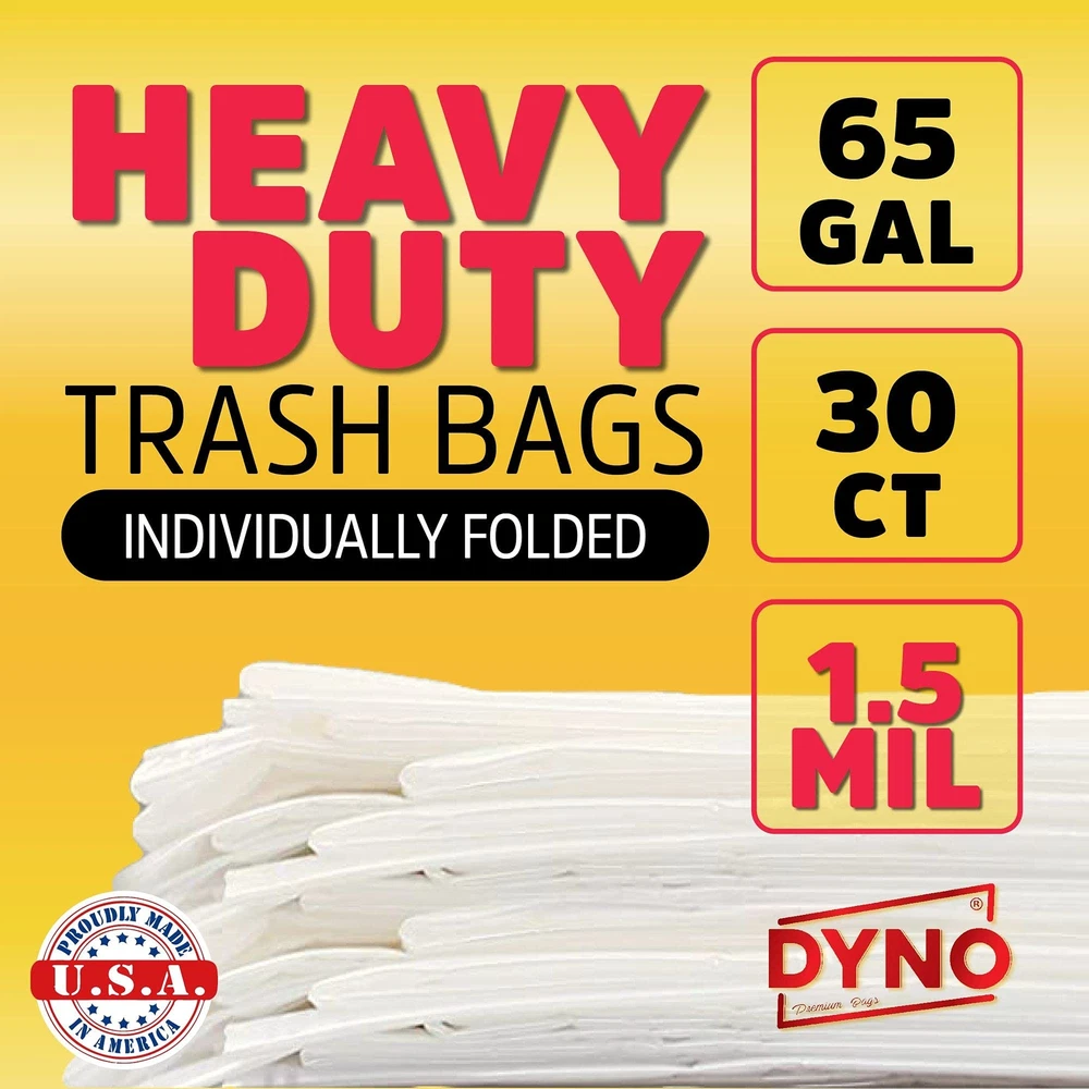 65 GALLON TRASH BAGS – These large trash bags are designed to fit a 64 gallon trash can with wheels, with enough excess to overlap the side and tie the bag off when full. Suitable for residential household garbage and commercial waste. Keeps cans from getting dirty. INDIVIDUALLY FOLDED – 1.5 mil thickness for tear resistance and durability. Unlike most heavy duty trash bags, ours come individually folded so you can take at a time without bringing the whole roll with you. The trash bags remain uncrumpled and easy to open. HEAVY DUTY INDUSTRIAL STRENGTH – Made from industrial strength low density resin with a thick gauge that makes these trash can bags resistant to tears and leaks. Will not break or lose structural integrity even when punctured by thorns, sticks and pointy objects. PROUDLY MADE IN USA – Our bulk garbage bags are proudly Made in the USA under strict environmental guidelines and quality assurance standards. Ideal for use as heavy duty contractor bags, lawn bags and trash can liners for large commercial garbage or recycling. KEEP LARGE TRASH CANS CLEAN – Use these trash compactor bags to keep the trash can clean and free from foul odors. Keep everything contained before trash day pickup and avoid rotten spills that attract flies and maggots. A perfect fit without being too tight or slipping down.