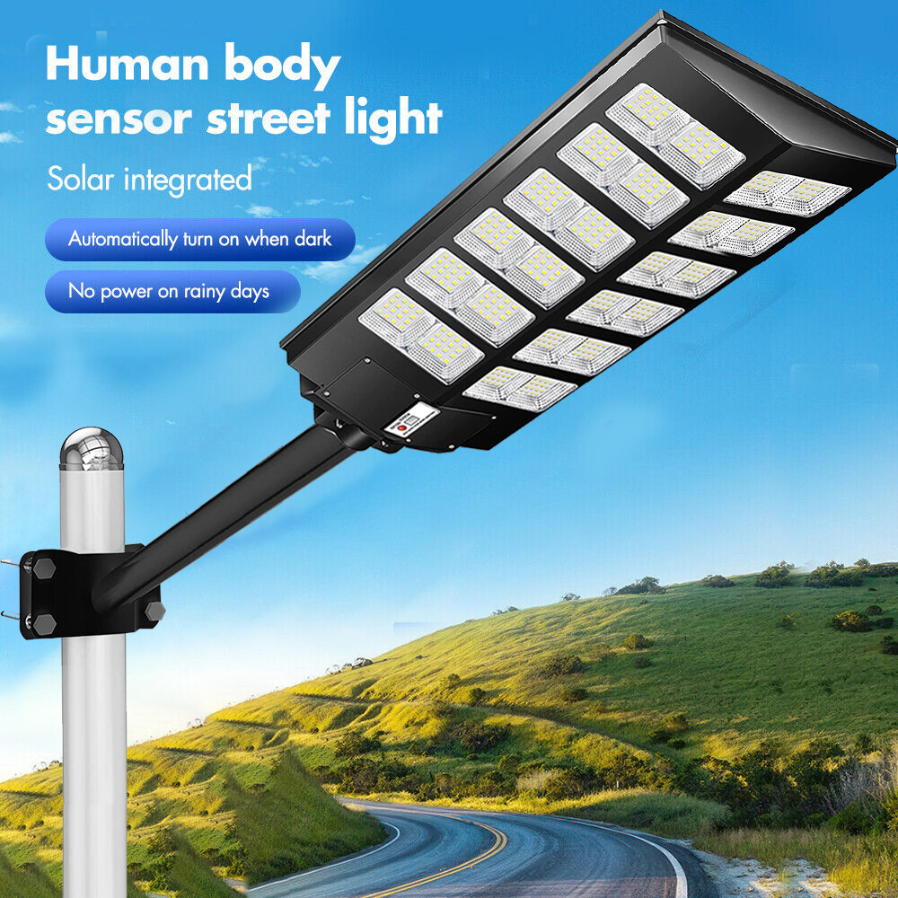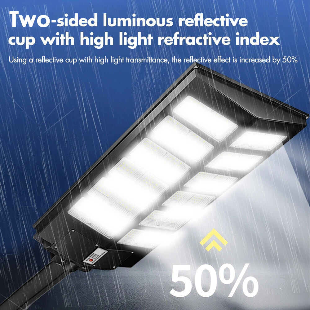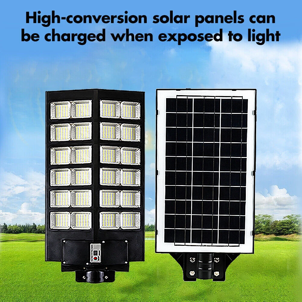 【Super Bright Solar Street Light】2600W solar street light uses high efficiency 960 pcs 5730 high bright long lifespan SMD lamp beads, 300000 Lumens are extremely bright and have low light decay. With a 240 degree wide-angle lighting design, which can provide lighting range up to 3800 square feet and brighter compared with ordinary street lights. 【NO Electricity Bill】This solar parking street light provides 6500K daylight white light and is equipped with 800 PCS super bright LED beads and a 3.2v-48000mAh battery (with a life of up to 50,000 hours). The IP67 waterproof commecial grade makes it work well even in bad weather all year round. It is solar powered street light, produces no electricity bill, automatically turns on at dusk and turns off during the day, and can provide continuous lighting for up to 30 hours (when fully charged). 【3 CONTROL MODES】1. Motion Sensor: keeps 30% power lighting until motion is detected, automatically adjusts to 100% power lighting, and then returns to 30% power brightness after the person leaves for 20 seconds; 2. Timed Lighting: Timed 100% power brightness Lighting for 2/3/5/6/8 hours; 3. Always Lighting: Always 100% power brightness lighting (in this mode, you can adjust the brightness of the street lights to 25%-100% brightness). 【Easy to Install, No Wiring】The package contains 2 kinds of mounting screws and accessories, as well as solar light arm poles. The LED street lights are easy to install, with screw fixing and dependable operation without the need for wiring or trench. You can install solar lights on walls, trees, light poles, etc., wherever you want to install them (support street light post diameter: 1.5 to 4 inches, suggest height 18-25ft). 【Reliable After-Sales Service】offers 24 months of after-sales service, ensuring a good purchasing experience for our customers. If you have any questions regarding our solar street lights outdoor, please don't hesitate to reach out to our customer service team. 200000LM Solar street light, 0 electricity bill, Remote control, Light sensing function, Motion sensor 1. solar street light provides super brighter daylight at full night, no electricity distribution, fast charging, energy saving. 2. IP67 waterproof, Can deal with -5°C-70°C temperature and bad weather in daily life. 3. Easy to installation for wall and lamp post, the package contains 2 kinds of mounting screws and accessories, as well as solar light arm poles, applicable lamp post diameter: 1.5~4 inches. 4. Light control + multi-function remote control, turn off and charging during the day, working lighting from down to dawn. 5. The remote control has a memory function, it can turn on and off light, be timed lighting, and adjust motion sensor mode. 6. Continuous working time: More than 12 hours in constant light mode, 20-24 hours in motion sensor mode. 7. 60000mAH large capacity battery, long battery life, can work continuously for 50000+ hours, more than 5 years. 8. Two ways to turn on the light: Button Control + Remote Control. Solar street lights automatically turn off the lights during the day to charge, and turn on the lights at night for work lighting; IP67 Waterproof, can work in all bad weather IP67 Waterproof, can work in all bad weather Make Sure The Solar Light Has Been Fully Charged and The Remote Control Has Battery Already: 2*AAA (Included) ON: Turn ON the light and Always lighting; OFF: Turn OFF the solar light; 25%-100%:Always Lighting 25%-100% brightness; 2H/3H/5H/6H/8H:Timed Light Up Lighting 2/3/5/6/8 hours; 'Radar': Motion sensor mode (When no one is there, 0% brightness lighting of solar lights; 100% brightness lighting when someone passes by; 30% brightness lighting after people leave for 20 seconds); Note:In Always/Timed Lighting mode, if the light is not adjusted for a long time, the brightness of the light will decrease some brightness every 3 hours in order to prolong the lighting time. Q: Can it work on cloudy days? A: Yes, it can work in all environments, but it needs sunlight when charging, otherwise it cannot be fully charged; Q: Why are the lights turned on at night? A: When the solar panel is in the dark (the solar panel cannot detect the light), at this time the green indicator light will be off, and the light can be turned on by the remote control and the button on the lamp; Q: How long can it work on a full charge? A: Always lighting mode can work for more than 12 hours; Motion sensor mode can work for more than 20 hours;
