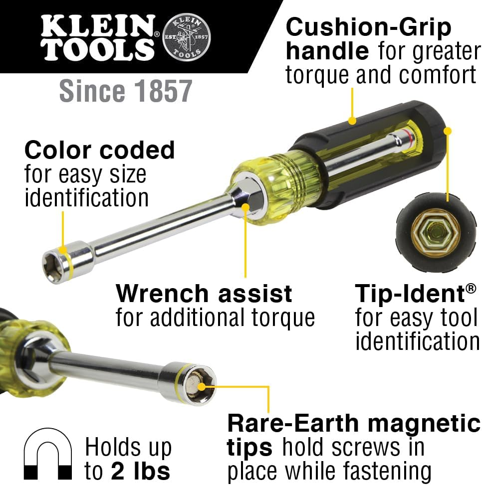 1/4-Inch and 5/16-Inch six-point hex nut drivers Powerful magnets for maximum fastener-retention Solid build quality - feels like a conventional nut driver Color coded bands for easy identification Wrench-assist to help remove stubborn fasteners Carry two in one convenient handle with Klein's 2-in-1 Hex Head screwdriver. Features the popular 1/4-Inch and 5/16-Inch hex sizes most tradespeople need. Magnet in hex keeps screws in place. Great for HVAC, Plumbing and Electrical jobs or any DIY job around the house. For more than 160 years, Klein Tools has manufactured premium-quality, professional-grade hand tools that deliver the performance, durability and precision needed to get the job done right. Our family of engineers, workers and craftsman continue to put six generations of expertise into every tool we create by using only the highest quality materials, superior workmanship, and keeping manufacturing as close to home as we can. Klein isn't just the name of our company, it's also our family name. And since we're an American company that's family-owned and family-run, you know you can count on us to be here tomorrow. Klein Tools doesn't just make great products, we make great products that stand up to the demands of the professionals who use them every day ... Since 1857.