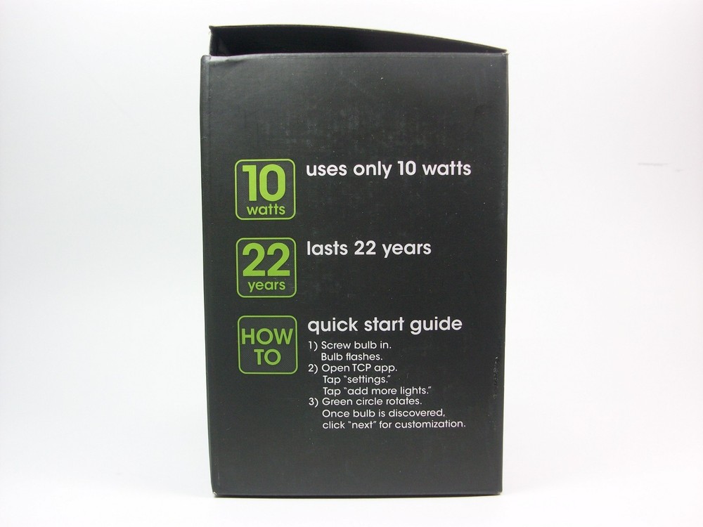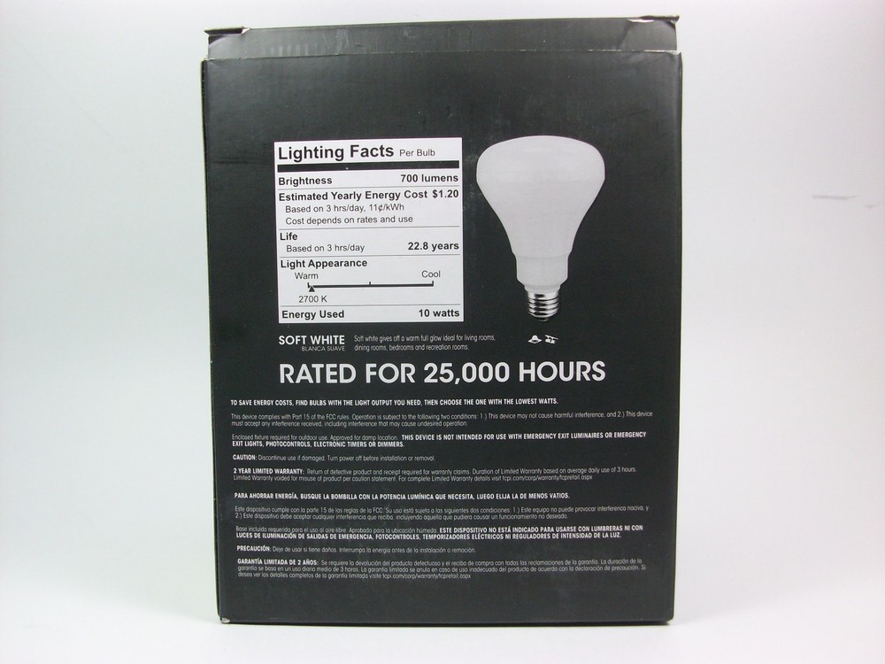 TCP LED Light Bulb 10 watt – 120 volt – BR30 – Medium Screw (E26) Base – 2,700K – Dimmable – CONNECTED (R) Manufacturer Description: CBR10LC UPC Code: 762148261667 Case Light Output: 700 Lumens Energy Used: 10 Watts Average Lifetime: 25,000 hours Volts: 120 Volts AC 60 Hz Bulb Type: BR30 Base Type: Medium Screw (E26) Color Temperature: 2700K CRI: 80 Length: 5.3 inches Width: 3.7 inches Features Control from anywhere smart lighting with premium dimmable technology, fits anywhere a standard lamps fits. Same size, same shape. Last 25,000 hours with excellent light output and color consistency. Uses 80% less energy than the standard bulbs and even less when dimmed. Use with CONNECTED ® automated home lighting system. Note: This type of bulb uses technology from the manufacturer to dim and control remotely. The technology to control this bulb is sold separately. PayPal Verified!