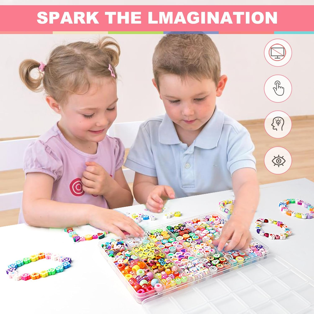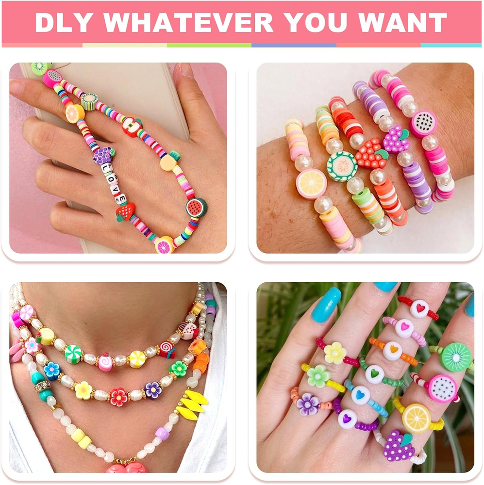 VALUE SET: One box contains 24 styles of polymer clay bead bracelets making kit, including letter beads, pony beads, clay beads, animal, Christmas Halloween, ladybug, flower, love, star, rainbow, fruit, smiley face, candy, butterfly, unicorn, ball beads etc. In addition to a roll of elastic thread, the rich variety provides excellent creativity for your DIY project, satisfying all your handmade desires. Suitable for making jewelry and home decor, unleash your imagination. SUITABLE SIZE: Polymer clay beads are approximately 10mm with a 2mm hole; flat clay beads are approximately 6mm with a 2mm hole; alphabet beads are approximately 4*7mm with a 1mm hole. All beads are stored separately in a 24-compartment plastic box, making them very easy to store and carry. ECO-FRIENDLY MATERIALS: Our beads are made of healthy and environmentally friendly materials that are not easy to fade, comfortable to wear, and of superior quality. Whether you are taking a shower, swimming, or engaging in other water activities, you can wear them with confidence. ENJOY DIY FUN: Clay beads charms are suitable for making bracelets, cell phone charms, necklaces, earrings, eyeglasses chains, key chains, hair braids and so on. Try to use your imagination and explore more uses, you will be impressed by your excellent creativity. NICE GIFT CHOICE: Clay bead bracelet making kit is an ideal gift for your friends, you can also make unique decorations for them, they will love it! Suitable for DIY crafts with kids, cute charms for bracelets can improve their creativity, imagination, color perception, hands-on ability and attention. Product Description Redtwo's polymer clay beads are made from safe materials with great toughness and quality. Ideal for kids and adults who love DIY, whether making bracelets, necklaces, earrings, or other fun projects. This vibrant kit has everything you need to bring your ideas to life! 24 Styles of polymer clay beads offer all the options you need for colorful DIY projects, With 660+ polymer clay beads and accessories, you can create a variety of jewelry and crafts.Made from quality materials, these beads provide flexibility, durability, and safety for your creations.