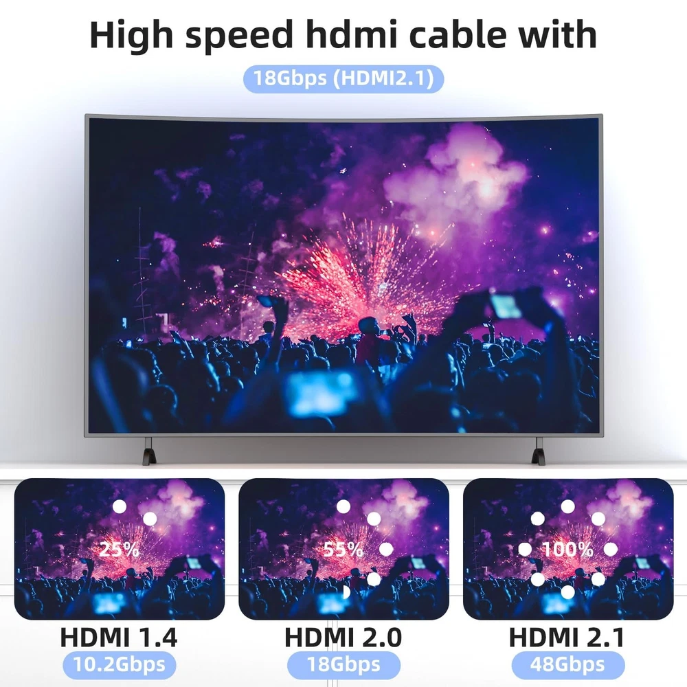 About This Item: 8K Ultra High-Speed HDMI Cable – HDMI 2.1, 48Gbps, eARC, HDR10, VRR – Compatible with PS5, Xbox, 4K@120Hz, 8K@60Hz Experience next-level visual and audio performance with our 8K Ultra High-Speed HDMI Cable, engineered with the latest HDMI 2.1 technology. Designed for crystal-clear pixel display and precise signal processing, this cable supports 8K@60Hz and 4K@120Hz resolutions, delivering ultra-smooth, high-definition visuals for gaming, streaming, and home entertainment. Features: Ultra High-Speed Performance: HDMI 2.1 standard with data transfer from 18Gbps to 48Gbps for flawless signal transmission. eARC Audio Support: Enables advanced audio control with immersive, multi-dimensional sound for a cinematic experience. Dynamic HDR10 & VRR: Enjoy enhanced color, contrast, and detail with Variable Refresh Rate, Quick Frame Transport (QFT), and Quick Media Switching (QMS) for lag-free performance. Premium Build Quality: Durable aluminum alloy housing, anti-bending tail design, and 24K gold-plated connectors for accurate signal transfer. Enhanced Protection: PVC outer layer for water resistance, mold prevention, and heat protection, extending the cable’s lifespan. Broad Compatibility: Works with PS5, PS4, PS3, Xbox Series X/S, Nintendo Switch, Blu-ray Players, Roku TV, Fire TV, laptops, monitors, projectors, and all HDMI-enabled devices. Specifications: HDMI Version: 2.1 (backward compatible with 2.0b/2.0a/1.4/1.3/1.2/1.1) Resolution Support: 8K@60Hz, 4K@120Hz Bandwidth: 48Gbps Audio: Supports high-bitrate formats & eARC Material: Aluminum alloy casing, 24K gold-plated connectors, PVC protection Perfect For: Gaming: Ultra-fast, smooth graphics with no input lag Home Theater: True-to-life visuals and cinema-quality sound Work & Presentations: Flawless projection and display quality