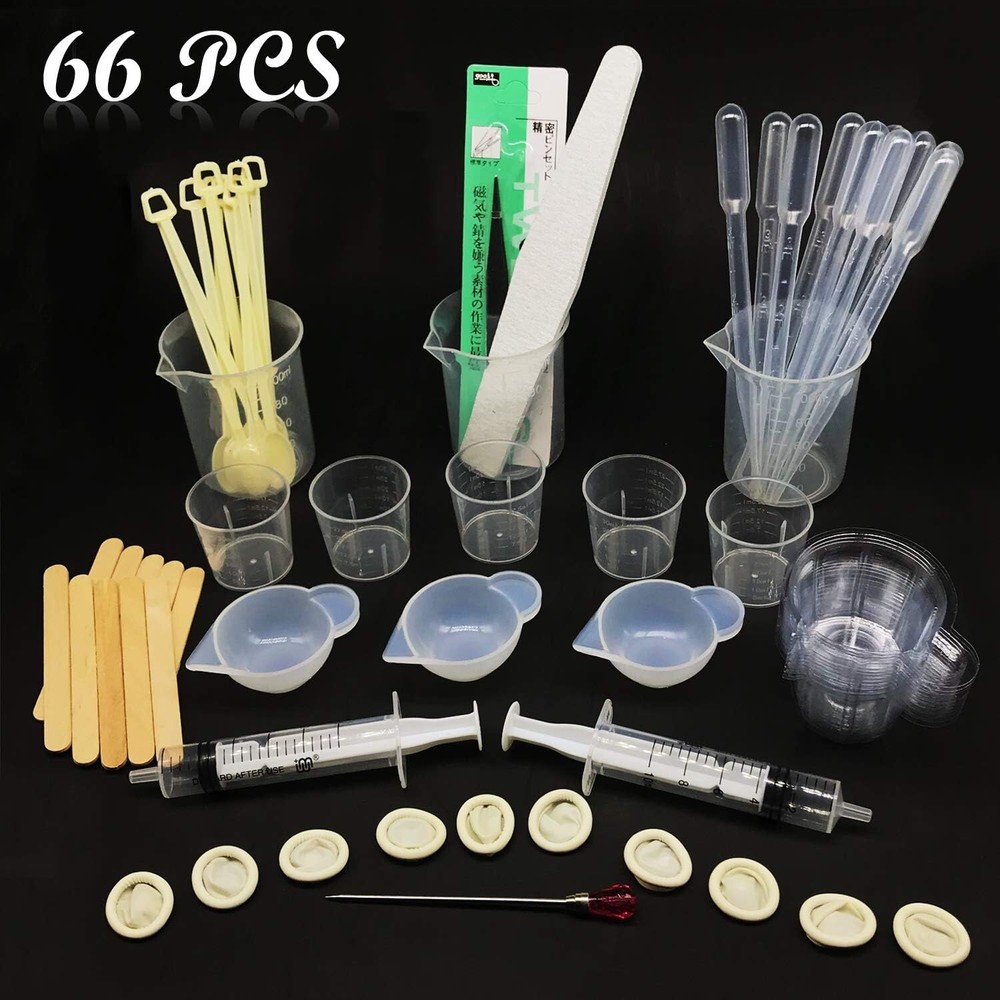 66 PCS Epoxy Resin Tools Kit, Silicone Mold Tool Included Measuring Cup, Silicone Mixing Cups, Tweezers with Mixing Sticks, Dropping Pipette, Finger Cots, Sanding Strip for Jewelry DIY {13 PCS Mixing Cups}: 3 PCS is silicone and 10 PCS is plastic, mixing cups can help you color, dispense glue or mixed powder, a rich quantity to meet your needs. {6 PCS Measuring Cup}: 3 PCS is 30ml, 3 PCS is 100ml. Graduated plastic reusable cups, Imprinted in both fluid ounces and milliliters to provide clear and easy read. {10 x Dropper, 2 x Syringe, 10 x Plastic Spoons and 10 x Wood Stirrers} Dropper and syringe can help you accurately inject glue, plastic spoons help you transfer the powder or the accessories you want to place, and the wood stirrers helps you mix the glue. Perfect tool combination: Tweezers help you pick up the jewelry, put the filler into the glue. Punctuation needle can be used for poke the bubble of the epoxy making process. Sanding strip can be used for the finished glue, make smoothed; Finger cots protect hands and make cleaning easier. Surprise gift for suitable for silicone jewelry DIY: many DIY handworks, such as earrings, necklace, jewelry pendant and so on, then you can send them to your families or share your craftsmanship with your friends and family, enjoy happy times.