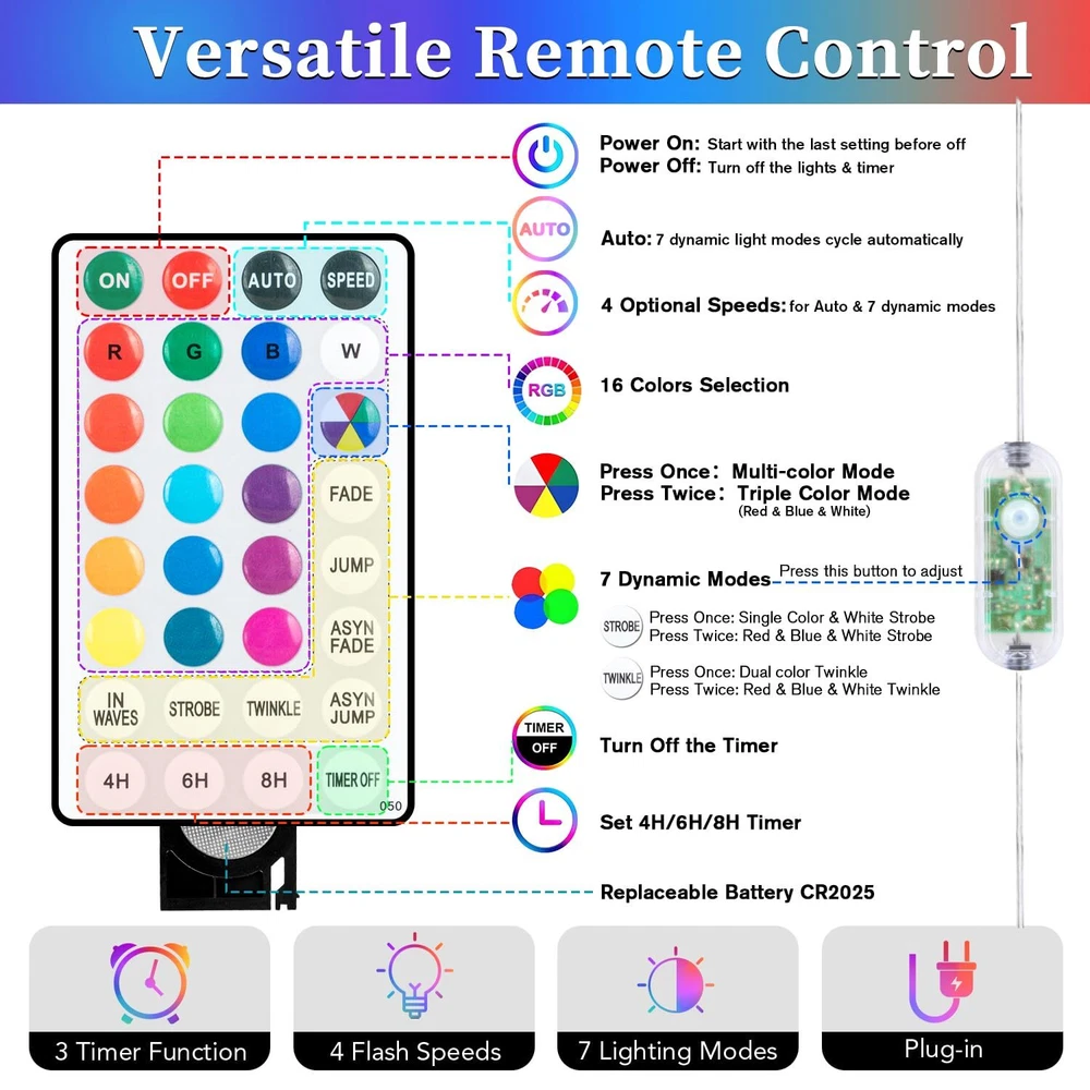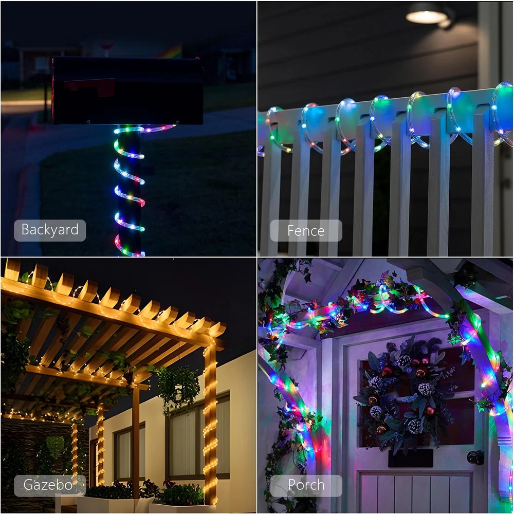 16 COLORS CHANGING STRING LIGHTS: With 16 vibrant colors to choose from, our outdoor led lights are perfect for adding a touch of color and creativity to any occasion. Whether you want to set a romantic mood with soft pinks and reds on Valentine's Day, celebrate St. Patrick's Day with festive green, or create a fantastical ambiance with orange and purple for Halloween, these lights meet your requirements. MEMORY & TIMER FUNCTIONS: Our rope lights are equipped with a multifunctional remote that allows for your customization. With the timer function, you can set the lights to automatically turn off after 4, 6, 8, or 24 hours. The remote also allows you to adjust the speed of the 7 lighting modes with the “speed” button. Additionally, the memory function ensures that the lights will remember your last setting even after being turned off by the remote, eliminating the need to reset them every time. VERSATILE LIGHTING MODES:With 7 lighting modes to choose from, you can easily set the perfect ambiance for any occasion. The available modes include Fade, Jump, ASYN Fade, ASYN Jump, In Waves, Strobe, and Twinkle. With upgraded color options available, you can brighten up your Christmas decorations with multicolored modes. If you're decorating for July 4th, simply press the multicolor button twice to switch to the red, white, and blue lighting modes. IP67 WATERPROOF: Our led rope lights are designed to withstand various weather conditions, including rain, wind, snow, and fog, making them an ideal choice for outdoor & indoor decorations. Whether you're hosting a party, celebrating Christmas, Halloween, Thanksgiving, or any other special occasion, our rope lights are a perfect addition to your decor. WIDELY INDOOR & OUTDOOR USED: The IP65 waterproof rating of these led rope lights outdoor waterproof makes them suitable for a wide range of indoor and outdoor uses. You can wrap them around a tree, backyard fence, or porch for a festive touch, or use them to decorate your living room or bedroom. They're also great for outlining your deck, window, door, pathway, or walkway. EASY TO INSTALL: The sturdy yet thin covering makes it easy to wrap the lights around any surface or object. Additionally, our colored rope lights are lightweight, making them easy to maneuver and install. The lightweight design allows for simple installation using either clear packing tape or clips.