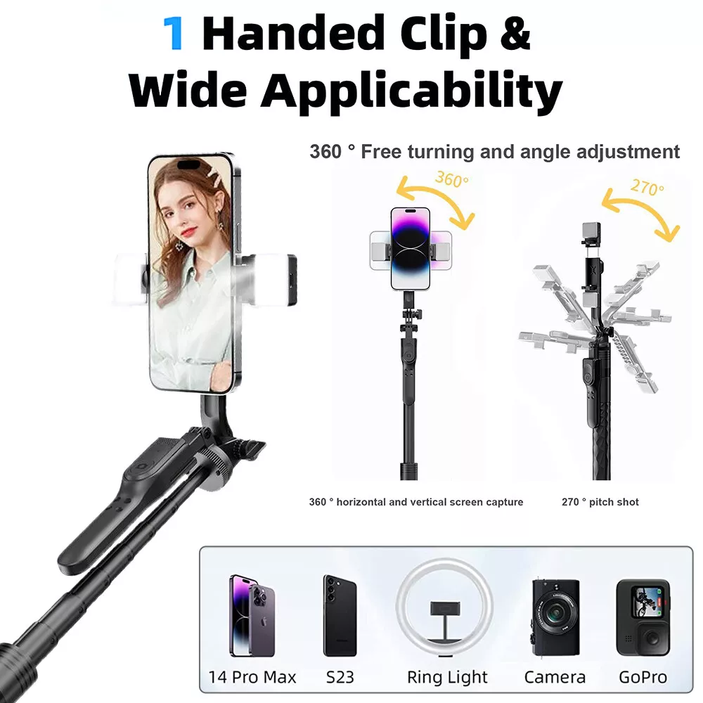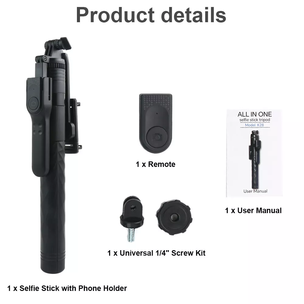 About this item 【With Phone Holder】The phone holder of the tripod can be rotated freely 360°, you can quickly rotate horizontally or vertically to shoot without taking off your phone. The size of the phone holder can be adjusted to a range of 2.56''~3.94''(6.5-10cm), suitable for 4-7 inch iOS&Android phones. Compatible with iPhone 14 Pro max/ iPhone 14 Pro/ iPhone 14/iPhone 13/13 Pro Max, iPhone 12/12 Pro/12 Pro Max, Samsung Galaxy S10/S9/S8, Huawei P40/P30/Mate 40/Mate 30, and more. 【with 1/4 screw】It is suitable for Optical Camera, digital camera, ring light, fill light, Small Photography Lights, zoom lights, phone, camera, webcam, Use with video lighting and photography accessories or as a webcam tripod for video conferencing, also works great as a tripod for light for YouTube or TikTok videos. 【Super Safe】Height Adjustable Extended from 32.5cm/12.8 inches to 175cm/ 68.9 inches, the height can be flexibly adjusted to fully meet the needs of various shooting heights. The tripod base is designed with an umbrella-shaped skeleton structure, which strengthens the load-bearing capacity and anti-slip ability. which the non-slip rubber feet can provide a firm grip and strong friction to make the tripod more stable, anti-twist and anti-shake. 【Durable & Portable】The tripod is made of aluminum alloy and ABS plastic, high quality and durable, sturdy and anti-corrosion. The minimum length of the tripod is only 32.5cm/12.8 inches, which you can easily fit it in a chest bag or handbag. This phone tripod with remote only weighs 0.66 lbs, this portable tripod is the perfect choice for outdooactivities such as traveling, hiking or camping. 【10M Wireless Remote】 Liberate your hands and enjoy taking pictures remotely with our selfie stick tripod with remote. It will keep stable up to 33ft/10m and is compatible with most smartphones such as Android and iPhone. SPECIFICATION: Material: Aluminum Alloy Battery Type: 110mAh CR1632 Stretchable Length: 175cm/ 68.9 inches, Fold Length: 32.5cm/12.8 inches Bluetooth Compatibility: iOS 5.1, Android 5.0 and above Work Mode: Phone Tripod Stand & Selfie Stick Maximum Load: 1KG Remote Control: 33ft Item Weight : 380g Package : 1 x Selfie Stick with Phone Holder 1 x Remote 1 x User Manual