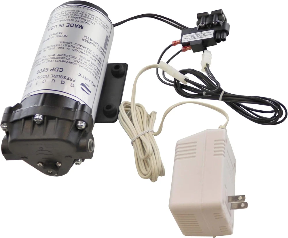This pump kit includes Aquatec pump 6840-2J03-B224 with heavy duty steel base plate with damper, PSW-240 pressure switch, transformer 110V USA plug, 1/4" inlet/outlet for pump and pressure switch, detail instruction This pump is designed to increase the water supply pressure to a RO water system. Increase input pressure from 30-40 psi to 60-80 psi depending on the capacity of your RO system. This pump is good for under 100 GPD (gallons per day) RO systems Most home drinking RO systems are under 100 GPD Automatic ON/OFF operation. The pressure switch would sense the pressure in the output line, so when the output line is shut off or the storage tank is full or reaches 40-50 psi, the pump would shut off, and then when you start using water and tank pressure drops, then the pump turns back ON to replenish the tank. This kit DOES NOT come with the optional (ESO) Electric-Shut-Off solenoid valve, so it would reply on your existing mechanical auto-shut-off valve in your RO system to turn off the water supply when the tank is full. For most systems this kit will work fine. This kit is NOT for misting, ice maker line, line boosting, water transfer. This pump kit is designed for increasing water supply pressure to a RO water system FAQ: If your RO system is not working, not able to make water, not able to turn on/off correctly, then this pump will NOT help. This pump is not able to fix a non-working RO FAQ: The pressure switch may need adjustment after install. If the pump does not shut off after the tank is full. That may indicated the mechanical shut off valve in your RO system is interfering with the pressure switch. FAQ: Please contact our tech support through Amazon messages if you have issues with the setup. It is impossible to have defective product. If your water supply is from a well or the water supply pressure is below 50 psi, then it is recommended that you add this pump kit to your RO system setup to increase the water supply pressure to 60 to 80 psi range to optimize the performance of your RO system. PLEASE MAKE SURE your RO system is in working condition, and it can make water and turn on/off correctly. If your RO system is not working correctly or not making water, then you need to fix the RO system and replace filters. This pump is not able to fix a non-working RO system. Quiet operation, 1 year factory warranty. Made in USA pump and pressure switch.