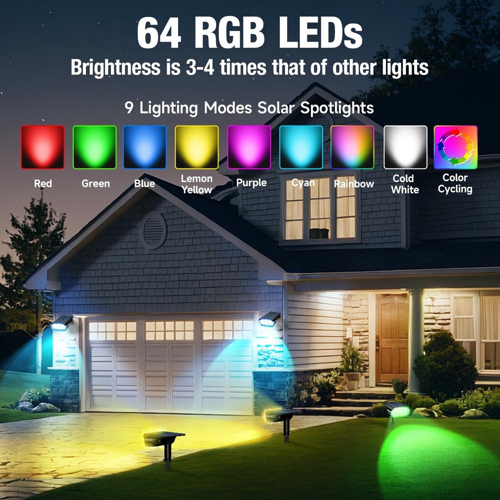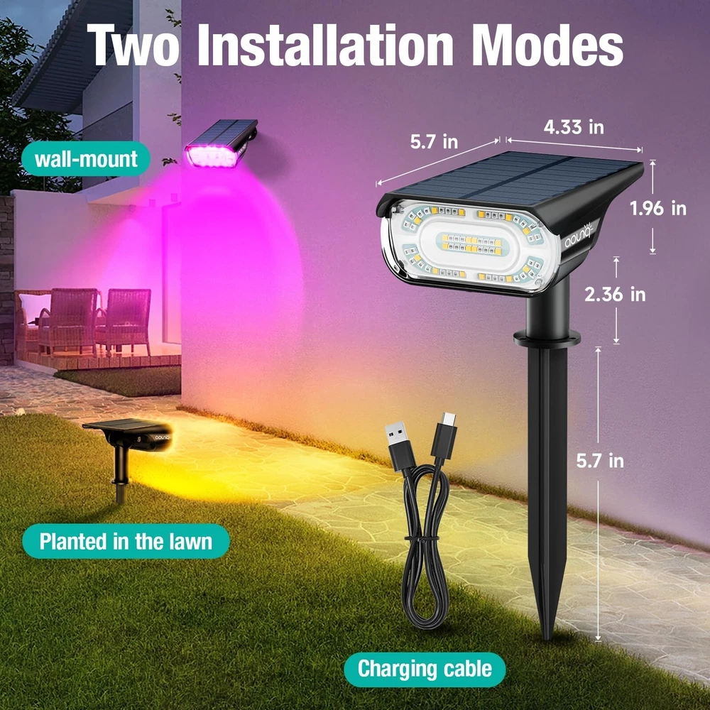 68 LEDs RGBW Solar Spot Lights Outdoor, 1000 Lumens 9 Lighting Modes Color Changing Solar Outdoor Lights, IP67 Waterproof Solar Spotlight 2-in-1 Landscape Garden Light for Yard Patio, 4 Pack Product Details Color: Multi-colored-4Pack Brand: AOUNQ MPN: AO-AO-USA 64LED Color UPC: 726929081462 EAN: 0726929081462 Brand: AOUNQ Color: Multi-colored-4Pack Material: High-impact ABS Plastic, High Efficiency Monocrystalline Silicon Style: Garden Light fixture form: Spotlight Product Dimensions : 5.7 x 4.13 x 9.84 inches; 2.42 Pounds Item model number : AO-AO-USA 64LED Color Batteries : 1 Lithium Ion batteries required. (included) Date First Available : September 20, 2023 Manufacturer : AOUNQ Country of Origin : China Customer Reviews: 4.0 4.0 out of 5 stars 253 ratings Brand: AOUNQ Color: Multi-colored-4Pack Material: High-impact ABS Plastic, High Efficiency Monocrystalline Silicon Style: Garden Light fixture form: Spotlight Room Type: Yard Product Dimensions: 5.7"L x 4.13"W x 9.84"H Specific Uses For Product: Provides bright and beautiful lighting for patios, decks, porches, walls, gardens, landscaping, pathways, flags, decorations, lawns, backyards, and more Indoor/Outdoor Usage: Outdoor Power Source: Battery-powered, Solar-powered, Or USB Charge Installation Type: 2-IN-1 Solar Spot Lights Outdoor: 1.With ground stakes and wall mounts. you can easily insert it into the ground as a solar landscape lights.2.Use screws (included) to fix it on the wall as a wall light Special Feature: Adjustable Color Temperature, New Super Bright 64 LEDs Solar Outdoor Lights for Yard Control Method: Touch Light Source Type: LED Finish Type: Polished Number of Light Sources: 64 Voltage: 5.5 Volts Theme: Flag Light Color: Multicolor Included Components: 4-pack lights in One Package, Each light consists of 64 led light Bulbs. Lighting Method: Adjustable Item Weight: 2.42 Pounds Number of Items: 4 Wattage: 2.1 watts Controller Type: Push Button Switch Type: Push Button Unit Count: 4.0 Count Water Resistance Level: Waterproof Brightness: 1000 Lumen Mounting Type: Wall Mount Fixture Type: Non Removable Assembly Required: No Manufacturer: AOUNQ UPC: 726929081462 Recommended Uses For Product: Light up trees or flags, porches, paths, swimming pools, patios, gardens, garages, driveways, paths, and more. Model Name: AO-AO-USA 64LED Color Part Number: AO-64-color Item Weight: 2.42 pounds Country of Origin: China Item model number: AO-AO-USA 64LED Color Batteries: 1 Lithium Ion batteries required. (included) Finish types: Polished Special Features: Adjustable Color Temperature, New Super Bright 64 LEDs Solar Outdoor Lights for Yard Batteries Included?: Yes Batteries Required?: Yes Bulb Features: Dimmable Color Temperature: 6500 Kelvin Date First Available: September 20, 2023 Super Bright 64 LEDs RGBW Solar Landscape Spotlight: The upgraded outdoor solar spotlight is equipped with an astonishing 64 RGBW LEDs (market leading), scientific and efficient LED arrangement makes it easy to generate 2700K~6500K+ 120o wide angle light output up to 1000 lm. Solar Spot Lights create the perfect lighting effect whether installed in the garden, yard or garage, pathway, etc. And let you enjoy the beautiful colored lights on the dark night without paying high electricity bills. 9 Lighting Modes of Outdoor Solar Lights & Auto ON/OFF: The solar lights outdoor waterproof have 9 lighting modes set to meet your needs in different scenarios-White, Rainbow, Red, Green, Blue, Lemon Yellow, Purple, Cyan, Color cycling, you can switch between modes by button. The solar panel of the solar spot lights have a light sensor, which can be automatically turned on and off according to the change of light in the environment. High-impact Material & IP67 Waterproof: High-strength PC+ABS material and thickened waterproof silicone layer design make the solar spotlights outdoor waterproof have strong IP67 waterproof and High-impact characteristics, can withstand the minimum -4F, the maximum 160F the external ambient temperature. Whether it is severe weather such as storm, heavy rain, snow, high temperature or other extreme weather, you can use solar lights with confidence. Efficient Solar or USB Charging & Longer Lighting Time: In addition to being equipped with larger area, more efficient polycrystalline silicon solar panels and 2000mAh battery, spot lights outdoor also supports "solar or USB charging" charging method, which can provide you with up to 20+ hours of lighting time in daily life; even in continuous cloudy days or lack of sunlight in winter, it can be powered by a USB charging cable (included) Fast charging, easy to solve your electricity anxiety. BUY "ONE" GET "TWO" - 2 In 1 Function & Easy Installation: With ground stakes and wall mounts, you can easily insert it into the ground as a solar landscape lights to illuminate your palm trees, agave, etc. It is fixed to the wall as a solar wall lights (with screws) to illuminate flag or wall. Both installations are easy to install and perfect for house, front door, yard, patio, fencing, garden, swimming pool, garage, driveway, pathway, porch, deck, flower bed and landscape lighting and more.