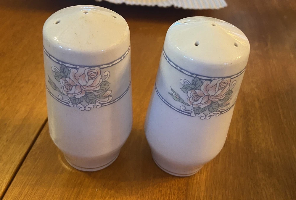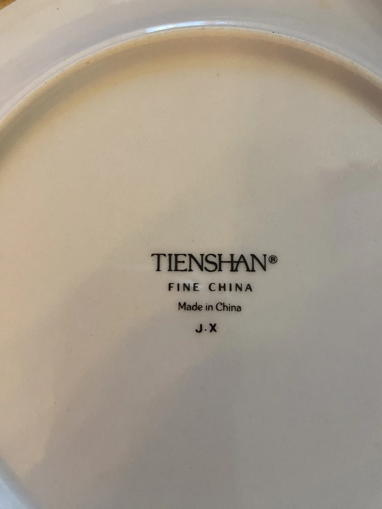 This is a 69 piece set of Tienshan roses with gold trim ‘Regency’ pattern fine bone China in great condition - not a single chip or crack anywhere. (salt & pepper shakers even have the original stoppers) 12 Dinner Plates 10 1/4” 12 Salad Plates 7 1/2” 12 Bowls 7 1/2” 14 Footed Tea Cups and 12 Saucers 6” 1 Coffee (or tea) Pot with lid 1 Creamer, 1 Sugar Bowl w/lid 1 Set of Salt & Pepper Shakers 1 Serving Bowl 9 1/4” 1 Serving Platter 9 3/4” x 14” Prefer to sell as a complete set, but open to offers on individual pieces.