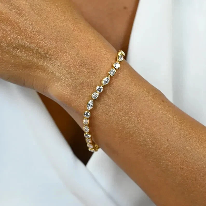This 6Ct Round Simulated Diamond 925 Yellow Sterling Silver Women's Tennis Bracelet features a dazzling design with a tennis link chain and a snap closure. The bracelet is handmade with sterling silver and showcases a round simulated diamond as the main stone, set in a bezel style. It has a personalized touch, adjustable length, and is engraved with various themes like Beauty, Fashion, Love, and more. Ideal for special occasions like Engagement, Anniversary, Birthday, or Mother's Day, this elegant piece is nickel-free and comes with a seller warranty for added assurance.