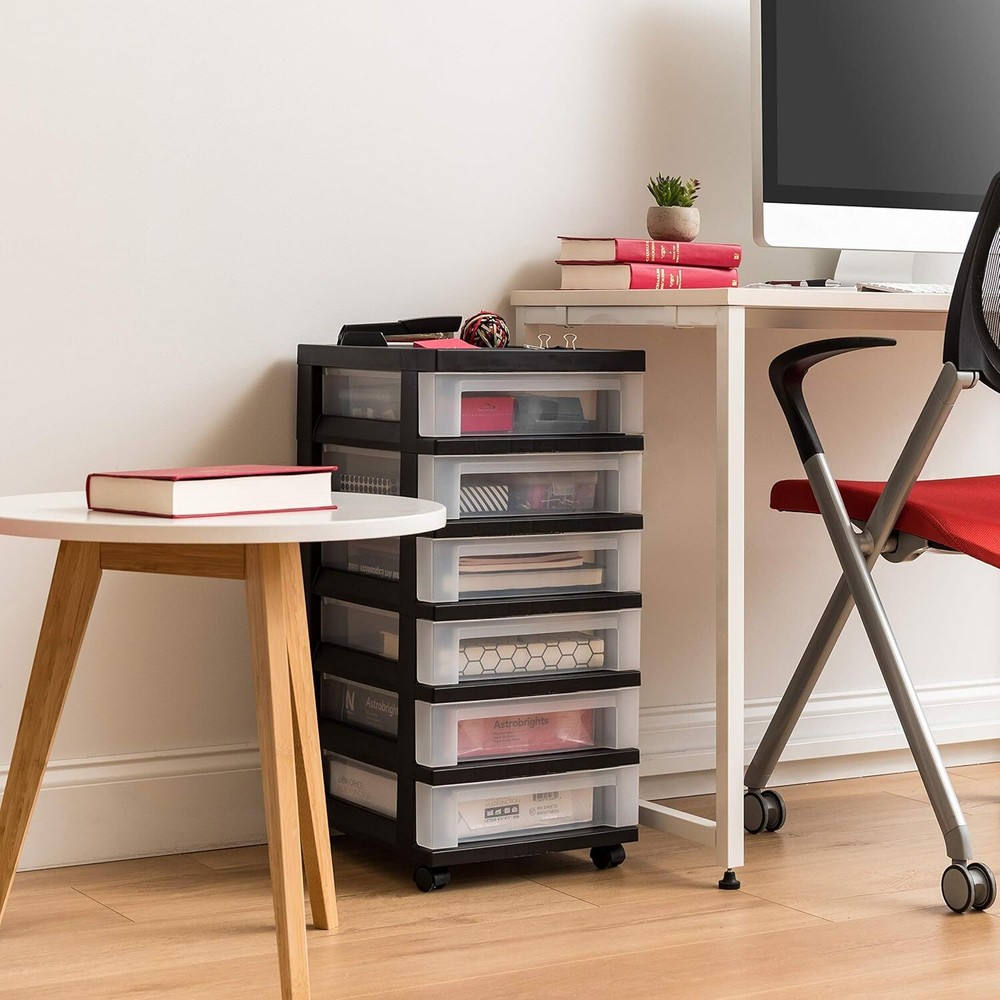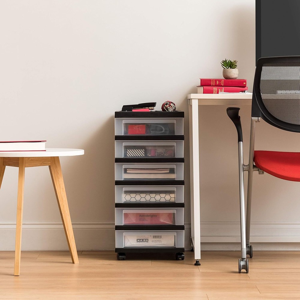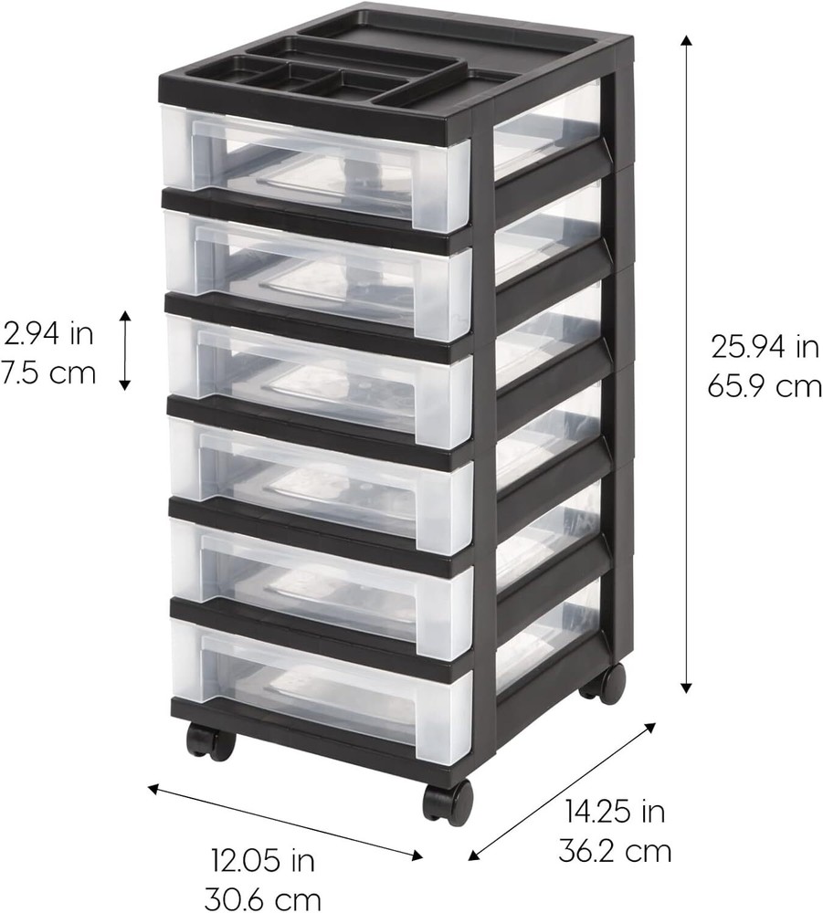 About this item Multi-purpose organizer : Store a variety of household items that are frequently used in the office, closet, under-desk, kid’s room, craft room, nursery, or dorm room Mobile storage solution : Removable wheels are included, can be attached to the foot of the chest so you can move it around smoothly, or remove them for secured placement Made in USA : High-quality materials are used for our domestically-manufactured products. The sturdy plastic makes these durable, and the smooth glide drawers give you easy access to contents. We use recyclable material, so our products are green-circle certified. Drawers : Drawer stops are attached on both sides of drawers to prevent drawers from falling out. Entire Dimensions: 14.25"D X 12.05"W X 25.94"H, Drawer dimensions: 12.5”D X 9.5”W X 2.94”H User guide Required Assembly No Measurements Item Weight 2.5 Pounds Item Dimensions D x W x H 14.25"D x 12.05"W x 25.94"H Additional details Number of Drawers 6 Color Black