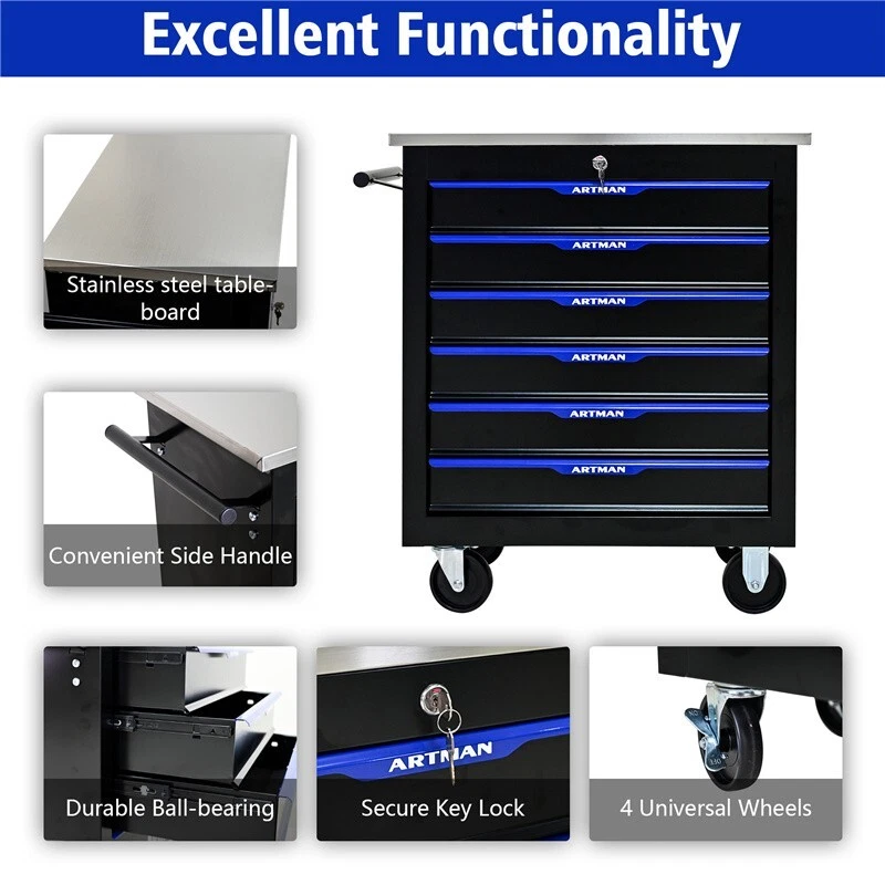 Features and Details: 6 drawers with wheels multi-purpose tool car, black and blue color with more durable The tool box is also lockable and can be used as a removable, attachable and mobile case The opening and closing of the drawers of the tool cabinet is very gentle thanks to the ball-bearing drawers The robust and powder- coated steel construction is used for high wear resistance. This assembly trolley has 4 steering wheels, 2 of which with parking brakes, so you can move the trolley freely in the garage, but also stop in one place This is a set of cabinets, can use a round hook at the bottom of the table to connect another tool car, thus forming a combination. Smooth steel countertops are cleaner and more durable. Specification: Color: Black+Blue Material: Cold Rolled Steel Surface Finish: Powder Coating Powder Coating: 4" Casters (2PCS with brake and 2PCS without brake) Item Size (with wheels and countertops) : 25.91*13.58*26.46INCH Size (with countertops): 25.91*13.58*25.98ICNH Item Weight: 59.52LBS