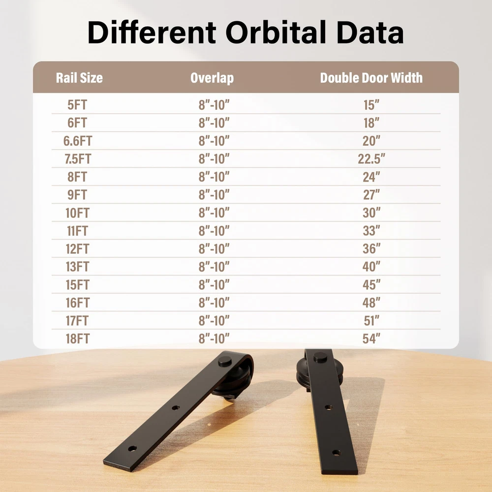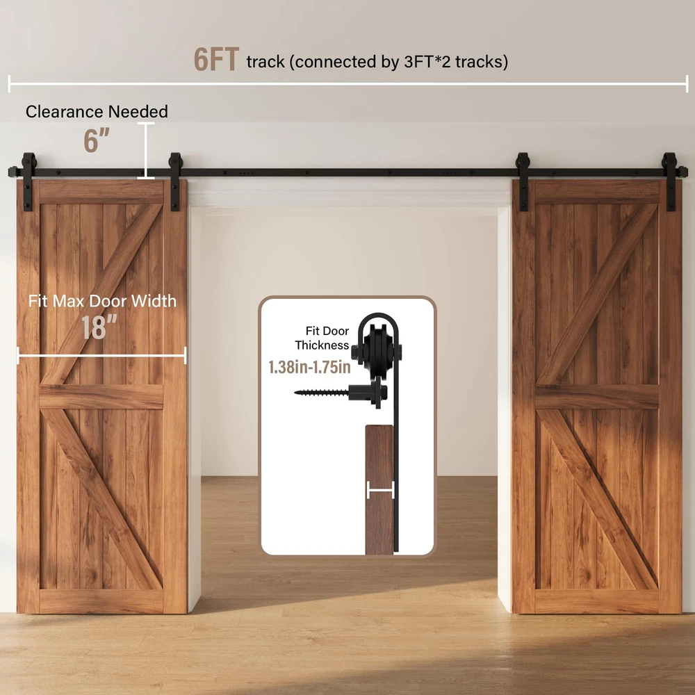 Sturdy and durty barn door hardware: The side-mounted sliding barn door kit is made of high-quality carbon steel, that can ensure durability and studity to support barn door weight up to 277 lbs. The surface of barn door track is adhered to a fine black powder coating by high temperature to ensure that it can be used for a long time. How to choose the Double barn door hardware kit: The sliding door track length should be at least double the door width. And there should be a minimum of 5.1" gap between the barn door and the ceiling.Fit door panel width: 32", door panel thickness: 1 3/8" - 1 3/4". It can be paired with wood barn door, closet door, MDF barn doors, and more.(If you have thicker door, contact us and longer pipe clamp screws can be supplied) Quiet and smooth sliding door hardware: The high-quality carbon steel track kit ensures barn door slide smoothly. J-Shape barn door rollers can provide smoother rolling. With carbon steel anti-hopping block and stopper for stable movement and long useing. Easy to install: The barn door hardware kit package include:(1) 2 X 3FT Tracks (5) Wall Connectors (4) Rollers (4) Door Stoppers (2) Floor Guide (1) Installation manual; All necessary hardware is included. And we can provide installation video to make you easier when install the barn door kit.This sliding door hardware takes up to 2 people to install in 40 minutes. If you have any issues, please let us know, and we will do our best to assist you.(DOOR NOT INCLUDED) Versatile sliding barn door hardware: The black barn door track provides a sleek, modern look that can complement various interior design styles, from rustic to industrial, including residential homes, offices, and commercial spaces. Barn door hardware kit allow doors to slide parallel to the wall, saving valuable floor space compared to traditional swinging doors. This makes them ideal for smaller rooms or areas with limited space.