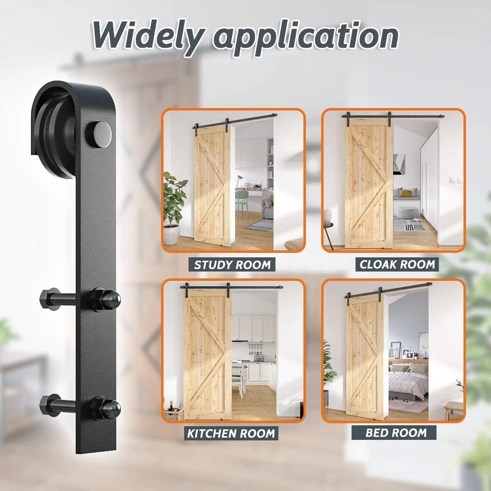 6FT Barn Door Hardware Kit [HIGH STANDRAD MATERIAL]Barn door rail,Barn door roller arm are made of carbon steel in 1/4" thickness,Great performance on hanging doors. Barn door wheels are POM made,More sturdy than steel,Smooth and Quiet during sliding , protect both of track and roller ,ensure the barn door system will last long. [STEP BY STEP INSTALLATION]"IMPORTANT:ONLY BARN DOOR HARDWARE KIT INCLUED,BARN DOORS ARE NOT FOR SALE". Manual included,just follow it from step A to Z.Normally it take 30-60 mins to install the whole system based on different installation conditions.In case you find you are missing parts after received the package or you have more doubt on installation ,kindly contact us for the missing part or your questions ,we will get back to you in 24 hours. [BARN DOOR HARDWARE KIT ]Color:Matt Black(black powder coated),Condition Type:New; Main Material: Carbon Steel,Door weight capacity: 250 lbs; Fit for maximum panel width: 36"; Bolt for barn door roller fit for door thickness from 1-3/8" to 1-3/4";Need at least 6" clearance from top of barn door to ceiling.the barn door track hole spacing is 16" pre-drilled. [PACKAGE CONTENT] 5 x barn door track, 5 x wall spacers with leg screws, 2 x barn door stoppers, 2 x barn door rollers, 2 x anti jump pads, 1 x barn door floor guide, 1 x instruction [WHY US] We are a leading manufactory of barn door hardware for more than 10 years ,all sets barn door hardware track kit have been inspected before leaving our warehouse,barn door rollers have been tested over 1000,000 times opening and closing cycle .You can get heavy duty barn door kit here with a manufacturer price,why not ? In case you got any confustion during shipping ,kindly feel free to submit a question or contact us via amazon directly ,thank you .