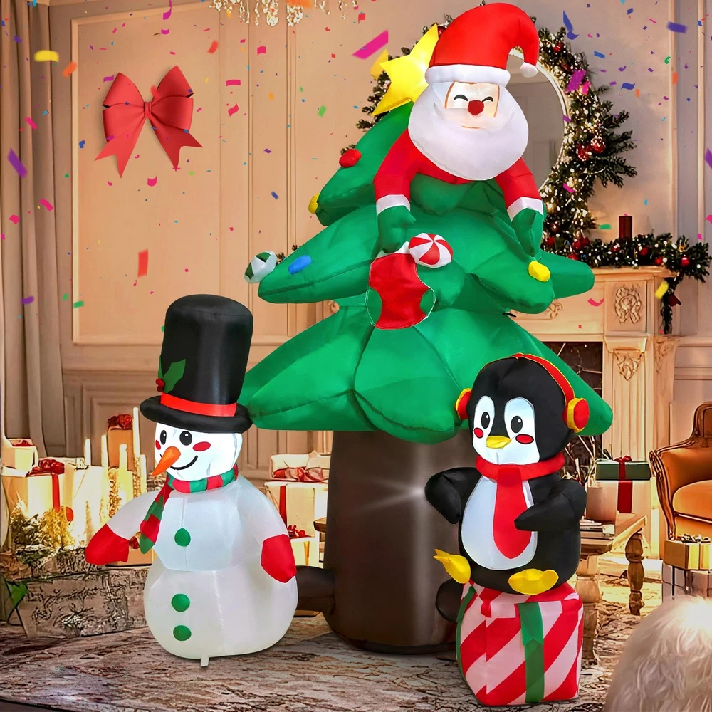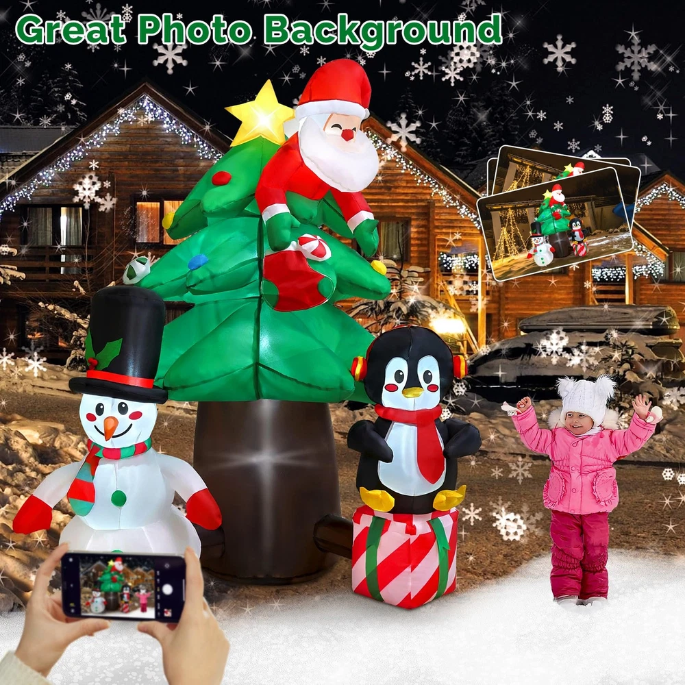 Inflatable Christmas Tree 【Christmas Inflatable Tree Decoration】 6FT high inflatable Christmas tree decoration, Santa Claus lying on the lovely Christmas tree, penguin sitting on the gift box, snowman in holiday attire, waiting for Christmas with great anticipation, waterproof and durable 1 minute to complete the inflatable, placed in your yard, party, outdoor are very suitable 【Waterproof and Durable】 Our Christmas inflatable decorations are made of high quality polyester fiber to ensure waterproof and durable. Equipped with windproof rope, ground stake and extended power cord, it is safe and easy to use both indoors and outdoors. No need to worry about the Christmas yard inflatable tree being blown away by the wind, the ropes and ground stakes will keep it securely 【Built-in Led Lights】 Our inflatable Christmas trees are equipped with bright festive LED lights inside, enhancing the evening's holiday spirit and making your Christmas yard decoration a big hit, attracting children, neighbors and guests 【Easy to Inflate】Our inflatable decorations come with a powerful blower for quick inflation, just plug it in and it will be inflated in a minute. Please make sure the zipper is closed and the blower is not blocked when you use it. Turn off the power when storing, convenient and quick 【After-sales Service】 If you have any questions or concerns when using our products, our professional customer service to reply to you, we will respond to your information within 24 hours to help you solve the problem quickly