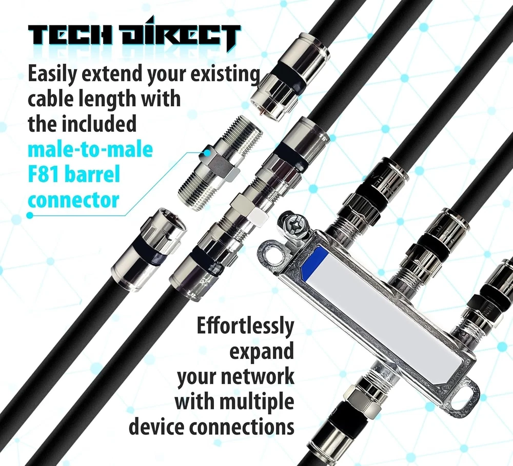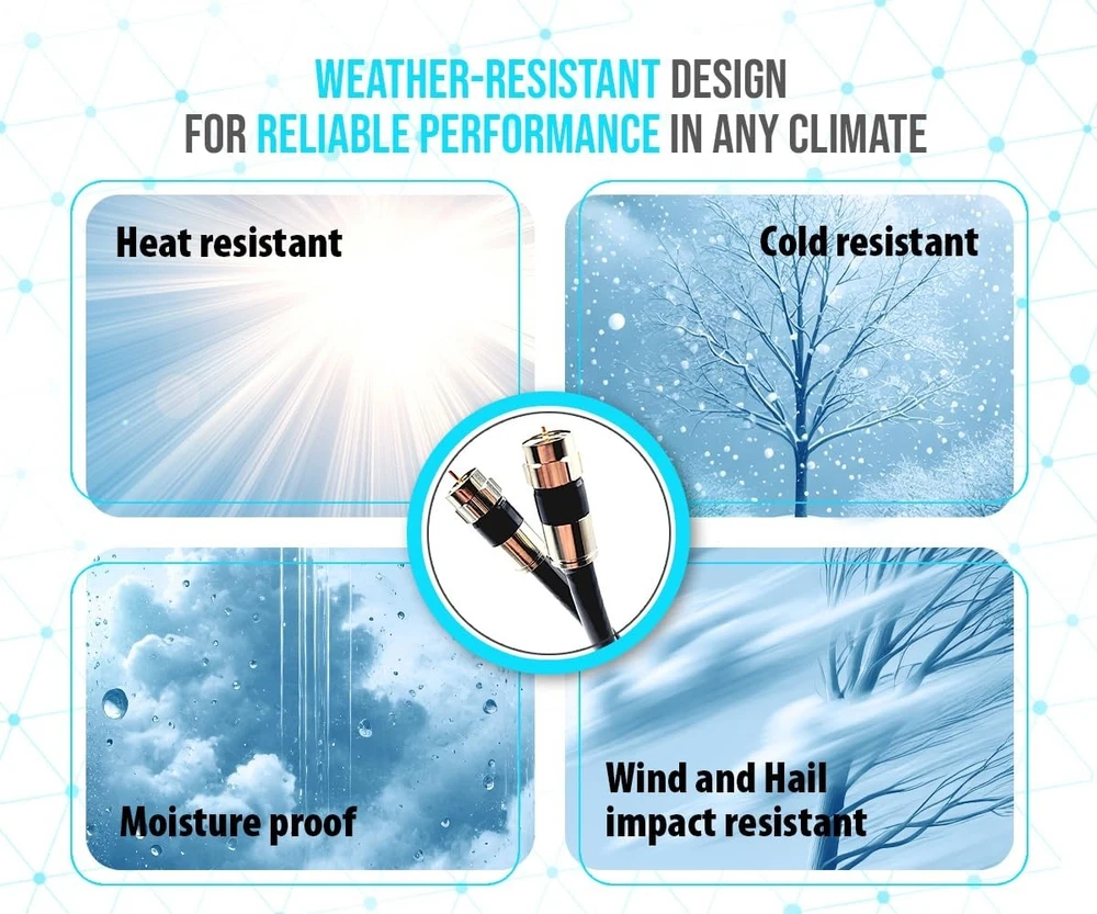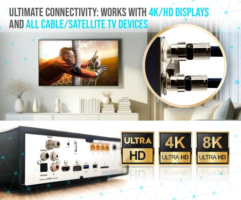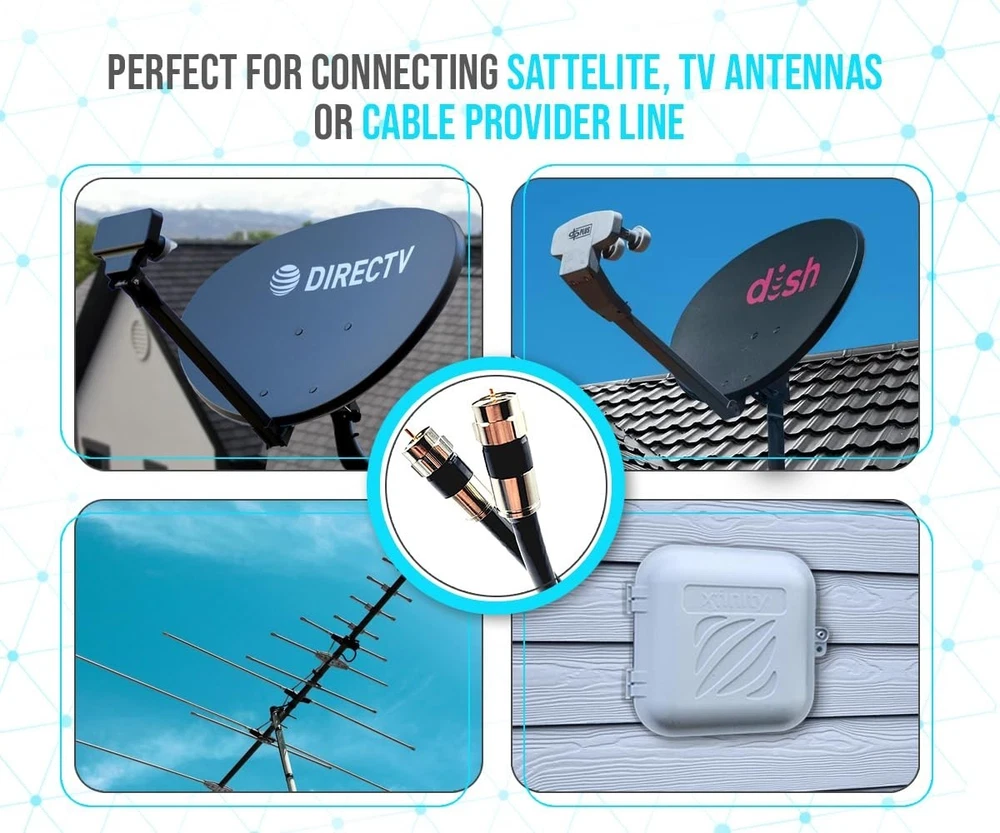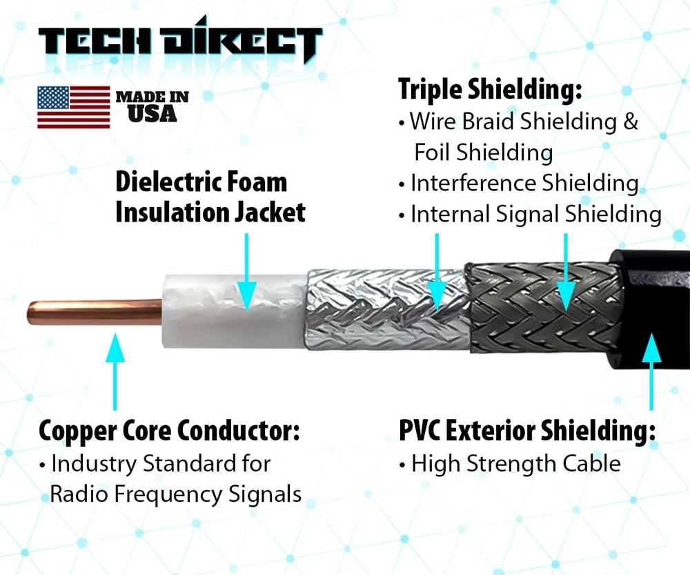 6FT RG6 Coaxial Cable Black - High Speed Internet & Satellite TV - Broadband RG6 Coax Low Loss Extension Wire with Connectors Improved signal and picture quality: The advanced shielded design prevents interference and distortion, so our coax cable transmit data faster & reliable. Watch your favorite program without any buffering with this antenna wire. Less loss, higher frequency: Our coaxial cable RG6 has a conductor size of 18 AWG and impedance at 75 Ohms. That means this thin coaxial cable can handle frequencies from to , even in the long run. Long-wearing: Our coaxial RG6 cables are safe and long-lasting for indoor and outdoor use. Widely-used: We’ve tested every indoor and outdoor coaxial cable for signal quality. You can use our high-speed coaxial cable with confidence for any modems, air antennas, satellite dishes, and other services. Made in the USA: All our products are backed by 10- quality commitment and customer support. Order our 2, 3, 5, 6, 10, 12, 15, 20, 25, 30, 50 or 100 coaxial cable for better sound and picture quality. Level-up your browsing experience No more unstable connection, weak signal, and interrupting programs. Our high-speed cable/TV coaxial cable is engineered to maximize signal transmission and minimize interference, saving your time and preventing stress. Reasons to choose our coaxial cable extender: Less loss, more speed: Our flexible coaxial cable features enhanced 60% braided aluminum and 100% aluminum foil shielding, which makes it less susceptible to interference (EMI or RFI) for better signal quality. The thicker copper conductor (18 AWG) increases its bandwidth, so this cable transfers data faster. Widely-used: Thanks to the effective 100% shielding, our coax cables handle high frequencies, from to , even on the long runs. They’re handy to connect TV sets, modems, air antennas, satellite dishes, and other services to carry any form of data. Durable and easy to install: Our 2, 3, 5, 6, 10, 12, 15, 20, 25, 30, 50 or 100 coaxial cable in white, black, or a direct burial cable/TV wire are made in the USA of high-quality metal, resistant to breaking and scratches. However, for best results, try to avoid sharp bends. The solid outer layer maintains great flexibility, which makes installation a breeze. Safe: The flame retardants and stronger insulation on this CB coax cable will prevent fire. In addition, our black and direct burial cable has a long-wearing PVC outer covering, resistant to UV and extreme weather conditions, making it perfect for indoor and outdoor use. Double-sealed: The RG6 quad shield coaxial cable has a coaxial cable connector on each end. Please, try to keep the cable connectors tight to avoid signal loss. Our outdoor cables feature 360 degrees weatherproof rubber boots to ensure no condensation can enter the insulation sleeve. Choose our digital coaxial cable in the required length (from 2 to 100 feet) to enjoy stable, high-speed signal quality.