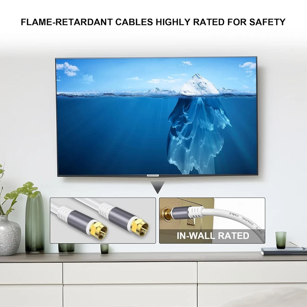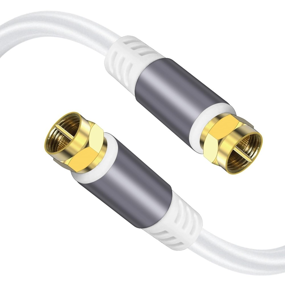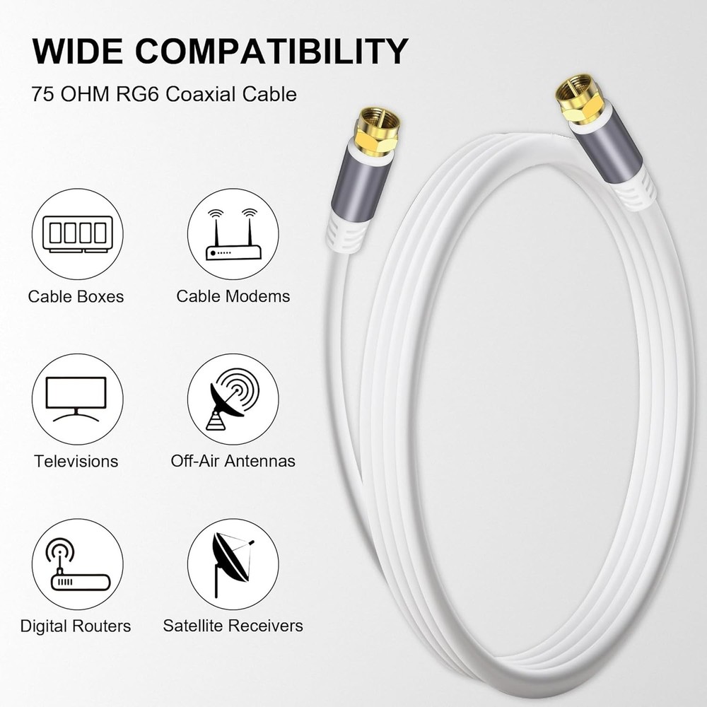 RG6 Coaxial Cable 6FT,Low Loss High Speed Coax Cable Cord Extender for HD TV, Dish, Satellite, Antenna, TV Cable White, 6FT High Performance: This RG6 coaxial cable delivers high-speed data transfer for HD TV, satellite, antenna, and other applications. Durable Construction: Featuring a solid copper conductor and quad shielding for optimal signal transfer and minimal interference. Low Signal Loss: Advanced design minimizes signal loss, ensuring a clear and consistent signal over long cable runs. Flexible Cable: The flexible yet sturdy cable construction allows for easy installation in tight spaces. Compatibility: Compatible with various devices and systems, including cable TV, satellite receivers, antennas, and more.