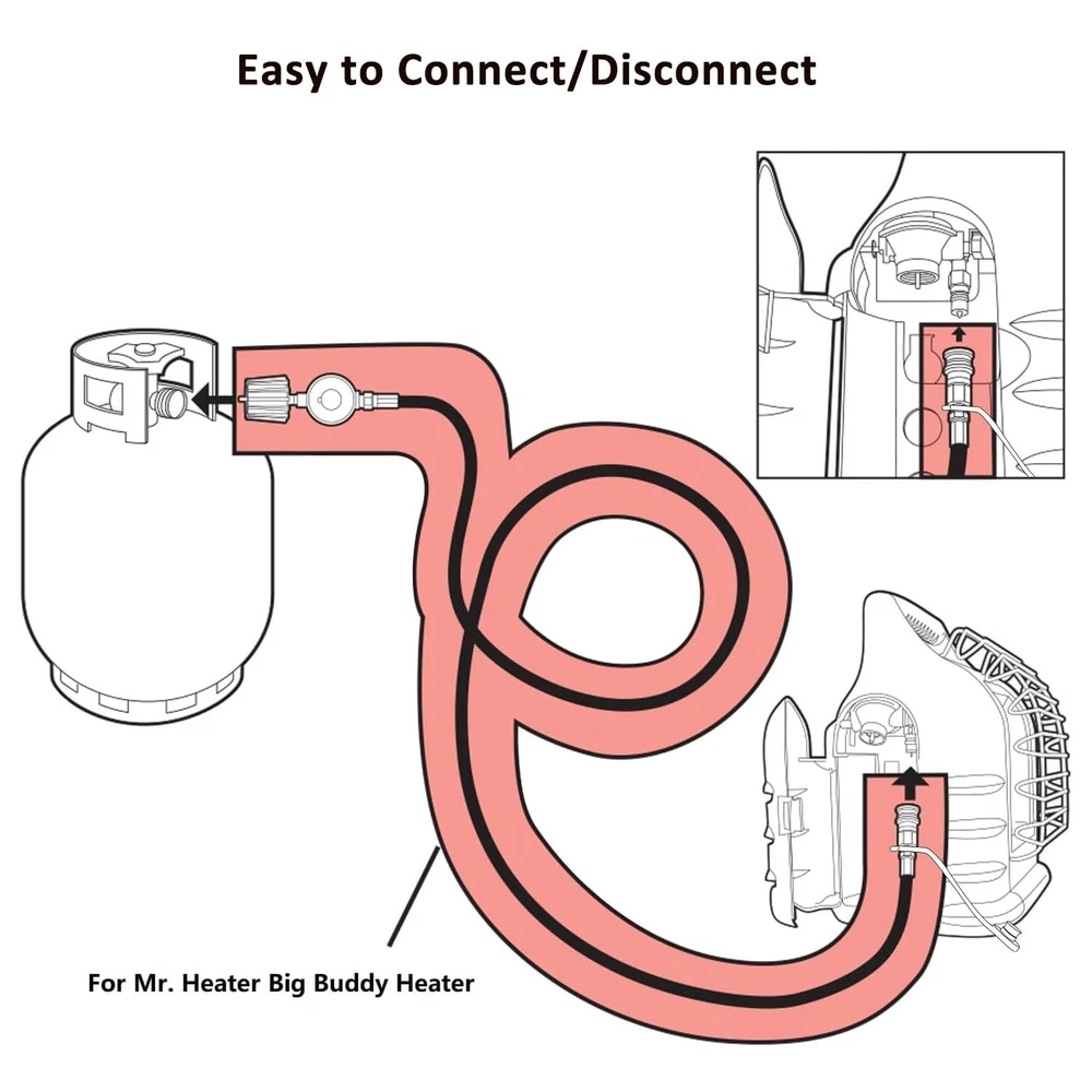 Perfect and Use Only for Mr. Heater Big Buddy Heater. The propane regulator hose assembly replacement for use on Mr. heater MH18B & F274830 Big Buddy indoor & outdoor heater. This is exactly the hose you need for you Mr. Heater Big Buddy, don’t need filters using a direct connect hose. 3/8” Quick Connect & QCC1 connection (Type 1) & Regulator. Female quick connect fits standard 3/8 male quick connect (SAE fitting). QCC 1 connection hook to a 5lb-40lb propane tank cylinder. Easy to Connect. Enjoy your Big Buddy Heater by using 20lb propane tank as quickly as the 1lb canisters, but no more worrying the 1lb tanks are running out of heat. 3/8 inch female quick connect fitting for easy hook up your Mr. Heater Big Buddy propane appliance. High-Quality Material and Construction. CSA certificate passed. Hand wheel and solid brass fitting provide tight connection between propane tank and appliances. Enough Lengthy & Flexible to Get Job Done. 6-Feet length delivers the gas in a steady flow, expands your ability to take propane device anywhere.