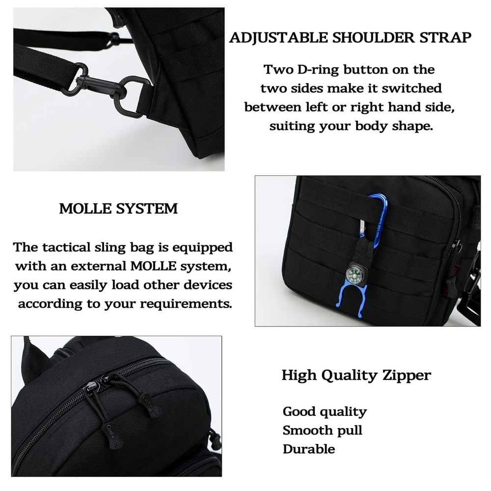 Lightweight One Strap Backpack sling backpack is ideal for everyday use, especially if you ride a bike to work. They're also well-suited to hiking and camping trips. Unisex black sling backpack bag can be used as chest bag, sling bag, travel bag, cross body backpack, shoulder backpack, casual daypack, sling pack bag,backpack. If you´d like to hike, or climb, you can carry our lightweight sling backpack. This sling bag can hold all your belongings and stuff. Construct weight :0.4kg / 0.88 lb dimensions: 11 x 8.7 x 4 inches/28*22*10cm (l x w x h). material:oxford nylon material color:Black /Tan/Green/ACU A Great Gift durable and sturdy, water-resistant black sling backpack is ideal for hiking, cycling, walking, hunting, camping, travel, work. Compact Size: size 11''H X 8.7''LX 4'' W; the max length of the adjustable shoulder strap is 37.5inches. High quality material: Made of upgraded 600D Military Nylon durable material and high quality buckles.Water-resistant and durable. Double zippers closure, padded heavy duty handle and sturdy stitching, adjustable strap.It is perfect for your daily use. 4 Ways Carrying Style: Multi-function and practical comfortable design for four ways using as shoulder bag, chest bag, back side backpack and hand carry bag. Zipper closure on shoulder strap,The sling pack can transform into a backpack. MOLLE SYSTEM: The tactical sling bag is equipped with an external MOLLE system, you can easily load other devices according to your requirements,such as;Sunglasses,flashlight,Carabiner,Keychains, GPS devices, digital cameras, medical supplies, small tools.Suitable for hiking, fishing, hiking, tourism, horse riding, running, cycling, walking, camping, mountaineering, cycling and other sports activities. Suit for Any Occasions: Great for both indoor and outdoor use including hiking, hunting, fishing, camping, motorcycling, biking, small gear bag, small tool Bag, range bag etc. You can take it as small everyday carry diaper bag, small military rover shoulder side backpack, small snacks bag, small tool bag.