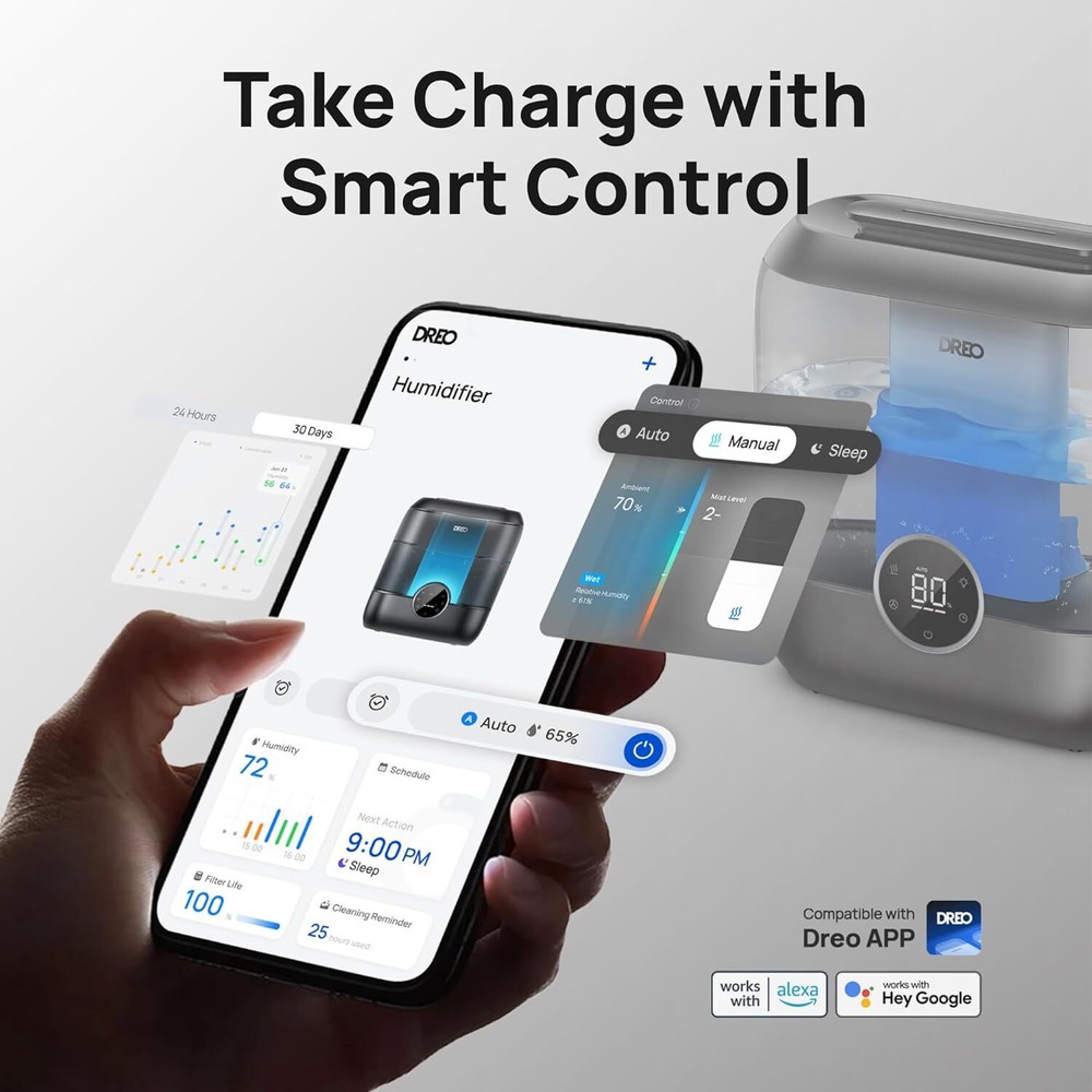 Product Description Smart Humidifiers for Bedroom, 6L Top Fill Supersized Cool Mist Humidifier for Large Room, 60 Hour Runtime, Quiet Ultrasonic Humidifiers for Plants, Baby, Indoor, Home, Night Light, Black Precise humidity, clearly displayed: Set your ideal comfort level, and the next-gen sensor takes control. Auto mode adjusts your air humidifier for balanced air, while the app lets you customize lighting based on humidity. Humidity control, wherever you are: Use the DREO app, voice commands, or Alexa to remotely manage your cool mist humidifiers, Easily monitor indoor humidity and adjust settings to ensure a healthy environment for your family, especially suited for babies, plants, and pets. No more dry days: With dual inlets and a 4-inch wide nozzle, the large room humidifier blasts out a cool, 40-inch high ultrafine mist that's only 5 μm. Cranking out 300 ml/hour, it conquers dryness in rooms up to 500 sq ft, all while keeping furniture moisture-free. No more constant refilling: Featuring a massive 6L water tank, this humidifier for bedroom can provide continuous humidification for up to 60 hours in sleep mode(App control). Its top-fill design simplifies refills, ensuring easy uninterrupted comfort. Peaceful sleep, assured: Whispering at just 28 dB, this baby humidifier ensures a restful night, effortlessly easing you into dreams. Add your favorite essential oils for a touch of spa and choose your calming light setting(or turn it off). One device, endless comfort. About Us We are a reputable seller with many years of experience selling on eBay. Our goal is to provide high-quality products and excellent customer service. Shipping Items will be shipped within 1-3 business days when we received payment. (Orders are not processed on weekends & holidays) Tracking information will be sent once item is shipped. Delivery time depends on destination and other factors Item is shipped to ebay address. Leaving correct address can minimize delay. For international shipping and shipping to Guam, Hawaii and Alaska, Please contact us before placing the order. International buyers please note: Import duties, taxes and charges are not included in the item price or shipping charges. These charges are buyer’s responsibility. We will try our best to reduce the risk of the custom duties. Local pick-up is unavailable at the moment. Contact Us We reply any email messages within 1 business / working days(off-duty at weekend). If you do not get a response from us, then please check your junk or spam mailbox. Our Business hours: Mon-Fri 9:00-18:00, UTC/GMT +8 hours. Please contact us either by clicking "contact seller" in the "purchase history" section or simply click "ask a question" at the bottom of this page. If you are unsatisfied with our item or service, please contact us before leaving any feedback. We are committed to resolve all issues in a friendly and satisfactory manner.