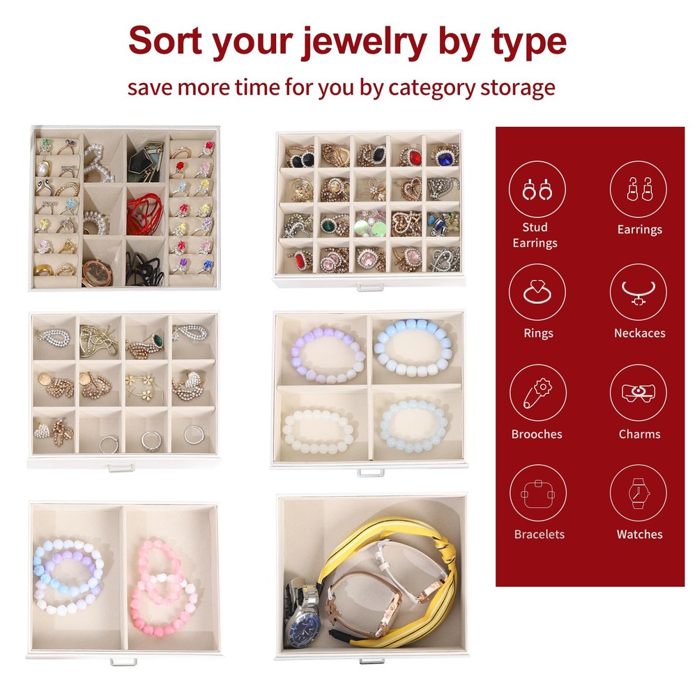 Multi-functional Jewelry Holder Organizer: The first layer on jewelry box with satisfy all your daily makeup needs. It with 6 earrings grids for stud earrings,brooches, Christmas charms. And it has 14 ring lines for ring holder, and 1 big mirror. Long Necklace Organizer: With excellent craftsmanship, this jewelry organizer will surprise you with its superior quality. With 16 necklace hooks on 2 jewelry organizer, you can hanging 16 necklaces in it. Makeup Organizer: The bottom drawer is really a huge drawer for your big stuffs, even for you cosmetics. With 5 drawers and 1 layer, you can take it as your makeup and jewelry box. All your daily storage needs will be take in it. Space and Time Saving for Makeup Table: With our 6 layer jewelry box, all your jewelry will be in good order and easy to reach. From then on, you have a bright dresser that saves space and makes your room look neater and more elegant. In addition, our jewelry travel boxes are designed to categorize your jewelry at a glance, shortening search time. Ideal Jewelry Gift Box : This PU leather jewelry box looks elegant and thoughtful. It is a perfect gifts for yourself, your friends, your wife or your mother for birthdays, Christmas, Valentine's Day, Mother's Day and anniversaries. This jewelry holder can be used not only as a girl's jewelry box, ring storage box, necklace storage box, earrings storage box, but also as a gift box for bracelets.