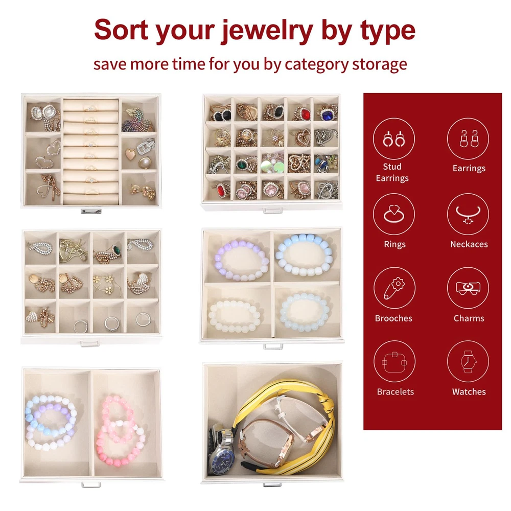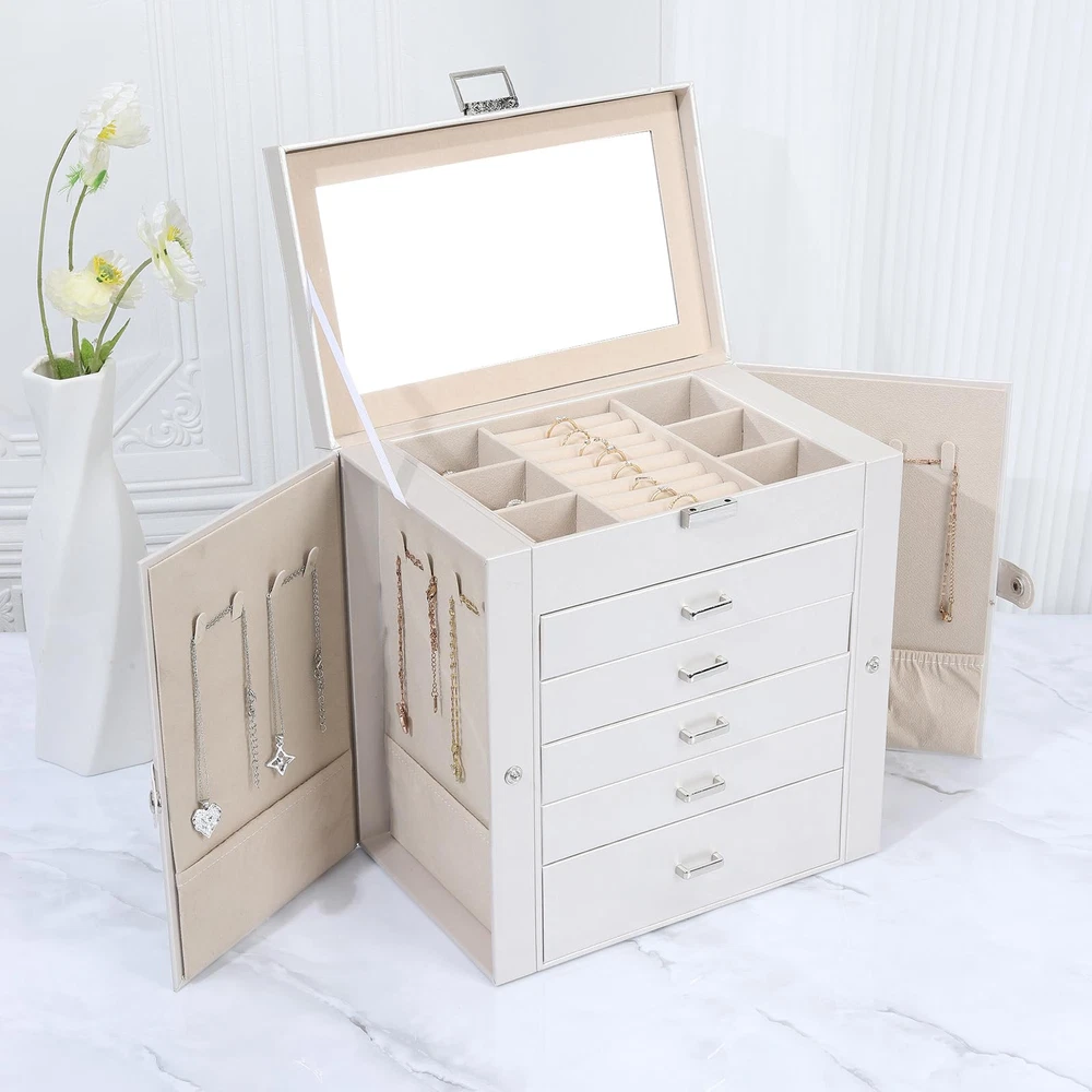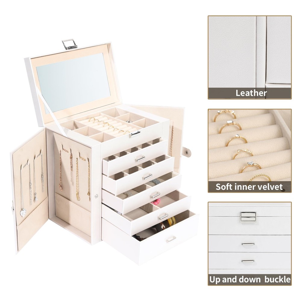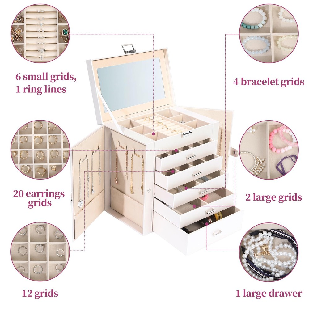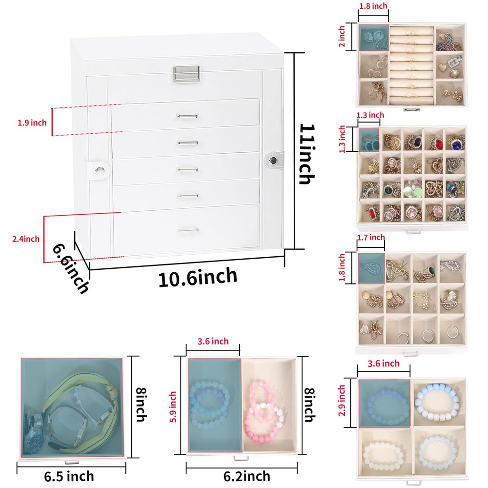 This is a high-capacity necklace, earrings, rings, bracelets, bracelets, watch jewelry collection box materials: the main body is MDF laminated PU leather, the interior is granular flannelette; appearance: 6 layers plus 5 drawers, there are two side doors (we call them double doors) on the left and right: A, the first floor has a mirror on top for makeup or earrings, and a row of sponge slots at the bottom for rings, the left and right sides have 6 grooves for various earrings or bracelets, etc. B, there are 5 layers of drawers below 36 large and small grooves suitable for storing earrings, pendants, bracelets, watches, hairpins, sunglasses, etc. . C, the left and right side of the door can hang 16 necklaces, elastic bands can also be used to hang many pendants Product parameters: Product name: double door & 6 drawers jewelry storage box, material: pu leather++ flannel, packing: 1 pack of desiccant/single PE bag/packing box, size: 10.6''*6.6''*11.02'' , Weight: 6.063 lbs UNIQUE DESIGN:Earring Jewelry Organizer boasts a unique , beautiful and a more convenient design than the other jewelry boxes out there. Our talented team of designers have worked hard to produce the perfect balance of modern ,sophistication, beauty and class to create this unique box with its gorgeous large mirror and attractive metal buckle. Unlike others our box possesses a magnetic snap that can be easily opened and closed with one hand for easy use. GIFT BOX & BLANK CARD - An elegant gift box and blank card is included with each Jewelry box for the most presentable gift giving. This makes a great gift for a mother, girlfriend , wife, daughter, colleague, friend or any other special woman in your life. This jewelry box for women is an ideal gift for Valentine's Day, Mother's Day, Thanksgiving, Christmas, birthdays and weddings. The high-grade jewelry storage containers is a good gift for women, girls, mothers, wives. If you have any questions about the product, click on the seller's name behind "sold by" at the bottom of the shopping cart, you can get help at any time. The large jewelry box includes earring boards, ring card slots, watch pillows and large drawers for glasses storage. Watches, necklaces, earrings, brooches, hair accessories, sunglasses, etc. can all be stored independently. Some partition boards can be moved and disassembled, and the flexible design allows you to adjust it according to your personal needs.