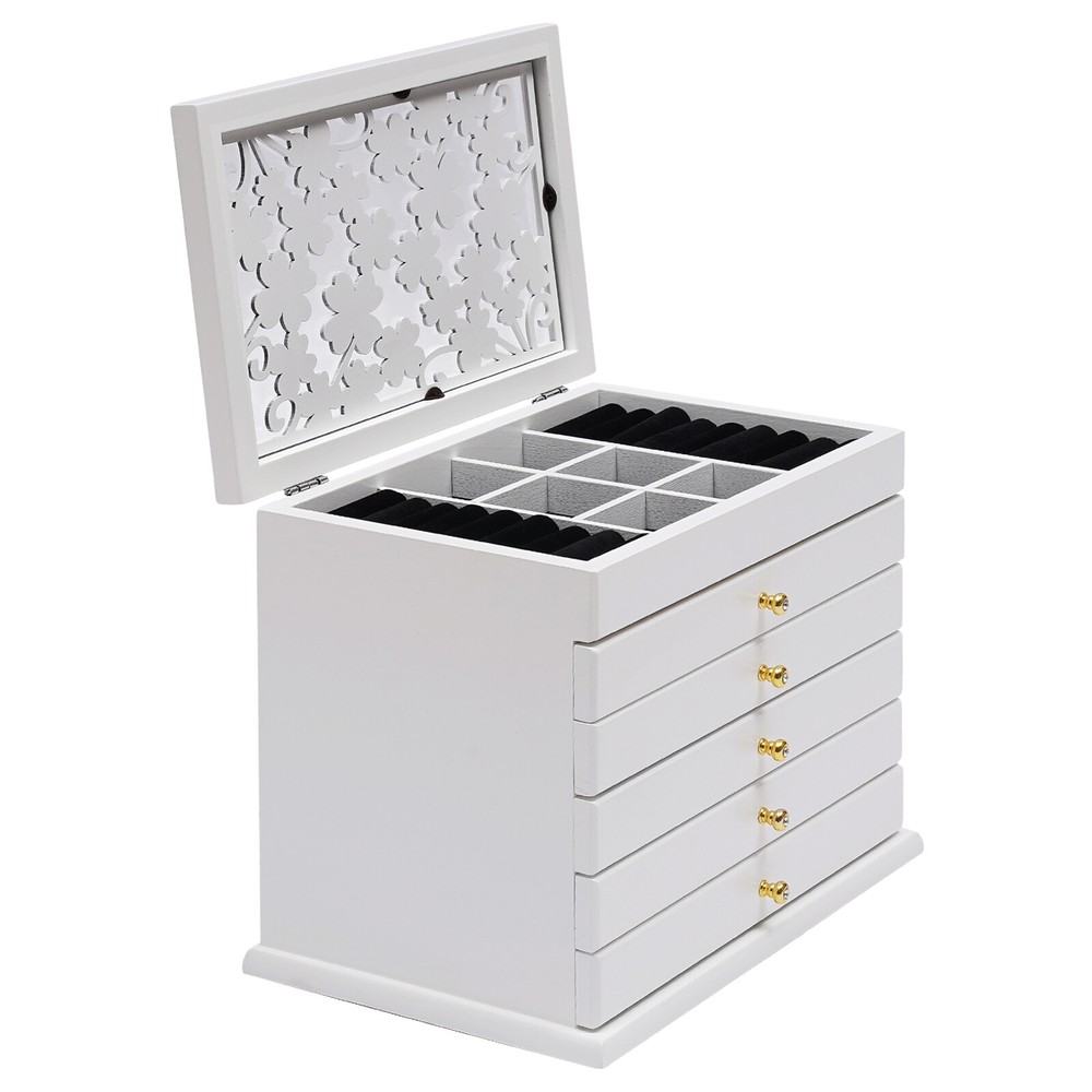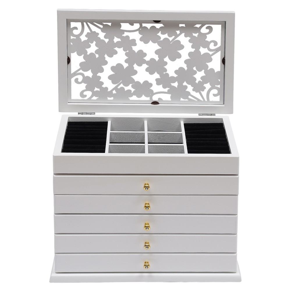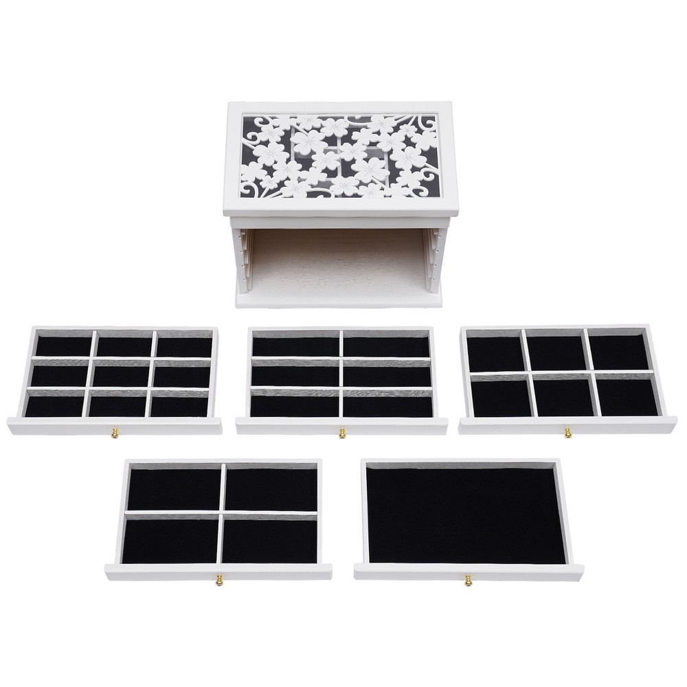 Description Are you still worried about losing your jewelry? Do you have too much jewelry without a big enough storage box? If you answered yes to these questions, then you should not miss this six-layer jewelry box. The six-layer storage design allows you to store many different kinds and sizes of jewelry. Its smooth lines and unique carvings reveal a delicate elegance. It will be a unique organizer for all your beautiful jewelry. Key Features Full Pull-out Drawer: The drawer of this jewelry box is a full pull-out design, which can display all the jewelry and make it more convenient for you to get it. Freely Assembled: All these drawers are removable. You can reassemble each layer according to your needs and habits. Large Capacity: This large size(11.6x7.3x6.9 in) jewelry box has si welcome to our store! Description Are You Still Worried About Losing Your Jewelry? Do You Have Too Much Jewelry Without a Big Enough Storage Box? If You Answered Yes to These Questions, Then You Should Not Miss This Six-layer Jewelry Box. the Six-layer Storage Design Allows You to Store Many Different Kinds and Sizes of Jewelry. Its Smooth Lines and Unique Carvings Reveal a Delicate Elegance. It Will Be a Unique Organizer for All Your Beautiful Jewelry. Key Features Full Pull-out Drawer: the Drawer of This Jewelry Box Is a Full Pull-out Design, Which Can Display All the Jewelry and Make It More Convenient for You to Get It. Freely Assembled: All These Drawers Are Removable. You Can Reassemble Each Layer According to Your Needs and Habits. Large Capacity : This Large Size(11.6x7.3x6.9 in) Jewelry Box Has Six Tiers to Provide Sufficient Storage Space for Your Jewelry. Great Organizer : This Jewelry Box Will Keep All Your Jewelry Well Organized, Neatly Displayed and Safely Stored. It Also Protects Your Jewelry Well from Dust, Scratches and Damage. Strong and Durable: This Jewelry Box Is Made of High-quality Paulownia Wood, Which Is Durable and Environmentally Friendly. the Surface Has a Painted Finish to Make It Waterproof and Long-lasting. Vintage Design: the Lid of This Jewelry Box Features a Three-dimensional Carved Design. the White Plum Blossom Carving Gives This Jewelry Box an Elegant and Chic Look. An Ideal Gift: This Rustic Wooden Jewelry Box Is the Idea Gift for a Mum, Wife, Daughter, or Girlfriend and It Will Be the Most Practical and Memorable Gift They Have Ever Received. Reasonable Layout: Each Level Is Divided into Compartments of Different Sizes for Better Display of Your Jewelry and Easy Access, so You Can Store Different Types or Sizes of Jewelry Separately. Also, the First Layer Comes with a Special Place for Rings and Earrings, Making Them More Securely Protected. Guaranteed After-sales Service: We Aim to Provide Quality Products and Services. If You Have Any Problems, Please Feel Free to Contact Us, We Will Reply and Solve the Problem for You As Soon As Possible. Details Quality Hinges: the Hinge Is Made from High-quality Hardware Which Is Strong and Durable. It Has Been Tested Many Times to Open and Close, so You Can Use It with Confidence. Sophisticated Handles : Each Drawer Has a Small and Delicate Handle, Which Is Not Only Easy to Pull out but Also Can Decorate the Jewelry Box. Velvet Fabric: the Lining of This Jewelry Box Is Made of Soft, High-quality Velvet Fabric That Is Comfortable to the Touch. It Can Protect Your Jewelry Well from Being Crushed and Scratched. Application It Is Suitable for Organizing Various Jewelry Including Sunglasses, Watches, Hairpins, Earrings, Rings, Bracelets, Watches and Necklaces. Specification Color: White Material: Paulownia Wood + Velvet Fabric + Hardware Shape: Rectangular Mounting Type: Freestanding Layer: 6 Layers Product Size: 31x20x24.5 Cm/12.2*7.9*9.6 Inch Packing Size: 36.5*27*33cm/14.37*10.62*12.99 in Gross Weight: 2.75 Kg/6.06 Lbs Net Weight: 2.2kg/4.85lbs Package Included 1 * Jewelry Box Notes Please Allow the Slight Color Difference Caused by the Shooting Light and 1-3cm Error Due to Manual Measurement, and Make Sure You Do Not Mind Before Ordering. Payment Delivery details Terms of sales About us Contact us Payment We accept ebay payment 。 Fees such as import duties, taxes are not included in the item price or shipping costs. These charges are the buyer's responsibility. Delivery details Shipping: 2-9 working days to: USA Terms of sales We maintain high standards of excellence and strive for hundred percent customer satisfaction. Feedback is very important to us. We hope that you contact us immediately before you give neutral or negative feedback, so that we can address your concerns. It is impossible to address issues if we do not know about them! About us Your satis faction is our ultimate goal. We work hard to earn your trust and future business. Our certified technicians have tested each item before shipping. The unit comes with 1 year limited warranty on all manufacturing defects. a) If you receive a defective item, you may return it or ask for a discount. Please contact us within 14 days after you receive the package. b) What you returned must be intact and in its original packaging as re? u. Customer is responsible for shipping costs of the returned item. c) We will cover the cost of shipping back t with the shipping rate indicated in the registration page. We will send you a new unit or refund the full payment you paid. Thank you. Contact us Business Hour Business Hour: Monday To Friday: 8:30 AM to 5:00 PM (Beijing China time) Due to time zones, our reply to your questions may not be immediately. But within above working time, we will reply your email within 24 hours. If it's non-workdays, please kindly be patient and wait till Monday. Please contact us with ebay message. Please feel free to contact us if you have any questions. Monday To Friday: 8:30 AM to 5:00 PM (Beijing China time) Due to time zones, our reply to your questions may not be immediately. But within above working time, we will reply your email within 24 hours. If i