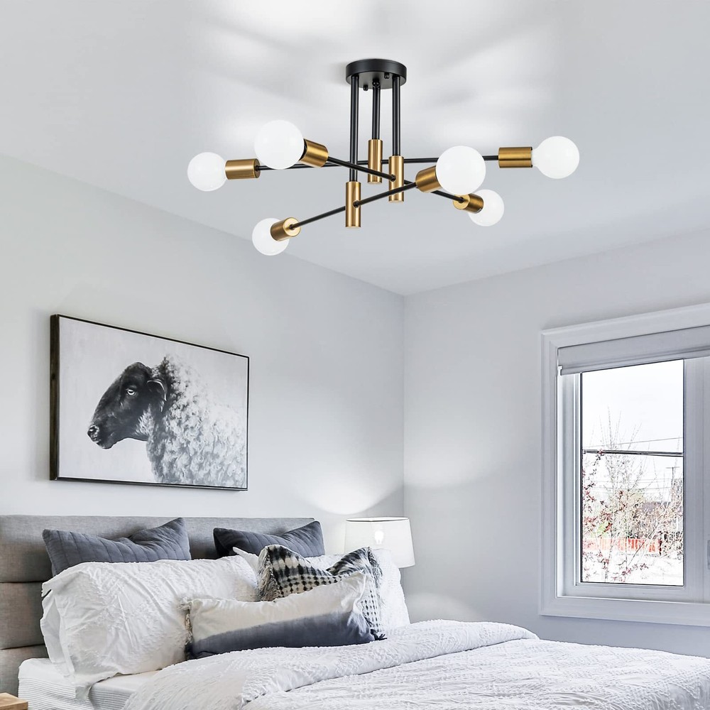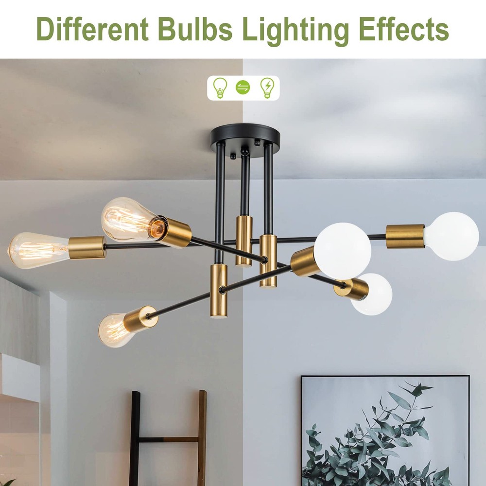 【MODERN DESIGN】- The ceiling light fixture is made of high-quality metal, strong and durable. Chandelier's arms are black, the interface and E26 base is gold, adopts advanced electroplating technology, antiseptic and anti-rust. Contrasting colors and geometry create a fashion feel for your room. 【Specification】- Arms length 24.41 inches/62cm, ceiling light height 11 inches/28cm, ceiling plate diameter 5.91 inches/15cm. The rod can be rotated 180 degrees horizontally, and you can find the shape you like by adjusting the direction of the light arm. 【Bulb Requirement 】- E26 Base, compatible with LED, CFL, halogen or incandescent (Maximum 60W, Bulbs Excluded). This semi flush mount chandelier is dimmable if you using dimmable switch and bulbs. 【Easy to Install 】- The arm of the sputnik light fixture has been pre-wired, and there is no need to wire inside the light, including all installation hardware, which can be installed quickly and easily (detailed installation instructions are attached). 【Wide Application】- The collision of modern luxury and retro texture, This pendant lighting will perfectly embellish your home living room, bar, coffee , dining room, kitchen island, bedroom, corridor, entrance passage, Foyer, Etc. 【After-Sale 】- Rustic chandelier comes with a 1-year on parts and professional & technical support. Please feel free to us if you have any problem.
