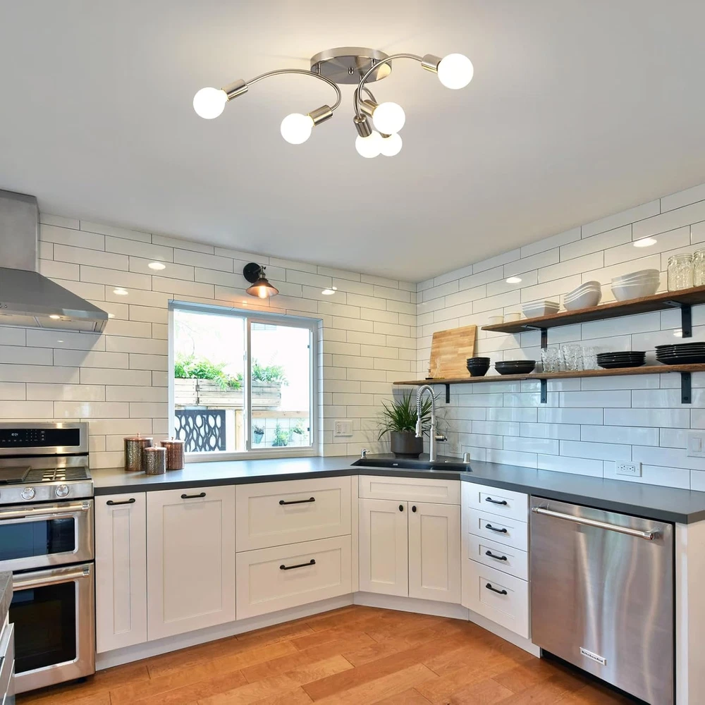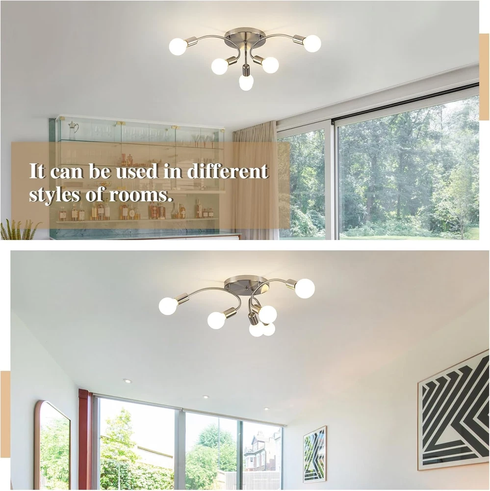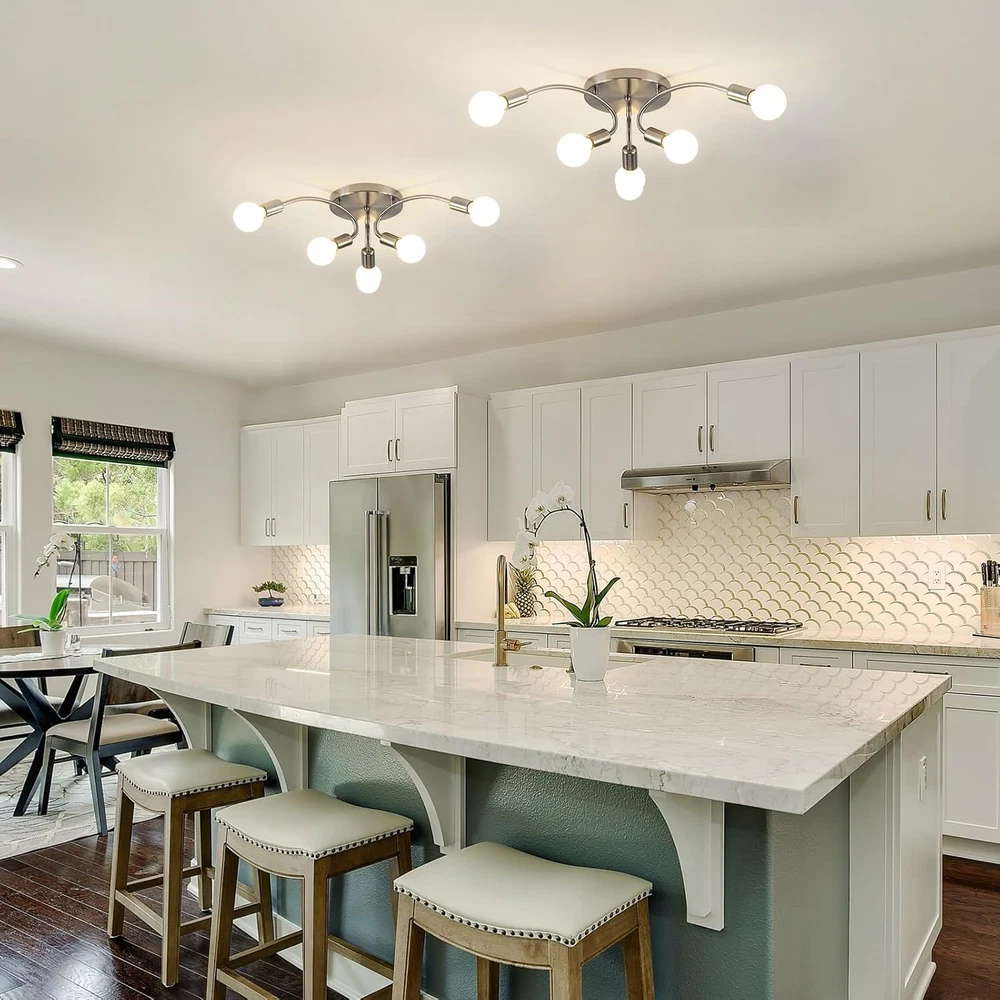Store New Arrivals Add to Favorite View Feedback Contact 6-Lights Brushed Nickel Sputnik Chandelier Lighting, Modern Semi Flush Mount Ceiling Light Fixture, Metal Industrial Ceiling Lamp for Living Room Farmhouse Kitchen Bedroom (Brushed Nickel) Description Item model number Brushed Nickel Kitchen Light Fixtures Light Source Type Halogen, LED, Fluorescent, Incandescent Style Modern, Rustic, Classic, Farmhouse, Contemporary, Mid-Century Number of Items 1 Power Source ac Fixture Type Brushed Nickel Modern Chandelier, Ceiling Light Fixture, Kitchen Lamps for Ceiling Number of Light Sources 6 Control Method Touch Warranty Type 2-year warranty Theme kitchen lights Batteries Included? No Lighting Method Downlight Maximum Compatible Wattage 60 Watts Controller Type Push Button Unit Count 1.0 Count Room Type Kitchen, Bedroom, Living Room, Dining Room, Entryway, Hallway, Farmhouse Assembly Required Yes Product Dimensions 26"L x 8.7"W x 7.3"H Material Metal, Iron Installation Type Flush Mount Model Name Sputnik Chandeliers-002-S Finish Type Brushed Specific Uses For Product Industrial Ceiling Light, Semi Flush Light Fixture, Hanging Light Fixtures Bulb Features Cold White/Natural White/Warm White Indoor/Outdoor Usage Indoor Bulb Base E26 Country of Origin China Water Resistance Level Not Water Resistant Batteries Required? No Item Weight 1 pounds Light fixture form Ceiling Special Features Portable, Adjustable Color Temperature, Industrial Ceiling Light Special Feature Portable, Adjustable Color Temperature, Industrial Ceiling Light Part Number GDD-02 Shade Color Brushed Nickel Mounting Type Ceiling Mount Color Brushed Nickel Wattage 60 watts Shape Round Voltage 120 Volts Shade Material Metal Finish types Brushed Included Components 1 * Instruction Book, 1 * Mounting Accessories Set, 1 * Flush Mount Ceiling Light Switch Type Dimmer MINIMALIST 6-LIGHT BLACK LIGHT FIXTURE DESIGN - Brushed nickel kitchen light fixtures has open design and Industrial style, simple and elegant, creating a comfortable and modern ambiance to your house. Different light effects when you choose different bulbs. The silver light fixtures is perfect for your home lighting and decoration, not only suitable for mid century style but also modern home family. MARKET CERTIFICATION-QUALITY & DURABILITY - The brushed nickel kitchen lighting comply with market standard. Equipped with sturdy die-cast metal, you do not have to worry about aging, bent or color fading problems. Vintage style industrial ceiling light is made of high quality metal baking paint. The modern brushed nickel kitchen ceiling lights can long-lasting use. Save you the trouble of frequent . BLACK CHANDELIER BULB REQUIREMENTS- This ceiling lights for kitchen requires 6 x E26 base bulb (Max 60W) such as LED, CFL, incandescent, and halogen (BULBS ARE NOT INCLUDED). The kitchen lights ceiling also compatible with dimmer switch (not included), you can use a dimmable bulb to meet various lighting requirements and create different ambience. CLOSET LIGHT FIXTURES WIDE APPLICATION - Can be used as modern ceiling light fixture and black ceiling light. The elegant hanging light fixtures can be used as lighting for kitchen ceiling, hallway light fixtures, entryway light fixture, farmhouse ceiling light, bedroom lights for ceiling, modern chandeliers for dining room, lights for living room. It brightens and decorates your house. CUSTOMER SATISFACTION - Your satisfaction is always our goal to pursue. If you have any questions about this small chandeliers ceiling light or have any trouble when install this light fixtures ceiling mount, please feel free to , we will solve your problem within 24 hours. Product Description Different effects when you choose different bulbs. 6-Lights Semi Flush Mount Ceiling Modern ceiling light fixture has open design and Industrial style, simple and elegant, creating a comfortable and modern ambiance to your house. Modern Industrial Design Ceiling Light Different light effects when you choose different bulbs. The sputnik light fixture is perfect for your home lighting and decoration. Best Light Fixture for Your Family Gorgeous brightness and charming lights bring warmth to your home. It is also a good decorative piece while providing lighting. The socket is compatible with 6 x E26 bulbs (Max 60W, BULB NOT INCLUDED! ). Dimmable bulbs and dimmer switch (not included) can be used to meet your various lighting requirements and adapt to different ambience. Modern Sputnik Chandelier 6-Lights Semi Flush Mount Ceiling Light Fixtures with E26 Base Voltage: 110-130V; Frequency: 60W MAX. Light bulb: 6 * E26 (NOT including light bulb) Fully dimmable when using dimmable bulbs and a compatible dimmer switch. Perfect for Farmhouse, Hallway, Dining Room, kitchen, Restaurant, Bar, Garage. Different light effects when you choose different bulbs. ABEAJAT Light Fixtures for Bedroom Living Room Kitchen Farmhouse Hallway Add to Cart Add to Cart Add to Cart Add to Cart Add to Cart Add to Cart Customer Reviews 4.3 out of 5 stars 14 4.6 out of 5 stars 381 4.3 out of 5 stars 58 4.6 out of 5 stars 164 4.6 out of 5 stars 164 4.1 out of 5 stars 32 4.6 out of 5 stars 35 Price $42.99 $ 42 . 99 $44.99 $ 44 . 99 $39.99 $ 39 . 99 $48.99 $ 48 . 99 $54.99 $ 54 . 99 — $39.99 $ 39 . 99 Bulb Base E26 E26 E26 E26 E26 G9 E26 Voltage 110-130V 110-130V 110-130V 110-130V 110-130V 110-130V 110-130V Wattage 60 60 60 60 60 60 60 Number of Light Sources 6 3 1 3 3 2 3 Color Brushed Nickel Black Wood Gold Black White White & Gold Power Source ac ac ac ac ac ac ac Material Metal Metal, Iron Wood Rattan, Metal Rattan, Metal Glass, Metal Metal, Iron Indoor/Outdoor Usage Indoor Indoor Indoor Indoor Indoor Indoor Indoor Specific Uses Home Decor Home Decor Home Decor Home Decor Home Decor Home Decor Home Decor Room Type Living Room, Kitchen, Hallway Living Room, Kitchen, Hallway Living Room, Kitchen, Hallway Living Room, Kitchen, Hallway Living Room, Kitchen, Hallway Living Room, Kitchen, Hallway Livi