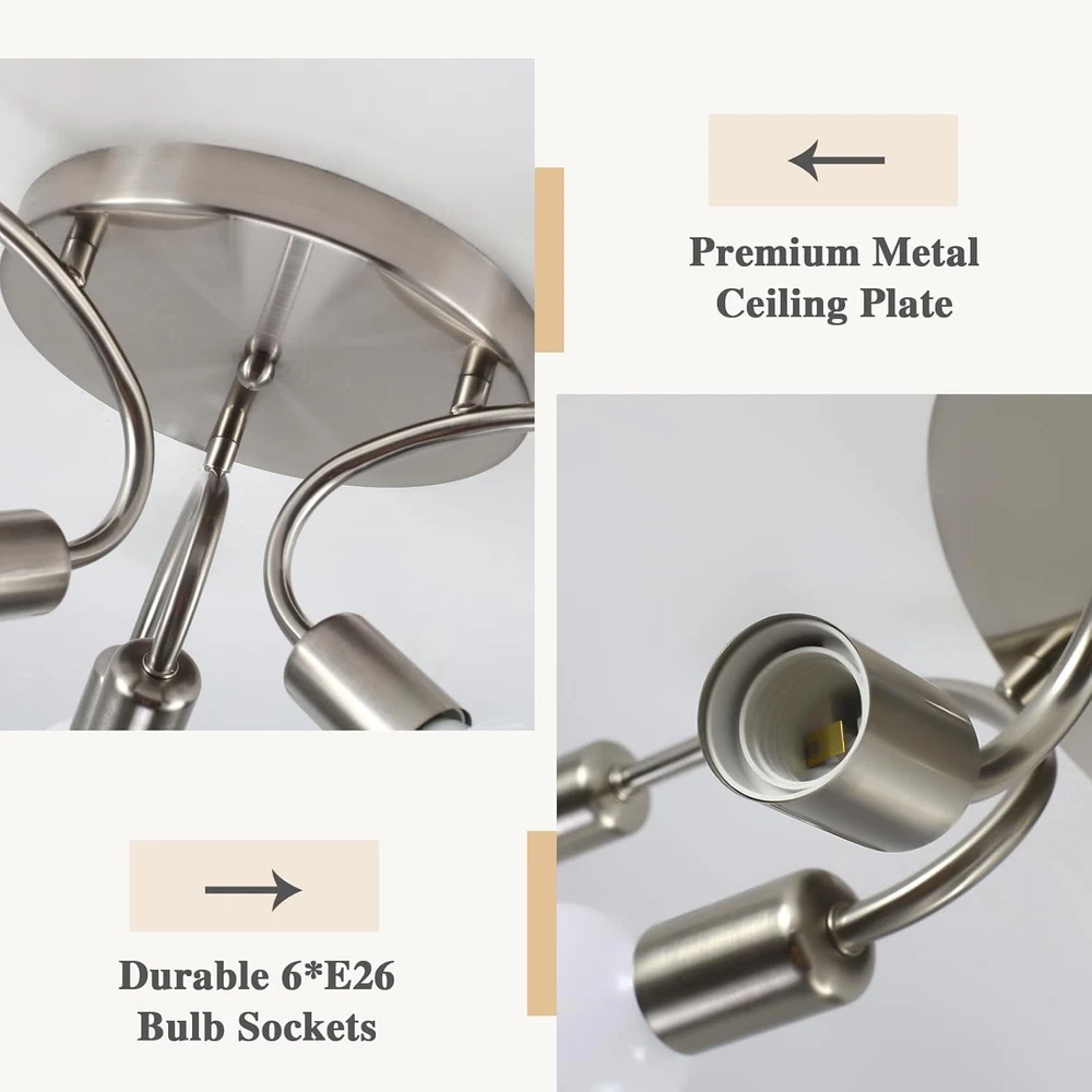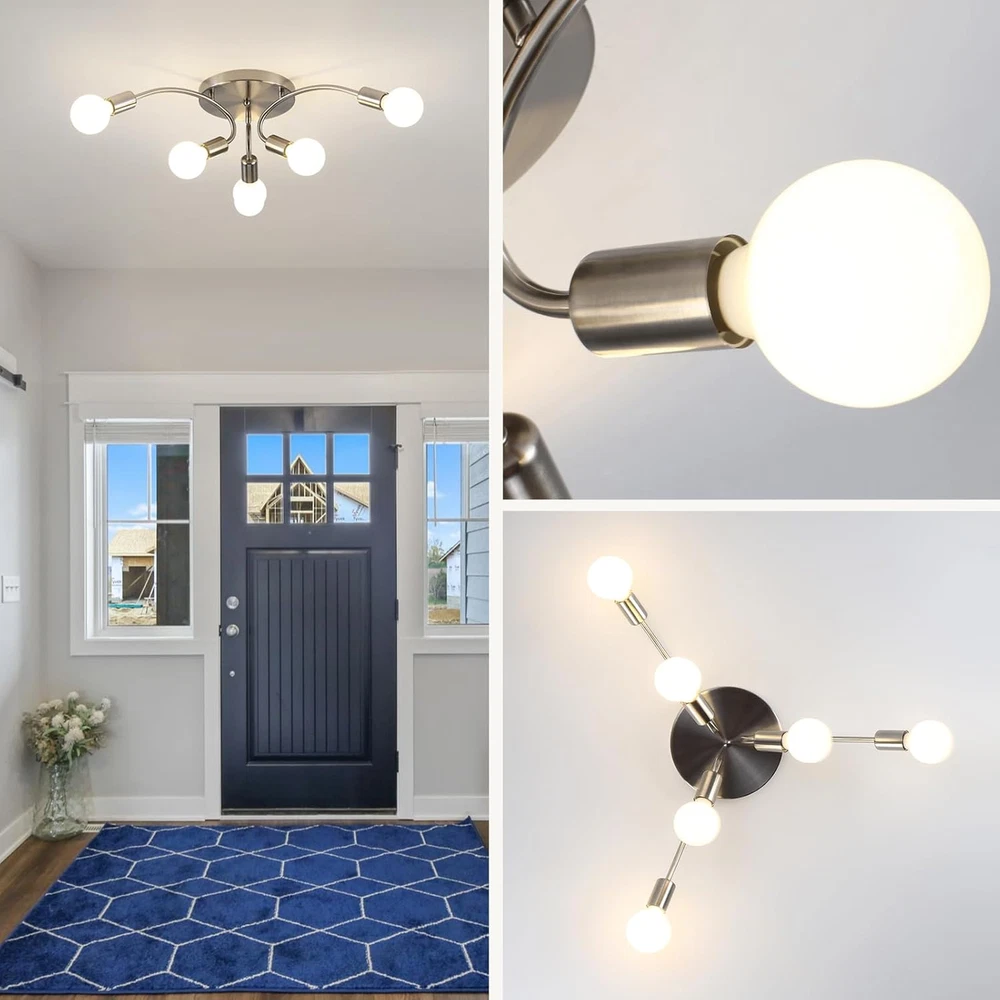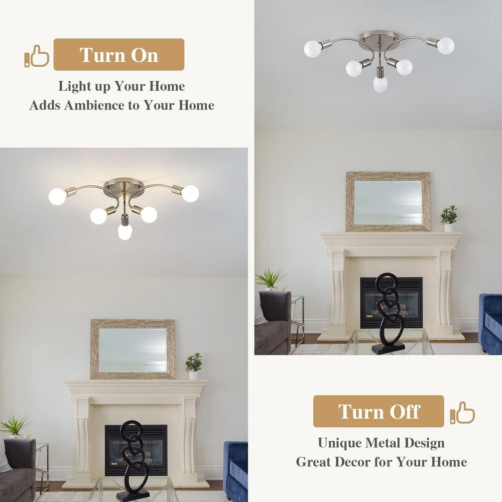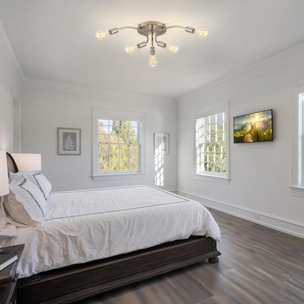 Store New Arrivals Add to Favorite View Feedback Contact 6-Lights Brushed Nickel Sputnik Chandelier Lighting, Modern Semi Flush Mount Ceiling Light Fixture, Metal Industrial Ceiling Lamp for Living Room Farmhouse Kitchen Bedroom (Brushed Nickel) Description Item model number Brushed Nickel Kitchen Light Fixtures Light Source Type Halogen, LED, Fluorescent, Incandescent Style Modern, Rustic, Classic, Farmhouse, Contemporary, Mid-Century Number of Items 1 Power Source ac Fixture Type Brushed Nickel Modern Chandelier, Ceiling Light Fixture, Kitchen Lamps for Ceiling Number of Light Sources 6 Control Method Touch Warranty Type 2-year warranty Theme kitchen lights Batteries Included? No Lighting Method Downlight Maximum Compatible Wattage 60 Watts Controller Type Push Button Unit Count 1.0 Count Room Type Kitchen, Bedroom, Living Room, Dining Room, Entryway, Hallway, Farmhouse Assembly Required Yes Product Dimensions 26"L x 8.7"W x 7.3"H Material Metal, Iron Installation Type Flush Mount Model Name Sputnik Chandeliers-002-S Finish Type Brushed Specific Uses For Product Industrial Ceiling Light, Semi Flush Light Fixture, Hanging Light Fixtures Bulb Features Cold White/Natural White/Warm White Indoor/Outdoor Usage Indoor Bulb Base E26 Country of Origin China Water Resistance Level Not Water Resistant Batteries Required? No Item Weight 1 pounds Light fixture form Ceiling Special Features Portable, Adjustable Color Temperature, Industrial Ceiling Light Special Feature Portable, Adjustable Color Temperature, Industrial Ceiling Light Part Number GDD-02 Shade Color Brushed Nickel Mounting Type Ceiling Mount Color Brushed Nickel Wattage 60 watts Shape Round Voltage 120 Volts Shade Material Metal Finish types Brushed Included Components 1 * Instruction Book, 1 * Mounting Accessories Set, 1 * Flush Mount Ceiling Light Switch Type Dimmer MINIMALIST 6-LIGHT BLACK LIGHT FIXTURE DESIGN - Brushed nickel kitchen light fixtures has open design and Industrial style, simple and elegant, creating a comfortable and modern ambiance to your house. Different light effects when you choose different bulbs. The silver light fixtures is perfect for your home lighting and decoration, not only suitable for mid century style but also modern home family. MARKET CERTIFICATION-QUALITY & DURABILITY - The brushed nickel kitchen lighting comply with market standard. Equipped with sturdy die-cast metal, you do not have to worry about aging, bent or color fading problems. Vintage style industrial ceiling light is made of high quality metal baking paint. The modern brushed nickel kitchen ceiling lights can long-lasting use. Save you the trouble of frequent . BLACK CHANDELIER BULB REQUIREMENTS- This ceiling lights for kitchen requires 6 x E26 base bulb (Max 60W) such as LED, CFL, incandescent, and halogen (BULBS ARE NOT INCLUDED). The kitchen lights ceiling also compatible with dimmer switch (not included), you can use a dimmable bulb to meet various lighting requirements and create different ambience. CLOSET LIGHT FIXTURES WIDE APPLICATION - Can be used as modern ceiling light fixture and black ceiling light. The elegant hanging light fixtures can be used as lighting for kitchen ceiling, hallway light fixtures, entryway light fixture, farmhouse ceiling light, bedroom lights for ceiling, modern chandeliers for dining room, lights for living room. It brightens and decorates your house. CUSTOMER SATISFACTION - Your satisfaction is always our goal to pursue. If you have any questions about this small chandeliers ceiling light or have any trouble when install this light fixtures ceiling mount, please feel free to , we will solve your problem within 24 hours. Product Description Different effects when you choose different bulbs. 6-Lights Semi Flush Mount Ceiling Modern ceiling light fixture has open design and Industrial style, simple and elegant, creating a comfortable and modern ambiance to your house. Modern Industrial Design Ceiling Light Different light effects when you choose different bulbs. The sputnik light fixture is perfect for your home lighting and decoration. Best Light Fixture for Your Family Gorgeous brightness and charming lights bring warmth to your home. It is also a good decorative piece while providing lighting. The socket is compatible with 6 x E26 bulbs (Max 60W, BULB NOT INCLUDED! ). Dimmable bulbs and dimmer switch (not included) can be used to meet your various lighting requirements and adapt to different ambience. Modern Sputnik Chandelier 6-Lights Semi Flush Mount Ceiling Light Fixtures with E26 Base Voltage: 110-130V; Frequency: 60W MAX. Light bulb: 6 * E26 (NOT including light bulb) Fully dimmable when using dimmable bulbs and a compatible dimmer switch. Perfect for Farmhouse, Hallway, Dining Room, kitchen, Restaurant, Bar, Garage. Different light effects when you choose different bulbs. ABEAJAT Light Fixtures for Bedroom Living Room Kitchen Farmhouse Hallway Add to Cart Add to Cart Add to Cart Add to Cart Add to Cart Add to Cart Customer Reviews 4.3 out of 5 stars 14 4.6 out of 5 stars 381 4.3 out of 5 stars 58 4.6 out of 5 stars 164 4.6 out of 5 stars 164 4.1 out of 5 stars 32 4.6 out of 5 stars 35 Price $42.99 $ 42 . 99 $44.99 $ 44 . 99 $39.99 $ 39 . 99 $48.99 $ 48 . 99 $54.99 $ 54 . 99 — $39.99 $ 39 . 99 Bulb Base E26 E26 E26 E26 E26 G9 E26 Voltage 110-130V 110-130V 110-130V 110-130V 110-130V 110-130V 110-130V Wattage 60 60 60 60 60 60 60 Number of Light Sources 6 3 1 3 3 2 3 Color Brushed Nickel Black Wood Gold Black White White & Gold Power Source ac ac ac ac ac ac ac Material Metal Metal, Iron Wood Rattan, Metal Rattan, Metal Glass, Metal Metal, Iron Indoor/Outdoor Usage Indoor Indoor Indoor Indoor Indoor Indoor Indoor Specific Uses Home Decor Home Decor Home Decor Home Decor Home Decor Home Decor Home Decor Room Type Living Room, Kitchen, Hallway Living Room, Kitchen, Hallway Living Room, Kitchen, Hallway Living Room, Kitchen, Hallway Living Room, Kitchen, Hallway Living Room, Kitchen, Hallway Livi