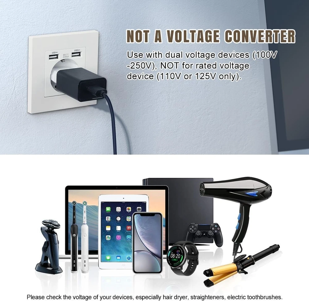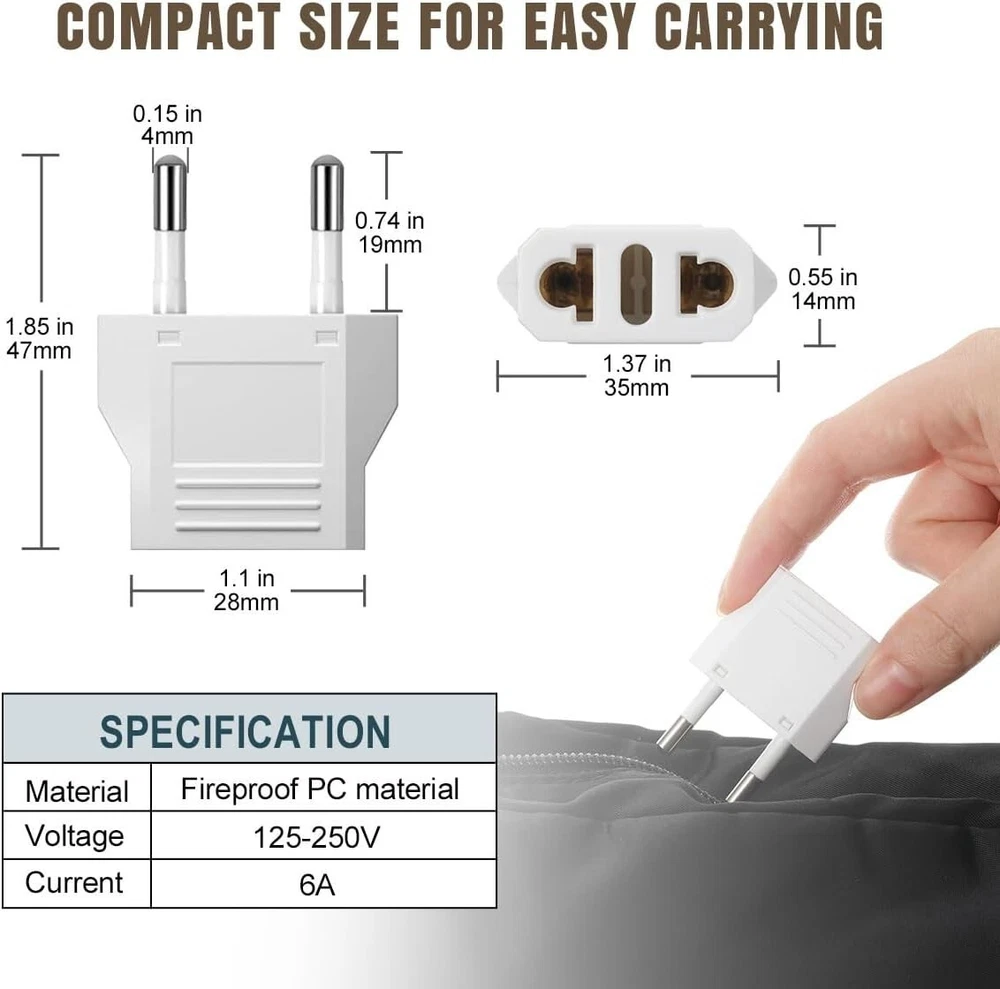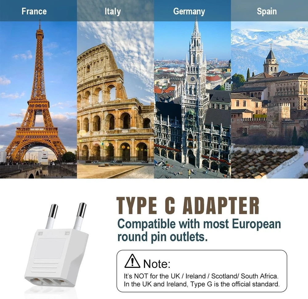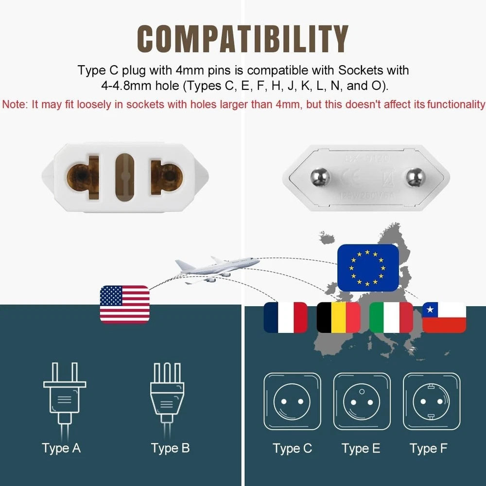 6 Packs US to Europe Plug Adapter, Type C Travel Adapter, Fireproof Portable European Power Converter Plug for USA to EU Italy France Germany Spain Maldives Color White Input Voltage 250 Volts Plug Format Type C Total Power Outlets 1 About this item SAFE & RELIABLE: The US to EU plug adapter is made of flame-retardant PC material and pure copper conductor, supporting a voltage range of 125V-250V and a current of 6A. EUROPEAN TRAVEL PLUG ADAPTER: The type C plug adapter is compatible with most EU countries, such as Germany, Italy, France, Spain, Austria, Belgium, Croatia, and so on. (Not for use in the UK/Ireland/Scotland/South Africa.) EASY TO CARRY: These compact and lightweight adapters help save space in your suitcase, making them a must-have for your travels. With no surge protection and no power cords, they are perfect for cruise ship tours. NOT A VOLTAGE CONVERTER: The European plug adapter can ONLY be used with dual voltage devices (100V-250V). If your devices are rated for 110V or 125V only (hair dryer/straightener/toothbrush), you will need a converter. MULTI-PURPOSE: The package contains 6 x US to Europe plug adapters. These small electric adapters can be used to charge your Bluetooth speaker, headphones, shaver, and laptop, etc. Essential items to carry when you travel abroad.