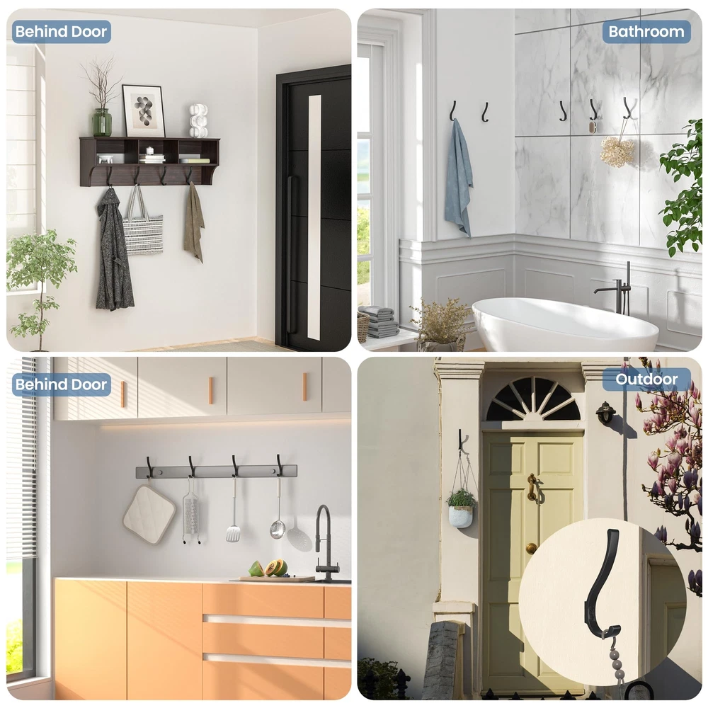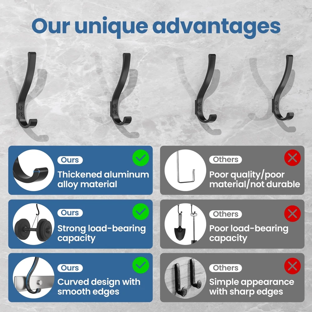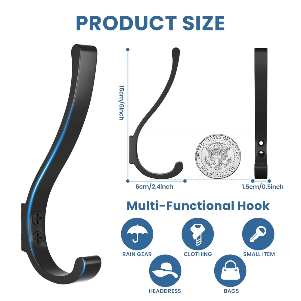 Quality upgrade: Black Coat Hooks, We use upgraded material space aluminum, no deformation, no bending, with anti-corrosion and anti-rust function, sturdy and durable Size: The Wall mounted hook dimension is 6*2.4 *0.5 inches. The minimalist style matches perfectly with most modern home styles, is beautiful and stylish, and makes your home more distinctive Wide Application: Wall Hooks for Hanging - Keep your space organized. These large coat hooks are designed to securely hold coats, scarves, umbrellas, towels, bags, cupstowels, backpacks, hats, dog leashes and more SIMPLE DESIGN: These wall coat hooks are made of space aluminum material, durable and can support heavy objects. Give your home or office a new look with these practical and stylish wall hooks. The sleek black finish adds a touch of elegance to any wall or entry way. RELIABLE SERVICE: Coat Hooks - If you have any questions about our wall hooks, please feel free to contact us, we will deal with you at the first time.
